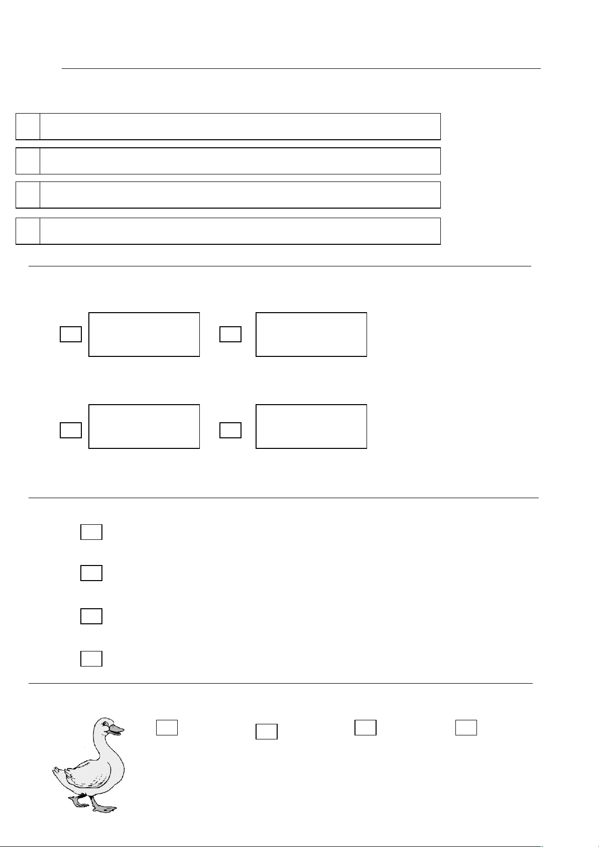 AVALIAÇÃO DIAGNÓSTICA_AGOSTO/14 – 1º ANO Nome: 1) Marque um X no alfabeto que está na ordem correta: A-B-C-K-L-D-E-F-G-H-I-J M-N-O-P-Q-R-S-T-U-V-W-X-Z. A-B-C-D-E-F-G-H-I-J-K-L-M-N-O-P-Q-R-S-T-U-V-W-X-Y-Z. A-B-C-D-E-F-G-H-I-J-K-LP-Q-R-S-T-M-N-O-U-V-W-X-Z. A- G-H-B-C-D-E-F-I-J-K-L-M-N-O-P-Q-R-S-T-U-V-W-X-Z. 2) Marque um X onde aparece apenas letras. ? ; . ! : + - x % $ 216890 CANETA 3) Marque um X onde está escrito a letra F quatro vezes: F f t l f F f F F L F f F f t f 4) Marque um X no quadradinho onde está escrito corretamente o nome do desenho. POTA PATO OTPA TPAO 5) Marque um X no quadradinho que mostra quantas sílabas tem a palavra : B O N E C A 4 3 2 5 6) Marque um X no quadradinho que mostra a palavra que rima com o desenho: pato mola ralo fogo 7) Observe a parlenda e responda: MEIO DIA MACACA SOFIA PANELA NO FOGO BARRIGA VAZIA Quantas palavras têm a parlenda? 6 9 8 7 8) Marque com um X no quadradinho onde está escrito o nome da figura: Avião melão Pião mão 9) Observe o desenho e responda qual é a frase que indica o que a vaca está fazendo: A vaca berra. A vaca deita. A vaca come mato. A vaca está dando leite. 10) Leia o texto com a ajuda da professora: Por que o Cascão disse isto? Porque ele tem medo de sabão. Porque ele não gosta de tomar banho. Porque ele contou uma piada. Porque ele fez cara de medo. 11) Observe a imagem: Em que festa o casal pretende ir? _________________________ Festa de Carnaval. Festa de Natal. Festa Junina. Festa de Páscoa. 12) Escreva o nome do desenho: E. E. F. Francisco Roque de Almeida image30.png image4.png image40.png image5.png image6.png image60.png image7.png image70.png image1.png image10.png image2.png image3.png
