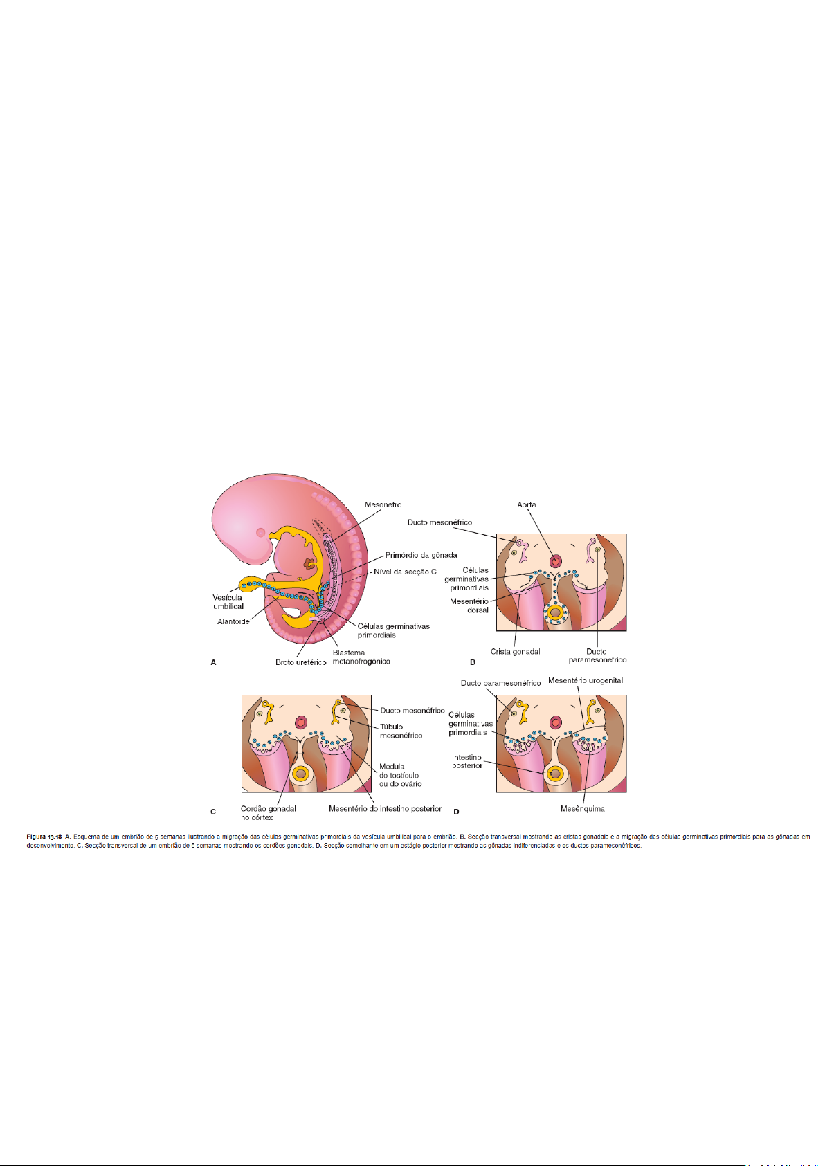 S15P1 – SISTEMA REPRODUTOR FEMININO EMBRIOLOGIA DO SISTEMA REPRODUTOR FEMININO 1. O Estado Indiferente: A Base Bipotencial (Até a 7ª Semana) Inicialmente, todos os embriões, independentemente do sexo gené�co (46,XX ou 46,XY), desenvolvem um sistema reprodutor idên�co e indiferenciado. Este é o estado indiferente. • Gônadas Indiferenciadas: As gônadas se desenvolvem a par�r de três fontes: 1. Mesoderma Intermediário: Forma as cristas gonadais na parede posterior do abdome. 2. Epitélio Celômico: Que recobre as cristas gonadais, prolifera e forma os cordões sexuais primários. 3. Células Germina�vas Primordiais (CGP): Migram do saco vitelino para as cristas gonadais por volta da 6ª semana. São os precursores dos ovócitos. • Ductos Genitais Indiferenciados: Dois pares de ductos estão presentes: 1. Ductos Mesonéfricos (de Wolff): São os ductos do sistema mesonéfrico (rim primi�vo). Em um embrião 46,XY, serão es�mulados a formar os ductos do sistema reprodutor masculino. 2. Ductos Paramesonéfricos (de Müller): Desenvolvem-se lateralmente aos ductos de Wolff a par�r de uma invaginação do epitélio celômico. Estes são os precursores fundamentais do sistema reprodutor feminino interno. 2. Diferenciação Gonadal: A Formação do Ovário A diferenciação do ovário é um processo mais tardio do que a do tes�culo. Enquanto o tes�culo começa a se diferenciar por volta da 7ª semana, o ovário só se torna histologicamente reconhecível por volta da 10ª semana. • Ausência do Fator Determinante do Tes�culo (TDF): Em embriões 46,XX, o gene SRY no cromossomo Y está ausente. Sem o SRY e, consequentemente, sem a produção de TDF, a gônada indiferenciada segue o caminho padrão de diferenciação ovariana. • Formação dos Cordões Cor�cais: O epitélio celômico da gônada feminina con�nua a proliferar, formando uma segunda leva de cordões epiteliais, os cordões cor�cais, que penetram no mesênquima subjacente, mas permanecem próximos à super�cie (córtex). • Incorporação das Células Germina�vas: As CGP incorporam-se aos cordões cor�cais. Elas se diferenciam em ovogônias e iniciam intensas mitoses, aumentando seu número. • Início da Meiose e Formação dos Folículos: Por volta da 16ª-20ª semana, as ovogônias param de se dividir por mitose e entram na prófase da primeira divisão meió�ca, tornando-se oócitos primários. Simultaneamente, os cordões cor�cais se fragmentam, isolando grupos de células foliculares (derivadas do epitélio celômico) que envolvem cada oócito primário, formando os folículos primordiais. Este é o evento definidor do ovário. É crucial notar que todos os oócitos primários de uma mulher são formados durante a vida fetal e permanecem em prófase meió�ca até a ovulação, décadas depois. 3. Diferenciação dos Ductos: O Desenvolvimento das Tubas, Útero e Vagina O des�no dos ductos pares (de Müller e de Wolff) é determinado pela presença ou ausência de hormônios tes�culares. • Regressão dos Ductos de Wolff: Na ausência de testosterona (produzida pelas células de Leydig do tes�culo fetal), os ductos mesonéfricos (de Wolff) regridem. Seus remanescentes podem persis�r como estruturas ves�giais, como o ducto de Gartner ao lado da vagina e do útero. • Desenvolvimento dos Ductos de Müller: Na ausência da Substância Inibidora Mülleriana (MIS ou AMH), produzida pelas células de Sertoli do tes�culo fetal, os ductos paramesonéfricos (de Müller) desenvolvem-se plenamente. Este desenvolvimento ocorre da seguinte forma: 1. Fusão Craniocaudal: As porções craniais dos ductos de Müller, que não se fusionam, desenvolvem-se nas tubas uterinas (trompas de Falópio). Suas extremidades abrem-se na cavidade celômica, formando as �mbrias. 2. Fusão Medial: As porções caudais dos dois ductos de Müller se aproximam na linha média, fundem-se e dão origem a um único ducto, o cordão uterovaginal. 3. Formação do Útero: O cordão uterovaginal se canaliza para formar a luz do útero e do canal vaginal. A parede muscular espessa do útero (miométrio) e o tecido conjun�vo (perimétrio) derivam do mesênquima circundante. 4. Formação da Vagina: A origem da vagina é um pouco mais complexa e envolve uma contribuição dupla: Seio Urogenital: Uma evaginação do seio urogenital, chamada de broto vaginal, forma a maior parte da luz e do epitélio vaginal. Cordão Uterovaginal: A fusão dos ductos de Müller contribui para a formação do útero e da porção superior da vagina. A membrana que inicialmente separa o broto vaginal do cordão uterovaginal se rompe, estabelecendo a comunicação. o O himen é um remanescente da membrana que separava o seio urogenital do cordão uterovaginal. 4. Diferenciação da Genitália Externa Assim como os ductos, a genitália externa passa por um estágio indiferente antes de se diferenciar. • Estágio Indiferente (8ª semana): Composto pelo tubérculo genital, pregas urogenitais e proeminências labioescrotais. • Diferenciação Feminina (a par�r da 12ª semana): Na ausência de di-hidrotestosterona (DHT), que é um metabólito da testosterona, ocorre o seguinte: o O tubérculo genital cresce moderadamente e forma o clitóris. o As pregas urogenitais não se fusionam na linha média e formam os pequenos lábios. o As proeminências labioescrotais não se fusionam e formam os grandes lábios. Elas também se fundem posteriormente para formar a comissura posterior. o O seio urogenital (a parte do seio urogenital não envolvida na formação da vagina) permanece aberto e forma o ves�bulo vaginal, onde desembocam a uretra e a vagina. 5. Anomalias Congênitas e Correlações Clínicas • Agenesia Mülleriana (Síndrome de Mayer-Rokitansky-Küster-Hauser - MRKH): Falha no desenvolvimento dos ductos de Müller. Resulta na ausência congênita do útero e do terço superior da vagina, embora os ovários e as car