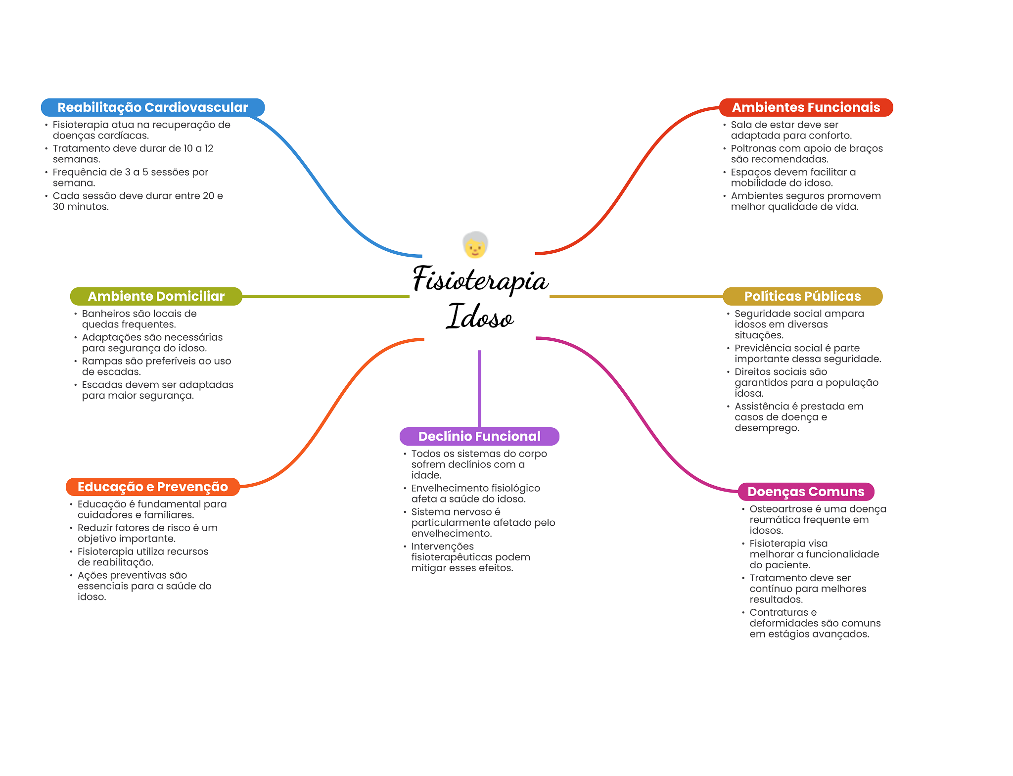 Reabilitação Cardiovascular Ambientes Funcionais Fisioterapia atua na recuperação de Sala de estar deve ser doenças cardíacas. adaptada para conforto. Tratamento deve durar de 10 a 12 Poltronas com apoio de braços semanas. são recomendadas. Frequência de 3 a 5 sessões por Espaços devem facilitar a semana. mobilidade do idoso. Cada sessão deve durar entre 20 e Ambientes seguros promovem 30 minutos. melhor qualidade de vida. Fisioterapia Ambiente Domiciliar Políticas Públicas Banheiros são locais de quedas frequentes. Idoso Seguridade social ampara idosos em diversas Adaptações são necessárias situações. para segurança do idoso. Previdência social é parte Rampas são preferíveis ao uso importante dessa seguridade. de escadas. Direitos sociais são Escadas devem ser adaptadas garantidos para a população para maior segurança. idosa. Assistência é prestada em casos de doença e desemprego. Declínio Funcional Todos OS sistemas do corpo sofrem declínios com a idade. Educação e Prevenção Envelhecimento fisiológico afeta a saúde do idoso. Doenças Comuns Educação é fundamental para cuidadores e familiares. Sistema nervoso é Osteoartrose é uma doença Reduzir fatores de risco é um particularmente afetado pelo reumática frequente em envelhecimento. idosos. objetivo importante. Intervenções Fisioterapia visa Fisioterapia utiliza recursos fisioterapêuticas podem melhorar a funcionalidade de reabilitação. mitigar esses efeitos. do paciente. Ações preventivas são Tratamento deve ser essenciais para a saúde do contínuo para melhores idoso. resultados. Contraturas e deformidades são comuns em estágios avançados.