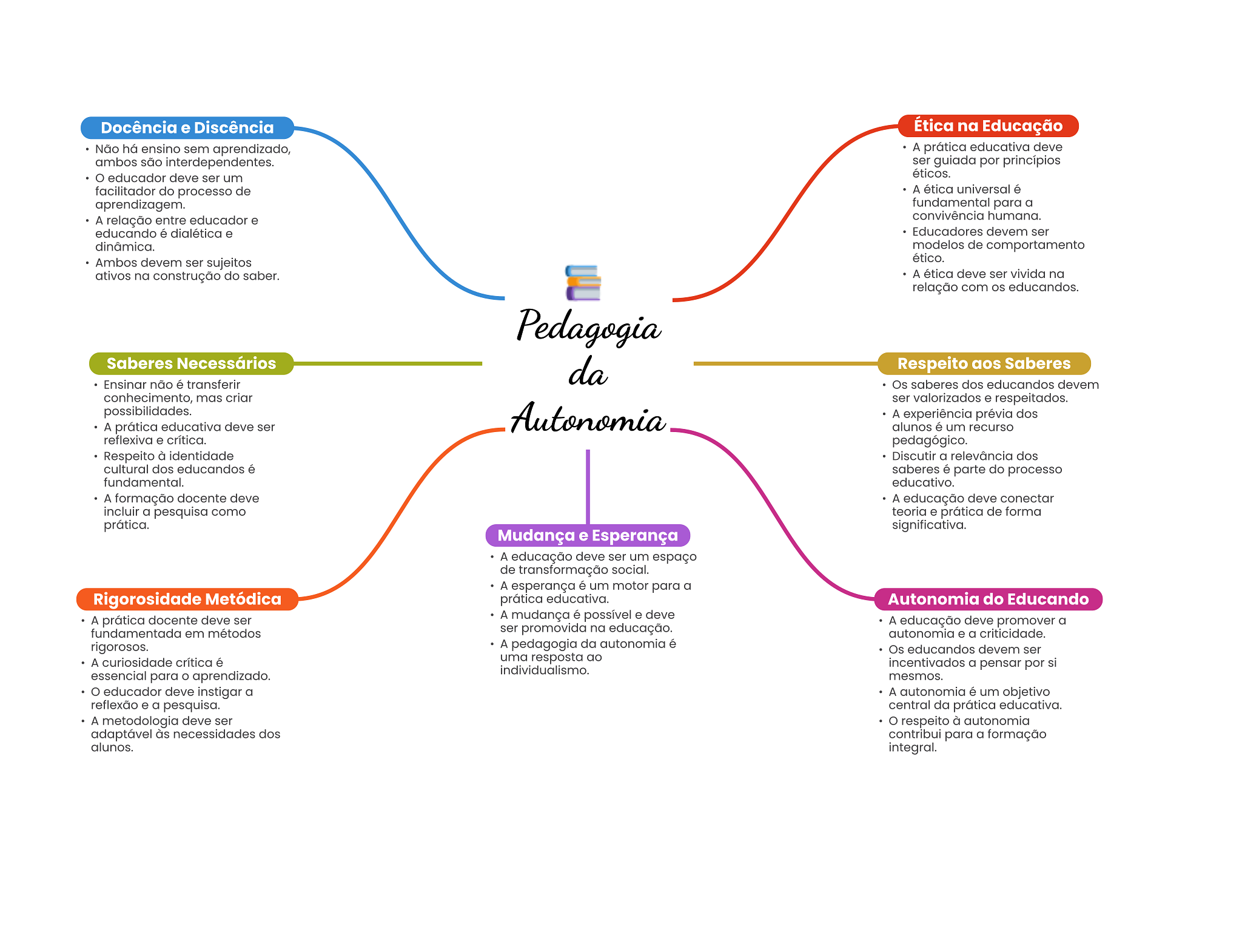 Docência e Discência Ética na Educação Não há ensino sem aprendizado, A prática educativa deve ambos são interdependentes. ser guiada por princípios educador deve ser um éticos. facilitador do processo de A ética universal é aprendizagem. fundamental para a A relação entre educador e convivência humana. educando é dialética e Educadores devem ser dinâmica. modelos de comportamento Ambos devem ser sujeitos ético. ativos na construção do saber. A ética deve ser vivida na relação com educandos. Pedagogia Saberes Necessários da Respeito aos Saberes Ensinar não é transferir Os saberes dos educandos devem conhecimento, mas criar ser valorizados e respeitados. possibilidades. A prática educativa deve ser Autonomia A experiência prévia dos alunos é um recurso reflexiva e pedagógico. Respeito à identidade Discutir a relevância dos cultural dos educandos é saberes é parte do processo fundamental. educativo. A formação docente deve A educação deve conectar incluir a pesquisa como teoria e prática de forma prática. significativa. Mudança e Esperança A educação deve ser um espaço de transformação social. A esperança é um motor para a Rigorosidade Metódica prática educativa. Autonomia do Educando A prática docente deve ser A mudança é possível e deve A educação deve promover a fundamentada em métodos ser promovida na educação. autonomia e a criticidade. rigorosos. A pedagogia da autonomia é Os educandos devem ser A curiosidade crítica é uma resposta ao individualismo. incentivados a pensar por si essencial para aprendizado. mesmos. O educador deve instigar a A autonomia é um objetivo reflexão e a pesquisa. central da prática educativa. A metodologia deve ser respeito à autonomia adaptável às necessidades dos contribui para a formação alunos. integral.