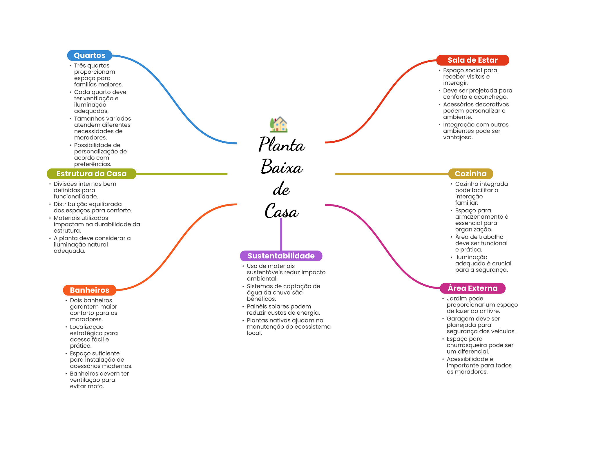 Quartos Sala de Estar Três quartos proporcionam Espaço social para espaço para receber visitas e famílias maiores. interagir. Cada quarto deve Deve ser projetada para ter ventilação e conforto e aconchego. iluminação Acessórios decorativos adequadas. podem personalizar Tamanhos variados ambiente. atendem diferentes Integração com outros necessidades de ambientes pode ser moradores. vantajosa. Possibilidade de Planta personalização de acordo com preferências. Baixa Estrutura da Casa Cozinha Divisões internas bem de Cozinha integrada definidas para pode facilitar a funcionalidade. interação Distribuição equilibrada familiar. dos espaços para conforto. Casa Espaço para Materiais utilizados armazenamento é impactam na durabilidade da essencial para estrutura. organização. A planta deve considerar a Área de trabalho iluminação natural deve ser funcional adequada. e prática. Sustentabilidade Uso de materiais adequada é crucial sustentáveis reduz impacto para a segurança. ambiental. Banheiros Sistemas de captação de Área Externa água da chuva são Dois banheiros benéficos. Jardim pode garantem maior Painéis solares podem proporcionar um espaço conforto para reduzir custos de energia. de lazer ao ar livre. moradores. Plantas nativas ajudam na Garagem deve ser Localização manutenção do ecossistema planejada para estratégica para local. segurança dos veículos. acesso fácil e Espaço para prático. churrasqueira pode ser Espaço suficiente um diferencial. para instalação de Acessibilidade é acessórios modernos. importante para todos Banheiros devem ter moradores. ventilação para evitar mofo.