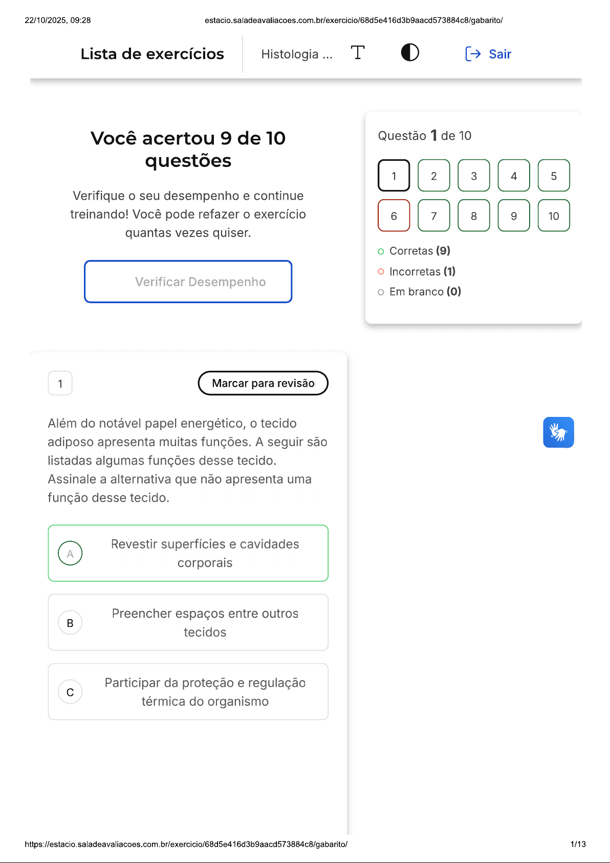 22/10/2025, 09:28 estacio.saladeavaliacoes.com.br/exercicio/68d5e416d3b9aacd573884c8/gabarito/ Lista de exercícios Histologia T Sair ... Você acertou 9 de 10 Questão 1 de 10 questões 1 2 3 4 5 Verifique seu desempenho e continue treinando! Você pode refazer exercício 6 7 8 9 10 quantas vezes quiser. Corretas (9) Incorretas (1) Verificar Desempenho Em branco (0) 1 Marcar para revisão Além do notável papel energético, tecido adiposo apresenta muitas funções. A seguir são listadas algumas funções desse tecido. Assinale a alternativa que não apresenta uma função desse tecido. Revestir superfícies e cavidades A corporais Preencher espaços entre outros tecidos Participar da proteção e regulação c térmica do organismo https://estacio.saladeavaliacoes.com.br/exercicio/68d5e416d3b9aacd573884c8/gabarito/ 1/1322/10/2025, 09:28 D Modelar a superfície corporal E Secretar hormônios Resposta correta Parabéns, você selecionou a alternativa correta. Confira gabarito comentado! Gabarito Comentado A alternativa correta afirma que tecido adiposo tem a função de revestir superfícies e cavidades corporais. Na verdade, essa é uma função do tecido epitelial, e não do tecido adiposo. O tecido adiposo é responsável por armazenar energia na forma de gordura, preencher espaços entre outros tecidos, participar da proteção e regulação térmica do organismo, modelar a superfície corporal e secretar hormônios. 2 Marcar para revisão Um aluno de graduação, ao microscópio de campo claro, observou a seguinte estrutura: epithelium-trachea-respiratory-1042870189 Sabendo que as fibras da lâmina basal estão coradas em azul, qual a classificação do 2/1322/10/2025, 09:28 epitélio apoiado sobre ela? A Epitélio estratificado de transição Epitélio pseudoestratificado c Epitélio simples colunar D Epitélio estratificado cilíndrico E Epitélio simples pavimentoso Resposta correta Parabéns, você selecionou a alternativa correta. Confira gabarito comentado! Gabarito Comentado A resposta certa é: Epitélio pseudoestratificado 3 Marcar para revisão As glândulas podem ser classificadas como endócrinas ou exócrinas. Sobre as glândulas endócrinas, é correto afirmar que: https://estacio.saladeavaliacoes.com.br/exercicio/68d5e416d3b9aacd573884c8/gabarito/ 3/1322/10/2025, 09:28 estacio.saladeavaliacoes.com.br/exercicio/68d5e416d3b9aacd573884c8/gabarito/ A preservação da comunicação com A epitélio originário se dá através de ductos. A organização celular se dá somente pela formação de vesículas ou folículos preenchidos com a substância a ser secretada. Apresentam uma porção secretora, formada pelas células responsáveis c pela secreção, e ductos secretores, que são responsáveis por transportar as substâncias secretadas. São glândulas especializadas somente D na secreção de complexos de carboidratos e proteínas. As substâncias secretadas são E liberadas na corrente sanguínea e transportadas até seu local de ação. Resposta correta Parabéns, você selecionou a alternativa correta. Confira gabarito comentado! Gabarito Comentado As glândulas endócrinas são responsáveis pela produção de hormônios, que são substâncias químicas que regulam diversas funções do organismo. Esses hormônios são liberados diretamente na corrente sanguínea e transportados até local onde irão atuar. Diferentemente das glândulas exócrinas, as endócrinas não possuem 4/1322/10/2025, 09:28 ductos para conduzir a substância secretada, pois a liberação ocorre diretamente no sangue. 4 Marcar para revisão tecido conjuntivo propriamente dito pode ser dividido em tecido frouxo e denso. Analise as afirmativas abaixo e assinale a alternativa correta a respeito do tecido conjuntivo dito frouxo. Apresenta predominância de células, A como fibroblastos e macrófagos e poucas fibras. Apresenta consistência flexível e altamente resistente a trações. É um tecido raro no organismo, pouco c vascularizado e inervado. Forma camadas ao redor dos vasos D sanguíneos e dá suporte às células epiteliais. Pode ser encontrado na derme E profunda da pele e na submucosa do tubo digestivo. Resposta correta Parabéns, você selecionou a alternativa correta. Confira o gabarito comentado! 5/1322/10/2025, 09:28 estacio.saladeavaliacoes.com.br/exercicio/68d5e416d3b9aacd573884c8/gabarito/ Gabarito Comentado tecido conjuntivo frouxo é caracterizado por sua versatilidade e capacidade de preencher espaços. Ele forma camadas ao redor dos vasos sanguíneos, proporcionando suporte e nutrição para as células epiteliais. Essa característica é fundamental para a manutenção da integridade e funcionamento dos tecidos. 5 Marcar para revisão O tecido conjuntivo embrionário é dividido em tecido mucoide, presente no cordão umbilical, e mesênquima, no embrião. mesênquima é a origem dos tecidos conjuntivos e é formado pelas células mesenquimais. São características dessas células: São células que apresentam muita A coesão entre si. São células fusiformes com núcleo reduzido. São células que apresentam poucos c prolongamentos citoplasmáticos. Originam-se no endoderma, folheto D mais interno, de onde partem e penetram nos órgãos. Encontram-se imersas em uma matriz E viscosa com poucas fibras. htps://estacio.saladeavaliacoes.com.br/exercicio/68d5e416d3b9aacd573884c8/gabarito/ 6/1322/10/2025, 09:28 Resposta correta Parabéns, você selecionou a alternativa correta. Confira gabarito comentado! Gabarito Comentado As células mesenquimais, que formam mesênquima - a origem dos tecidos conjuntivos no embrião possuem como característica estar imersas em uma matriz viscosa com poucas fibras. Essa matriz viscosa proporciona um ambiente ideal para desenvolvimento e a diferenciação dessas células. 6 Marcar para revisão Os ácinos serosos e os túbulos mucosos representam unidades glandulares muito comuns no organismo e encontram-se presentes em vários órgãos. A res