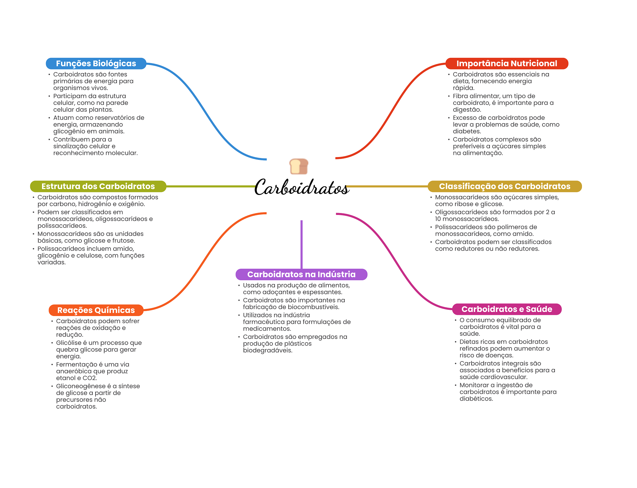 Funções Biológicas Importância Nutricional Carboidratos são fontes Carboidratos são essenciais na primárias de energia para dieta, fornecendo energia organismos vivos. rápida. Participam da estrutura Fibra alimentar, um tipo de celular, como na parede carboidrato, é importante para a celular das plantas. digestão. Atuam como reservatórios de Excesso de carboidratos pode energia, armazenando levar a problemas de saúde, como glicogênio em animais. diabetes. Contribuem para a Carboidratos complexos são sinalização celular e preferíveis a açúcares simples reconhecimento molecular. na alimentação. Estrutura dos Carboidratos Carboidratos Classificação dos Carboidratos Carboidratos são compostos formados são açúcares simples, por carbono, hidrogênio e oxigênio. como ribose e glicose. Podem ser classificados em Oligossacarídeos são formados por 2 a oligossacarídeos e 10 monossacarídeos. polissacarídeos. Polissacarídeos são polímeros de Monossacarídeos são as unidades como amido. básicas, como glicose e frutose. Carboidratos podem ser classificados Polissacarídeos incluem amido, como redutores ou não redutores. glicogênio e celulose, com funções variadas. Carboidratos na Indústria Usados na produção de alimentos, como adoçantes e espessantes. Carboidratos são importantes na Reações Químicas fabricação de biocombustíveis. Carboidratos e Saúde Utilizados na indústria Carboidratos podem sofrer farmacêutica para formulações de consumo equilibrado de reações de oxidação e medicamentos. carboidratos é vital para a redução. saúde. Carboidratos são empregados na Glicólise é um processo que produção de plásticos Dietas ricas em carboidratos quebra glicose para gerar biodegradáveis. refinados podem aumentar energia. risco de doenças. Fermentação é uma via Carboidratos integrais são anaeróbica que produz associados a benefícios para a etanol e CO2. saúde cardiovascular. Gliconeogênese é a síntese Monitorar a ingestão de de glicose a partir de carboidratos é importante para precursores não diabéticos. carboidratos.