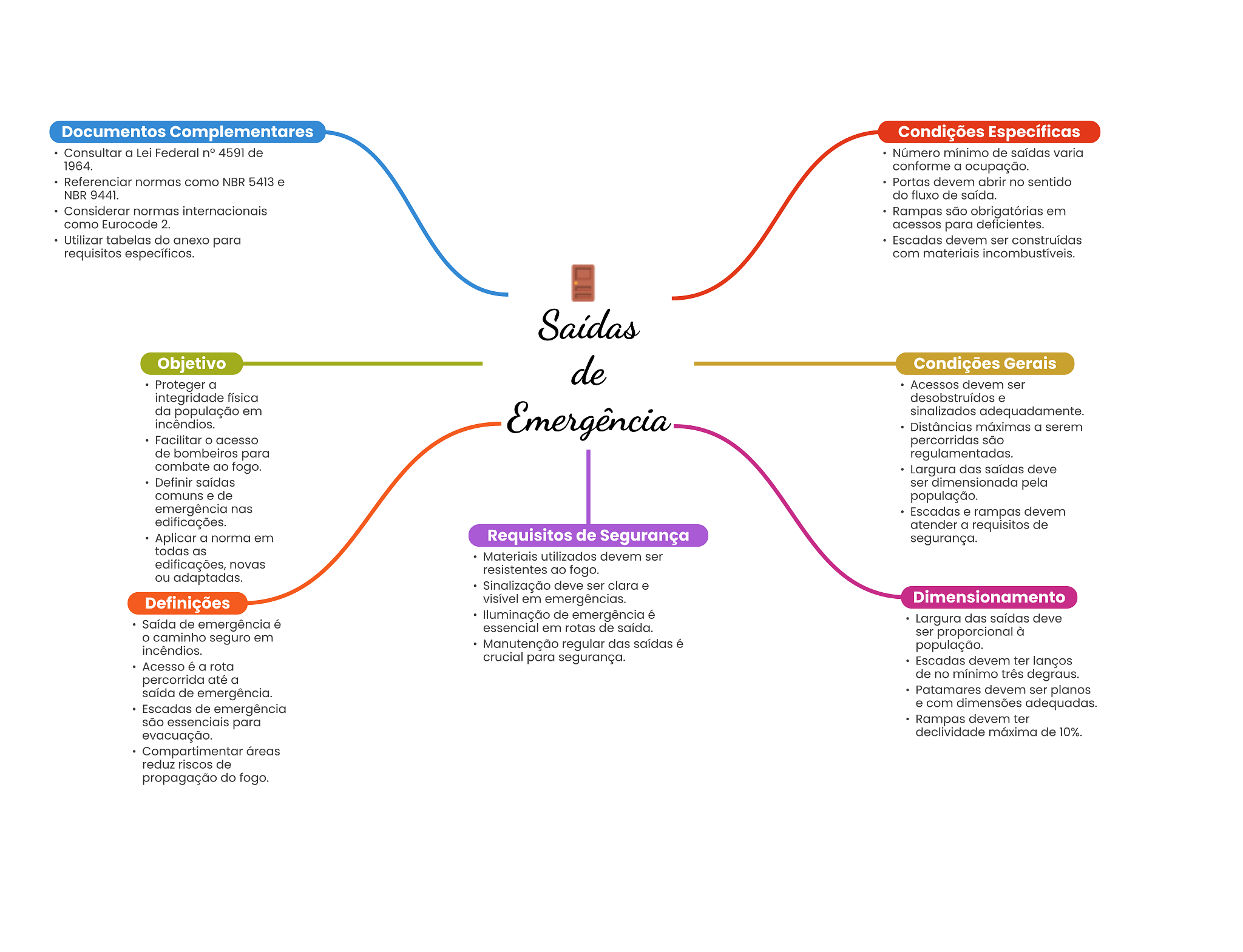Documentos Complementares Condições Específicas Consultar a Lei Federal n° 4591 de Número mínimo de saídas varia 1964. conforme a ocupação. Referenciar normas como NBR 5413 e Portas devem abrir no sentido NBR 9441. do fluxo de saída. Considerar normas internacionais Rampas são obrigatórias em como Eurocode 2. acessos para deficientes. Utilizar tabelas do anexo para Escadas devem ser construídas requisitos específicos. com materiais incombustíveis. Saídas Objetivo de Condições Gerais Proteger a Acessos devem ser integridade física desobstruídos e da população em Emergência sinalizados adequadamente. incêndios. Distâncias máximas a serem Facilitar acesso percorridas são de bombeiros para regulamentadas. combate ao fogo. Largura das saídas deve Definir saídas ser dimensionada pela comuns e de população. emergência nas Escadas e rampas devem edificações. atender a requisitos de Aplicar a norma em Requisitos de Segurança segurança. todas as Materiais utilizados devem ser edificações, novas resistentes ao fogo. ou adaptadas. Sinalização deve ser clara e Definições visível em emergências. Dimensionamento de emergência é Saída de emergência é Largura das saídas deve essencial em rotas de saída. caminho seguro em ser proporcional à incêndios. Manutenção regular das saídas é população. crucial para segurança. Acesso é a rota Escadas devem ter lanços percorrida até a de no mínimo três degraus. saída de emergência. Patamares devem ser planos Escadas de emergência e com dimensões adequadas. são essenciais para Rampas devem ter evacuação. declividade máxima de 10%. Compartimentar áreas reduz riscos de propagação do fogo.