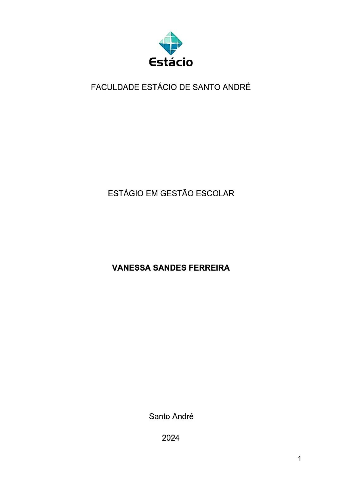 Estácio FACULDADE ESTÁCIO DE SANTO ANDRÉ ESTÁGIO EM GESTÃO ESCOLAR VANESSA SANDES FERREIRA Santo André 2024 1Estácio FACULDADE ESTÁCIO DE SANTO ANDRÉ ESTÁGIO EM GESTÃO ESCOLAR Relatório Final de Estágio Supervisionado, apresentado ao curso de Pedagogia como parte dos requisitos necessários para conclusão da disciplina Estágio em Gestão Escolar. Santo André 2024 2Estácio AGRADECIMENTOS Gostaria de expressar meus sinceros agradecimentos a todas as pessoas e a instituição que contribuíram diretamente para a realização deste estágio e para a elaboração deste relatório. Em primeiro lugar, agradeço à equipe do Instituto Beneficente Lar de Maria, em especial aos gestores, coordenadores, professores, funcionários e alunos, pela acolhida calorosa, apoio e colaboração durante período de estágio. Agradeço também pela oportunidade de vivenciar e aprender com as práticas pedagógicas e de gestão desenvolvidas na instituição. Agradeço aos professores e coordenadores do curso de Pedagogia, pela orientação, incentivo e apoio ao longo de toda a minha formação acadêmica. Suas contribuições foram fundamentais para 0 meu desenvolvimento pessoal e profissional. Agradeço também aos meus colegas de curso, pela troca de experiências, apoio mútuo e amizade ao longo desta jomada acadêmica. 3Estácio "Educação é a arma mais poderosa que você pode usar para mudar 0 mundo." (Nelson Mandela) 4Estácio SUMÁRIO INTRODUÇÃO 6 1. CARACTERIZAÇÃO DA INSTITUIÇÃO 8 1.1. ESTRUTURA E DA ESCOLA 8 1.2. ASPECTOS FÍSICO, HUMANO E MATERIAL DA ESCOLA 8 2. PROJETO POLÍTICO PEDAGÓGICO 9 2.1. A ESCOLA COMO GRUPO SOCIAL 9 2.2. A INTERAÇÃO ENTRE CORPO DOCENTE, DISCENTE 9 E ADMINISTRATIVO 3. GESTÃO E PROCESSOS PARTICIPATIVOS 10 3.1. ATIVIDADES DESENVOLVIDAS E ESTRATÉGIAS 10 3.2. ANÁLISE DESSA ETAPA 10 4. CONSIDERAÇÕES FINAIS 11 REFERÊNCIAS BIBLIOGRÁFICAS 12 ANEXOS 14 5Estácio INTRODUÇÃO O estágio é um componente essencial na formação acadêmica, proporcionando aos estudantes a oportunidade de vivenciar na prática os conhecimentos adquiridos em sala de aula e de desenvolver habilidades e competências fundamentais para sua atuação profissional. presente relatório tem como objetivo apresentar as experiências e aprendizados adquiridos durante 0 estágio supervisionado realizado no Instituto Beneficente Lar de Maria, localizado na Praça Lusíadas, n° 200. estágio, com duração de 10 de abril de 2024 a 29 de maio de 2024, foi realizado no período das 12:00 às 16:00 e teve como foco setor de gestão, em consonância com curso de Pedagogia. Neste relatório, serão descritas as características da instituição, incluindo sua estrutura, funcionamento e contexto socioeducativo. Em seguida, serão abordados aspectos relacionados ao Projeto Político Pedagógico (PPP) da escola, destacando sua visão, missão, valores e objetivos, bem como as estratégias e atividades desenvolvidas para sua implementação. Além disso, serão analisados os processos de gestão participativa adotados pela escola, com ênfase nas atividades desenvolvidas e nas estratégias utilizadas para promover a participação ativa de todos os membros da comunidade escolar. Ao longo deste relatório, serão apresentadas reflexões sobre a importância do estágio na formação profissional, bem como as contribuições e desafios enfrentados durante período de inserção na instituição. Por meio da análise das práticas observadas e das experiências vivenciadas, busca-se contribuir para uma compreensão mais ampla do papel do pedagogo no contexto escolar e para desenvolvimento de uma prática reflexiva e crítica, comprometida com a promoção de uma educação de qualidade e inclusiva. 6Estácio Este relatório é fruto de um processo de aprendizagem contínuo e representa um importante instrumento de avaliação e aprimoramento da formação acadêmica e profissional. Espera-se que as reflexões e análises apresentadas possam contribuir para desenvolvimento pessoal e profissional do estagiário, bem como para fortalecimento das práticas educativas e da gestão escolar. 7Estácio 1. CARACTERIZAÇÃO DA INSTITUIÇÃO 1.1. ESTRUTURA E FUNCIONAMENTO DA ESCOLA Instituto Beneficente Lar de Maria é uma instituição de referência na comunidade local, reconhecida pelo seu compromisso com o desenvolvimento integral de crianças e adolescentes em situação de vulnerabilidade. A escola dentro do instituto é parte essencial desse compromisso, oferecendo uma educação de qualidade que visa não apenas o aprendizado acadêmico, mas também desenvolvimento pessoal e social dos alunos. A escola opera com base em um currículo sólido e adaptado às necessidades dos estudantes, promovendo uma abordagem pedagógica centrada no aluno, que valoriza a participação ativa, a criatividade e a autonomia. Além das disciplinas tradicionais, são oferecidas atividades extracurriculares e projetos educacionais que enriquecem a experiência de aprendizado dos alunos e incentivam desenvolvimento de habilidades diversas. 1.2 ASPECTOS FÍSICOS, HUMANOS E MATERIAIS DA ESCOLA: Aspectos Físicos: prédio da escola é cuidadosamente planejado para proporcionar um ambiente seguro, acolhedor e propício ao aprendizado. As salas de aula são espaçosas e bem iluminadas, proporcionando um ambiente propício para ensino e a aprendizagem. Além disso, a escola conta com áreas externas, como pátios e jardins, que são utilizadas para atividades recreativas e educativas. Aspectos Humanos: A equipe da escola é formada por profissionais altamente qualificados e dedicados, que atuam de forma colaborativa para garantir melhor desenvolvimento dos alunos. Os professores são especialistas em suas áreas de atuação e demonstram um profundo comprometimento com o sucesso acadêmico e pessoal de cada aluno. Além disso, a escola conta com apoio psicopedagógico e serviços de orientação educacional para atender às n