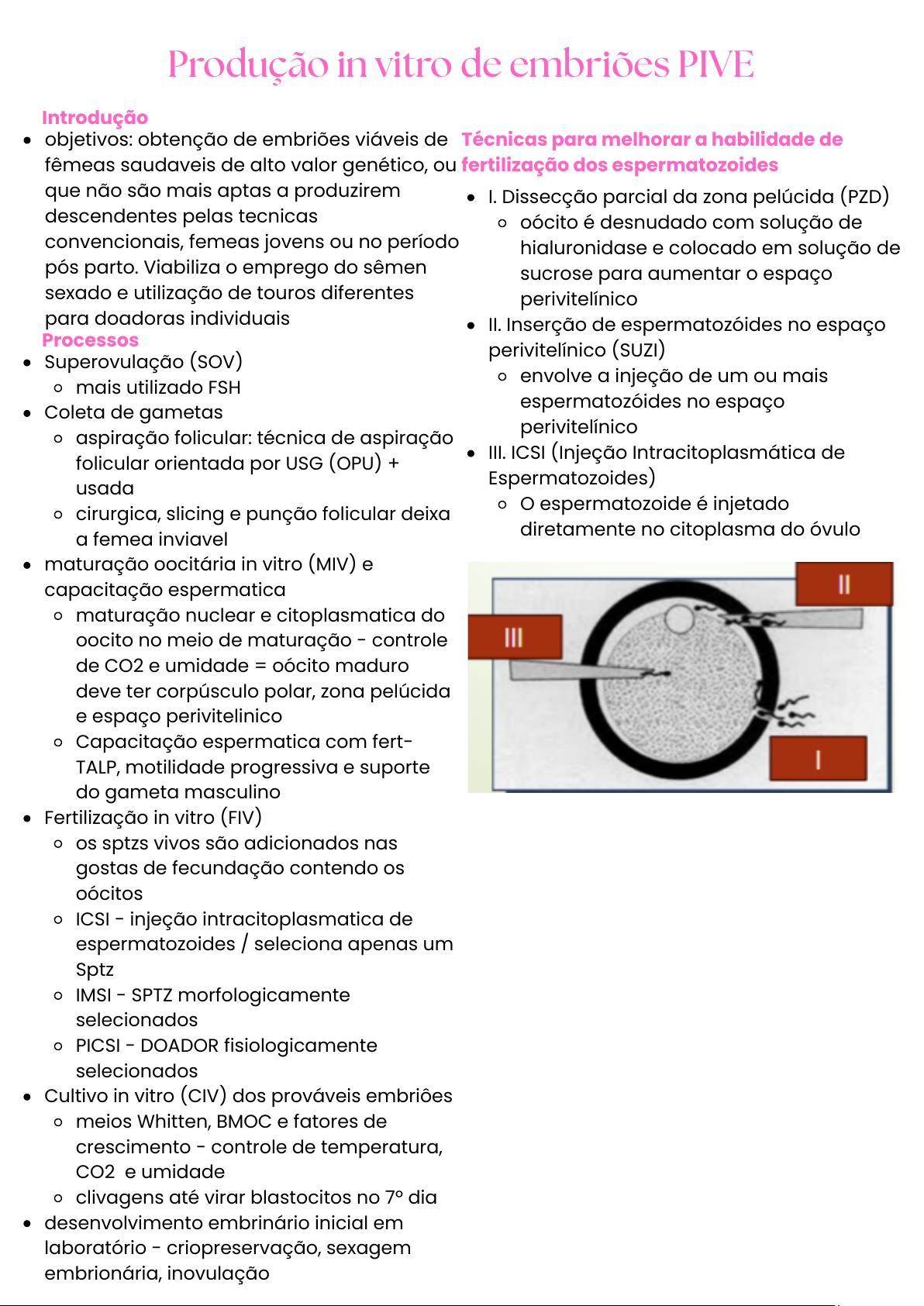 Produção in vitro de embriões PIVE Introdução objetivos: obtenção de embriões viáveis de fêmeas saudaveis de alto valor genético, ou que não são mais aptas a produzirem descendentes pelas tecnicas convencionais, femeas jovens ou no período pós parto. Viabiliza o emprego do sêmen sexado e utilização de touros diferentes para doadoras individuais Superovulação (SOV) mais utilizado FSH Coleta de gametas aspiração folicular: técnica de aspiração folicular orientada por USG (OPU) + usada cirurgica, slicing e punção folicular deixa a femea inviavel maturação oocitária in vitro (MIV) e capacitação espermatica maturação nuclear e citoplasmatica do oocito no meio de maturação - controle de CO2 e umidade = oócito maduro deve ter corpúsculo polar, zona pelúcida e espaço perivitelinico Capacitação espermatica com fert- TALP, motilidade progressiva e suporte do gameta masculino Fertilização in vitro (FIV) os sptzs vivos são adicionados nas gostas de fecundação contendo os oócitos ICSI - injeção intracitoplasmatica de espermatozoides / seleciona apenas um Sptz IMSI - SPTZ morfologicamente selecionados PICSI - DOADOR fisiologicamente selecionados Cultivo in vitro (CIV) dos prováveis embriôes meios Whitten, BMOC e fatores de crescimento - controle de temperatura, CO2 e umidade clivagens até virar blastocitos no 7º dia desenvolvimento embrinário inicial em laboratório - criopreservação, sexagem embrionária, inovulação Processos Técnicas para melhorar a habilidade de fertilização dos espermatozoides I. Dissecção parcial da zona pelúcida (PZD) oócito é desnudado com solução de hialuronidase e colocado em solução de sucrose para aumentar o espaço perivitelínico II. Inserção de espermatozóides no espaço perivitelínico (SUZI) envolve a injeção de um ou mais espermatozóides no espaço perivitelínico III. ICSI (Injeção Intracitoplasmática de Espermatozoides) O espermatozoide é injetado diretamente no citoplasma do óvulo