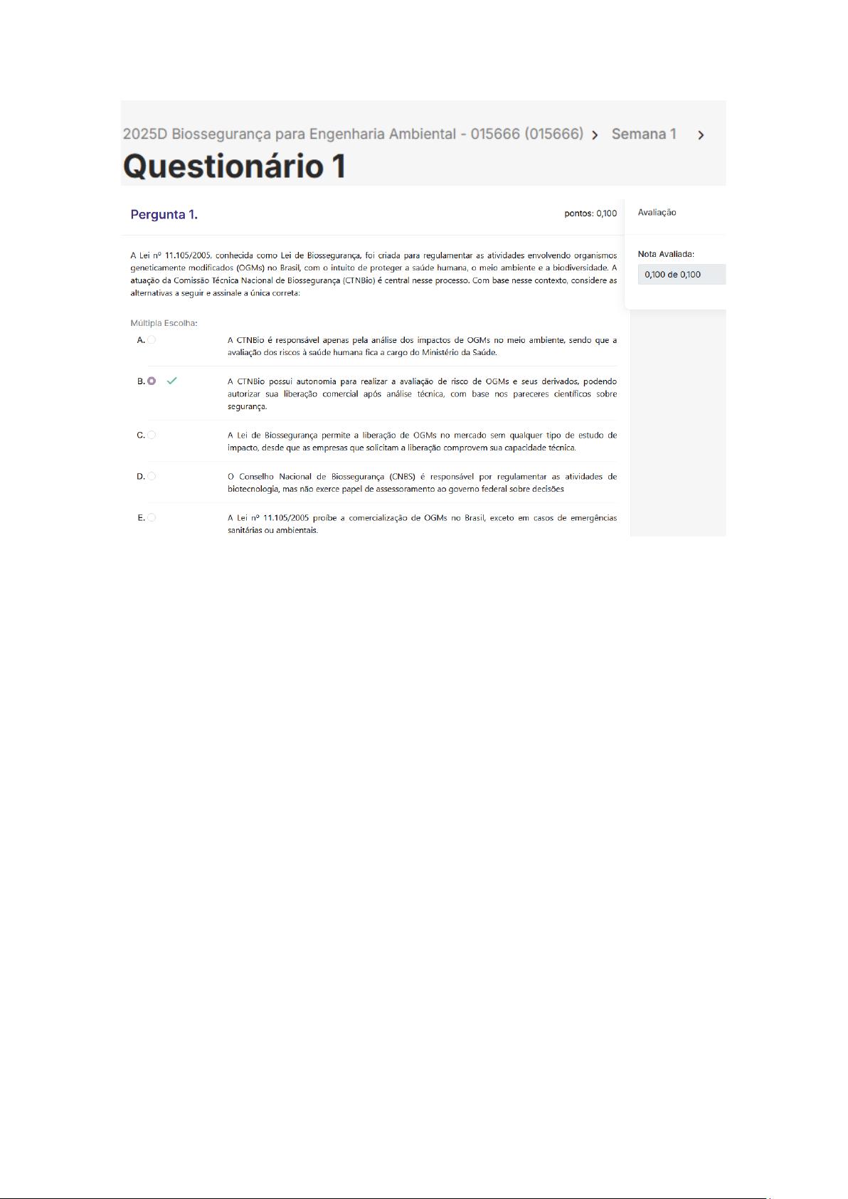 2025D Biossegurança para Engenharia Ambiental 015666 (015666) > Semana 1 > Questionário 1 Pergunta 1. pontos: 0,100 Avaliação A Lei n° 11.105/2005, conhecida como Lei de Biossegurança, foi criada para regulamentar as atividades envolvendo organismos Nota Avaliada: geneticamente modificados (OGMs) no Brasil, com intuito de proteger a saúde humana, meio ambiente e a biodiversidade. A 0,100 de 0,100 atuação da Comissão Técnica Nacional de Biossegurança (CTNBio) é central nesse processo. Com base nesse contexto, considere as alternativas a seguir e assinale a única correta: Múltipla Escolha: A. A CTNBio é responsável apenas pela análise dos impactos de OGMs no meio ambiente, sendo que a avaliação dos riscos à saúde humana fica a cargo do Ministério da Saúde. B. A CTNBio possui autonomia para realizar a avaliação de risco de OGMs e seus derivados, podendo autorizar sua liberação comercial após análise técnica, com base nos pareceres científicos sobre segurança. C. A Lei de Biossegurança permite a liberação de OGMs no mercado sem qualquer tipo de estudo de impacto, desde que as empresas que solicitam a liberação comprovem sua capacidade técnica. D. Conselho Nacional de Biossegurança (CNBS) é responsável por regulamentar as atividades de biotecnologia, mas não exerce papel de assessoramento ao governo federal sobre decisões E. A Lei 11.105/2005 proíbe a comercialização de OGMs no Brasil, exceto em casos de emergências sanitárias ou ambientais.