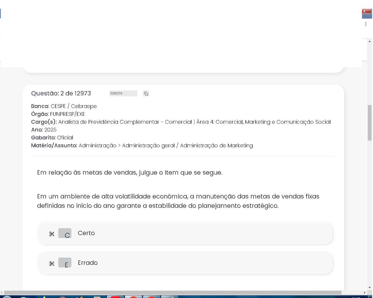 Questão: 2 de 12973 2282274 Banca: CESPE / Cebraspe Órgão: FUNPRESP/EXE Cargo(s): Analista de Previdência Complementar Comercial Área 4: Comercial, Marketing e Comunicação Social Ano: 2025 Gabarito: Oficial Matéria/Assunto: Administração > Administração geral / Administração de Marketing Em relação às metas de vendas, julgue item que se segue. Em um ambiente de alta volatilidade econômica, a manutenção das metas de vendas fixas definidas no início do ano garante a estabilidade do planejamento estratégico. % C Certo % E Errado