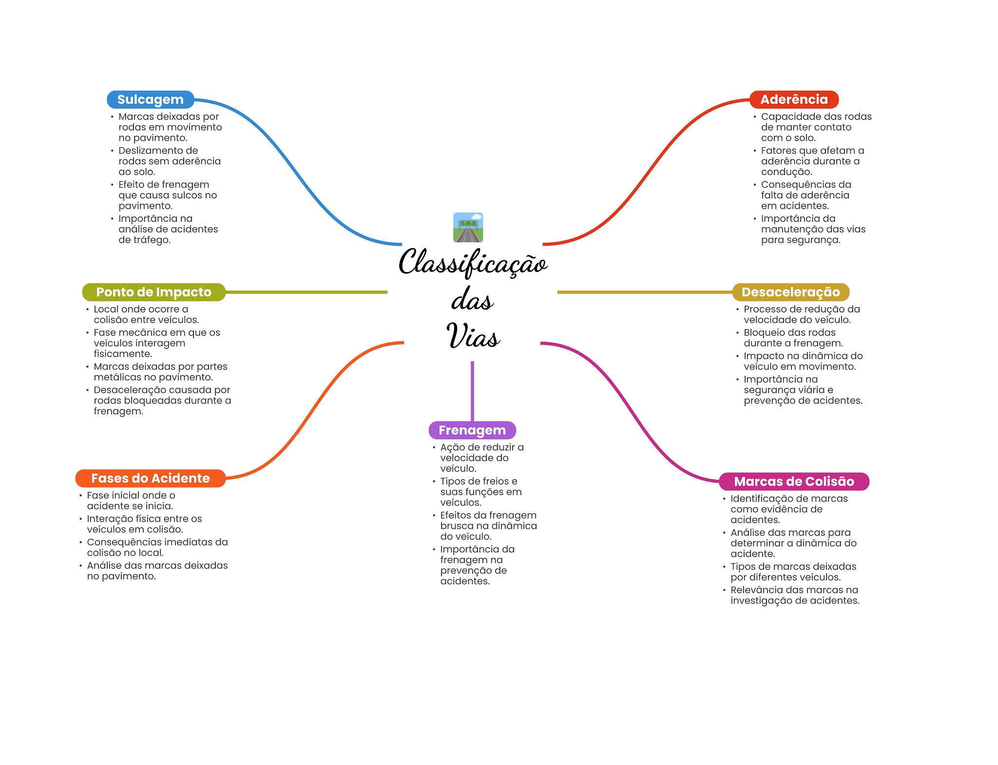 Sulcagem Aderência Marcas deixadas por Capacidade das rodas rodas em movimento de manter contato no pavimento. com solo. Deslizamento de Fatores que afetam a rodas sem aderência aderência durante a ao solo. condução. Efeito de frenagem Consequências da que causa sulcos no falta de aderência pavimento. em acidentes. Importância na Importância da análise de acidentes manutenção das vias de tráfego. para segurança. Classificação Ponto de Impacto das Desaceleração Local onde ocorre a Processo de redução da colisão entre veículos. velocidade do veículo. Fase mecânica em que Vias Bloqueio das rodas veículos interagem durante a frenagem. fisicamente. Impacto na dinâmica do Marcas deixadas por partes veículo em movimento. metálicas no pavimento. Importância na Desaceleração causada por segurança viária e rodas bloqueadas durante a prevenção de acidentes. frenagem. Frenagem Ação de reduzir a velocidade do veículo. Fases do Acidente Tipos de freios e Marcas de Colisão Fase inicial onde suas funções em acidente se inicia. veículos. Identificação de marcas como evidência de Interação física entre OS Efeitos da frenagem acidentes. veículos em colisão. brusca na dinâmica do veículo. Análise das marcas para Consequências imediatas da determinar a dinâmica do colisão no local. Importância da acidente. Análise das marcas deixadas frenagem na no pavimento. prevenção de Tipos de marcas deixadas acidentes. por diferentes veículos. Relevância das marcas na investigação de acidentes.