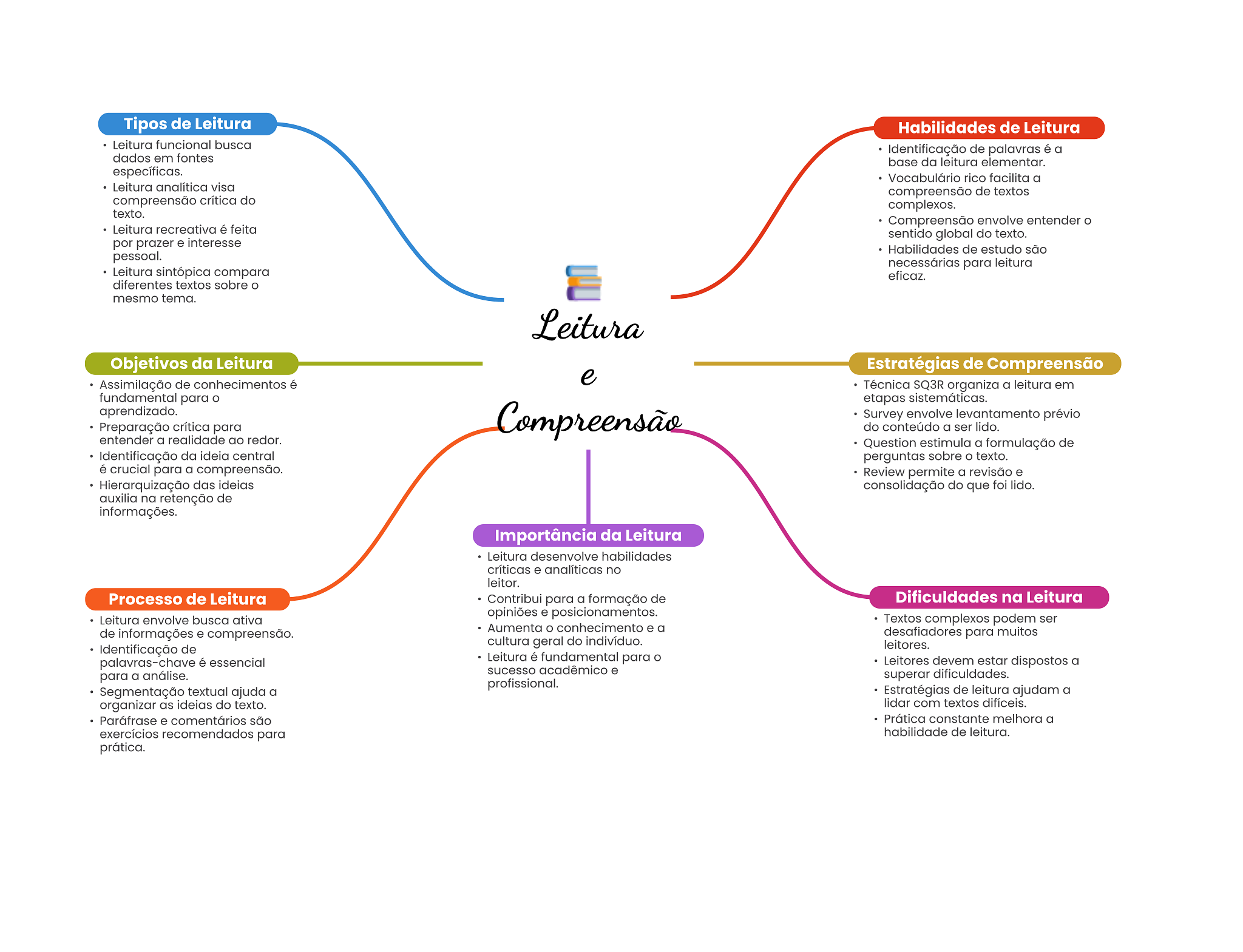 Tipos de Leitura Habilidades de Leitura Leitura funcional busca Identificação de é a dados em fontes base da leitura elementar. específicas. Vocabulário rico facilita a Leitura analítica visa compreensão de textos compreensão crítica do complexos. texto. Compreensão envolve entender Leitura recreativa é feita sentido global do texto. por prazer e interesse Habilidades de estudo são pessoal. necessárias para leitura Leitura sintópica compara eficaz. diferentes textos sobre mesmo tema. Leitura Objetivos da Leitura Estratégias de Compreensão Assimilação de conhecimentos é e Técnica SQ3R organiza a leitura em fundamental para etapas sistemáticas. aprendizado. Preparação crítica para Compreensão Survey envolve levantamento prévio do conteúdo a ser lido. entender a realidade ao redor. Question estimula a formulação de Identificação da ideia central perguntas sobre O texto. é crucial para a compreensão. Review permite a revisão e Hierarquização das ideias consolidação do que foi lido. auxilia na retenção de informações. Importância da Leitura Leitura desenvolve habilidades críticas e analíticas no leitor. Processo de Leitura Contribui para a formação de Dificuldades na Leitura opiniões e posicionamentos. Leitura envolve busca ativa Textos complexos podem ser de informações e compreensão. desafiadores para muitos cultura geral do indivíduo. Identificação de leitores. palavras-chave é essencial Leitura é fundamental para Leitores devem estar dispostos a sucesso acadêmico e para a análise. superar dificuldades. profissional. Segmentação textual ajuda a Estratégias de leitura ajudam a organizar as ideias do texto. lidar com textos difíceis. Paráfrase e comentários são Prática constante melhora a exercícios recomendados para habilidade de leitura. prática.