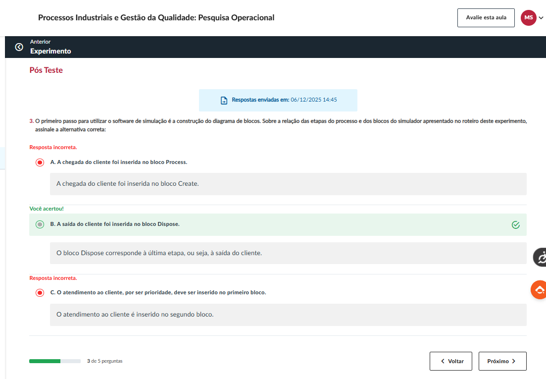 Processos Industriais e Gestão da Qualidade: Pesquisa Operacional Avalie esta aula MS Anterior Experimento Pós Teste Respostas enviadas em: 06/12/2025 14:45 3.0 primeiro passo para utilizar software de simulação é a construção do diagrama de blocos. Sobre a relação das etapas do processo e dos blocos do simulador apresentado no roteiro deste experimento, assinale a alternativa correta: Resposta incorreta. A. A chegada do cliente foi inserida no bloco Process. A chegada do cliente foi inserida no bloco Create. Você acertou! B. A saída do cliente foi inserida no bloco Dispose. O bloco Dispose corresponde à etapa, ou seja, à saída do cliente. Resposta incorreta. C.O atendimento ao cliente, por ser prioridade, deve ser inserido no primeiro bloco. atendimento ao cliente é inserido no segundo bloco. 3 de 5 perguntas