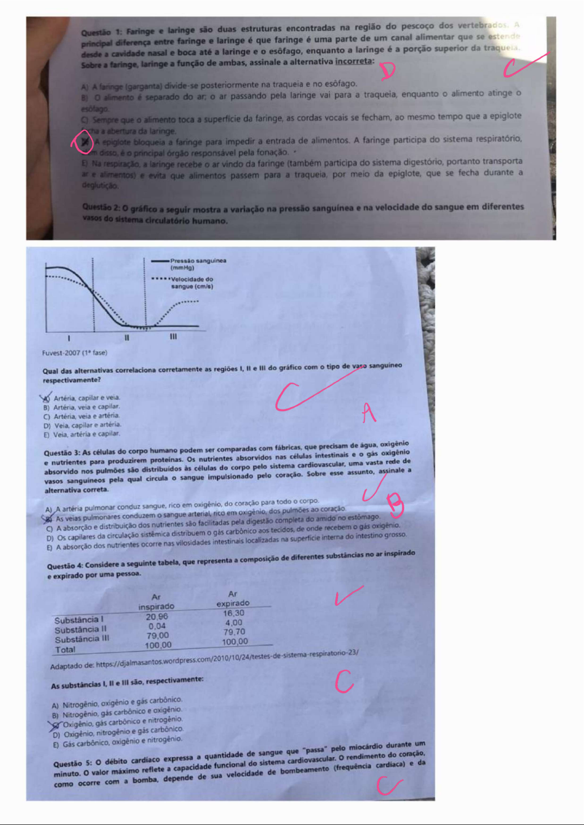 Questão 1: Faringe e laringe são duas estruturas encontradas na região do pescoço dos A principal diferença entre faringe e laringe é que faringe é uma parte de um canal alimentar que se estende desde a cavidade nasal e boca até a laringe e esôfago, enquanto a laringe é a porção superior da Sobre a faringe, laringe a função de ambas, assinale a alternativa incorreta: A) A faringe (garganta) divide-se posteriormente na traqueia e no B) 0 alimento é separado do 0 ar passando pela laringe vai para a traqueia, enquanto alimento atinge Sempre que alimento toca a superficie da faringe, as cordas vocais se fecham, ao mesmo tempo que a epiglote cha a abertura da laringe. A epiglote bloqueia a faringe para impedir a entrada de alimentos. A faringe participa do sistema respiratório, disso, principal órgão responsável pela fonação. Na respiração, a laringe recebe ar vindo da faringe (também participa do sistema digestório, portanto transporta ar e alimentos) evita que alimentos passem para a traqueia, por meio da epiglote, que se fecha durante a Questão 2: gráfico a seguir mostra a variação na pressão sanguínea e na velocidade do sangue em diferentes vasos do sistema circulatório humano. Pressão sanguinea (mmHg) do sangue (cm/s) III Fuvest-2007 fase) Qual das alternativas correlaciona corretamente as regiões I, = e III do gráfico com o tipo de vaso sanguíneo respectivamente? Artéria, capilar e veia. B) Artéria, veia e capilar. C) Artéria, veia e D) capilar e artéria. Veia, artéria e capilar. Questão 3: As células do corpo humano podem ser comparadas com fábricas, que precisam de água, oxigênio e nutrientes para produzirem Os nutrientes absorvidos nas células intestinais e gás oxigênio rede de absorvido nos pulmões são às células do corpo pelo sistema cardiovascular, uma vasta assinale a vasos pela qual circula o sangue impulsionado pelo coração. Sobre esse assunto, alternativa correta. A) A artéria pulmonar conduz sangue, rico em do coração para todo corpo. As veias pulmonares conduzem sangue arterial, rico em oxigênio, dos pulmões ao coração C) Os capilares da circulação sistêmica distribuem gás carbônico aos tecidos, de onde recebem intestino gás A absorção e distribuição dos nutrientes são facilitadas pela digestão completa do amido no estômago. D) E) A absorção dos nutrientes ocorre nas vilosidades intestinais localizadas na superficie interna do grosso. Questão 4: Considere a seguinte tabela, que representa a composição de diferentes substâncias no inspirado e expirado por uma pessoa. Ar Ar inspirado expirado Substância I 20,96 16,30 Substância 0,04 4,00 Substância III 79,00 79,70 100,00 100,00 Adaptado Total de: As substâncias I, = e III são, respectivamente: A) Nitrogênio, oxigênio e gás carbônico. B) Nitrogênio, gás carbônico e oxigênio. Oxigênio, gás carbônico e nitrogênio. D) E) Gás carbônico, e nitrogênio. Oxigênio, nitrogênio e gás carbônico. Questão 5: débito cardíaco expressa a quantidade de do sangue sistema que cardiovascular. "passa" pelo rendimento miocárdio durante do coração, um da minuto. como ocorre valor com máximo a bomba, reflete depende a capacidade de sua funcional velocidade de bombeamento (frequência equantidade de sangue ejetada a cada contração (volume sistólico de ejeção). Sobre o controle do débito assinale a alternativa correta: A) É a quantidade de sangue bombeado para a aorta a cada batimento pelo coração. B) É a quantidade de sangue que flui das veias para ventriculo direito a cada retorno venoso (RV) corresponde ao fluxo de sangue que retorna ao coração e entra na câmara ventricular. retorno venoso influencia diretamente volume sistólico e, o débito D) Com mecanismo de Frank-Starling, maior estiramento das fibras do músculo cardiaco garantirá um volume sistólico (VS) maior na sistole seguinte. Portanto, se houver diminuição no volume sistólico, mesmo ocorrerá no retorno venoso. E) débito cardiaco se autorregula através do sistema nervoso autônomo e não sofre influência do retorno venoso. Questão 6: Para formar a respiração, a função dos músculos é essencial tanto na inspiração quanto na expiração. Esses músculos são, respectivamente: Inspiração: músculo diafragma e intercostais externos. B) Expiração: músculo diafragma e intercostais C) Inspiração: músculos abdominais e intercostais internos. D) Expiração: músculos abdominais e intercostais internos. E) Expiração: músculo diafragma e intercostais internos. Questão 7: No homem, as trocas gasosas que ocorrem em alvéolos pulmonares, capilares e tecidos acontecem em função das diferenças de pressão parcial de e de no sangue e no ar alveolar. Em relação a esse mecanismo, pode-se afirmar que: A) Aproximadamente, 30% do CO2 transportado pelo sangue estão dissolvidos no plasma e 70% combinados com a hemoglobina. B) Nos pulmões, a enzima anidrase carbônica dissocia ácido carbônico em ions H+ e C) A oxiemoglobina é um composto estável formado por uma molécula de hemoglobina combinada fortemente com quatro moléculas de oxigênio. No sangue arterial, a maior parte do está sob a forma de oxiemoglobina no interior dos eritrócitos, enquanto uma pequena porcentagem está diluida no plasma. E) A combinação do monóxido de carbono com a hemoglobina resulta na formação da carboxiemoglobina, um composto instável, porém eficaz no transporte de oxigênio. Questão 8: Em relação ao sistema circulatório humano, são feitas as seguintes afirmativas: No coração, sangue que penetra no átrio esquerdo é arterial e chega através das veias coração envia sangue venoso aos pulmões através das artérias pulmonares, que saem do ventriculo esquerdo. III Através da artéria aorta, sangue chega ao ventrículo esquerdo, de onde é distribuido para todo corpo. É correto apenas o que se afirma em: A) Todas as afirmativas são corretas. B) I e III. 