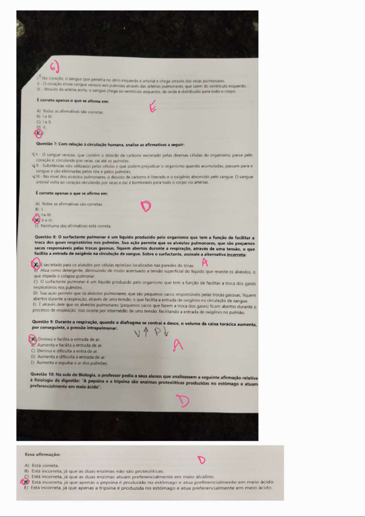 No coração, sangue que penetra no esquerdo é arterial e chega através das veias coração envia sangue venoso aos pulmões através das artérias pulmonares, que saem do ventriculo III Através da artéria sangue chega ao ventriculo esquerdo, de onde é distribuido para todo corpo. É correto apenas que se afirma em: A) Todas as afirmativas são corretas B) III = D) Questão 7: Com relação à circulação humana, analise as afirmativas a seguir: sangue que contém dióxido de carbono excretado pelas diversas células do organismo, passa pelo coração e, circulando por vai até os pulmões. Substâncias não utilizadas pelas células e que podem prejudicar organismo quando acumuladas, passam para sangue e são eliminadas pelos rins e pelos No nivel dos alvéolos pulmonares, dióxido de carbono é liberado e oxigênio absorvido pelo sangue. sangue arterial volta ao coração circulando por veias e dai é bombeado para todo corpo via É correto apenas o que se afirma em: A) Todas as afirmativas são B) III. X e Nenhuma das afirmativas está Questão 8: o surfactante pulmonar é um produzido pelo organismo que tem a função de facilitar a troca dos gases respiratórios nos pulmões. Sua ação permite que os alvéolos pulmonares, que são pequenos sacos responsáveis pelas trocas gasosas, fiquem abertos durante a respiração, através de uma tensão, que facilita a entrada de oxigênio na circulação de sangue. Sobre o surfactante, assinale a alternativa incorreta: É secretado para os alvéolos por células epiteliais localizadas nas paredes do tórax. A Atua como detergente, diminuindo de modo acentuado a tensão superficial do liquido que reveste os o que impede colapso pulmonar. C) surfactante pulmonar é um produzido pelo organismo que tem a função de facilitar a troca dos gases respiratórios nos D) Sua ação permite que os alvéolos pulmonares, que são pequenos sacos responsáveis pelas trocas gasosas, fiquem abertos durante a respiração, através de uma tensão, que facilita a entrada de oxigênio na circulação de sangue. E) através dele que os alvéolos pulmonares (pequenos sacos que fazem a troca dos gases) ficam abertos durante processo de Isso ocorre por intermédio de uma tensão, facilitando a entrada de oxigênio no Questão 9: Durante a respiração, quando diafragma se contrai e desce, volume da caixa torácica aumenta, por conseguinte, a pressão intrapulmonar: Diminui e facilita a entrada de ar. Aumenta e facilita a entrada de Diminui e dificulta a entra de ar. D) Aumenta e dificulta a entrada de E) Aumenta e expulsa dos pulmões. Questão 10: Na aula de Biologia, professor pediu a seus alunos que analisassem a seguinte afirmação relativa fisiologia da digestão: "A pepsina e a tripsina são enzimas produzidas no estômago e atuam preferencialmente em meio ácido". Essa afirmação: A) Está correta. B) Está já que as duas enzimas não são proteoliticas. Está já que as duas enzimas atuam preferencialmente em meio Está já que apenas a pepsina produzida no estômago e atua preferencialmente em meio ácido. E) Está incorreta, já que apenas a tripsina produzida no estômago e atua preferencialmente em meioIMPORTANTE Data limite para aplicação desta prova: 29/11/2025 UNIP EAD Código da Prova: 125580063639 Curso: NUTRIÇÃO Série: 1 Tipo: Bimestral AP Aluno: 2548958 CINTIA REGINA BUENO RANGEL Questões objetivas valendo 10 pontos Gerada em: 26/11/2025 às 13h08 Instruções para a realização da prova: 1. Leia as questões com 2. Confira seu nome e RA e verifique se caderno de questão e folha de respostas correspondem à sua disciplina. 3. Faça as marcações primeiro no caderno de questões e depois repasse para a folha de 4. Serão consideradas somente as marcações feitas na folha de 5. Não se esqueça de assinar a folha de 6. Utilize caneta preta para preencher a folha de respostas. 7. Preencha todo espaço da bolha referente à alternativa escolhida, a caneta, conforme instruções: não não preencha X, não ultrapasse os limites para 8. Preste atenção para não deixar nenhuma questão sem assinalar. 9. Só assinale uma alternativa por questão. 10. Não se esqueça de responder às questões discursivas, quando houver, e de entregar a folha de respostas para tutor do polo presencial, devidamente 11. Não é permitido consulta a nenhum material durante a prova, exceto quando indicado o uso do material de apoio. 12. Lembre-se de confirmar sua presença através da assinatura digital (login e Boa proval Questões de múltipla escolha Disciplina: 735060 FISIOLOGIA GERAL Questão 1: Qual cirurgia comprometeria mais a função do sistema digestório e por a remoção dos 25 centimetros iniciais do intestino delgado (duodeno) ou a remoção de igual porção do inicio do intestino grosso? A A remoção do duodeno seria mais drástica, pois nele ocorre a maior parte da digestão B) A remoção do duodeno seria mais drástica, pois nele ocorre a absorção de toda a água de que organismo necessita para C) A remoção do intestino grosso seria mais drástica, pois nele ocorre a maior parte da absorção dos produtos do processo digestório, D) A remoção do intestino grosso seria mais drástica, pois nele ocorre a absorção de toda a água de que organismo necessita para sobreviver. E) As duas remoções seriam igualmente drásticas, pois tanto no duodeno quanto no intestino grosso ocorrem digestão e absorção de nutrientes e de Questão 2: o gráfico a seguir mostra a variação na pressão sanguínea e na velocidade do sangue em diferentes vasos do sistema circulatório humano.Pressão sanguinea (mmHg) de Velocidade do sangue (cm/s) II III Fuvest-2007 fase) Qual das alternativas correlaciona corretamente as regiões I, e III do gráfico com o tipo de vaso sanguíneo respectivamente? Artéria, capilar e veia. Artéria, veia e capilar. C) Artéria, veia e D) Veia, capilar e E) Veia, artéria e Questão 3: As células do corpo humano pod