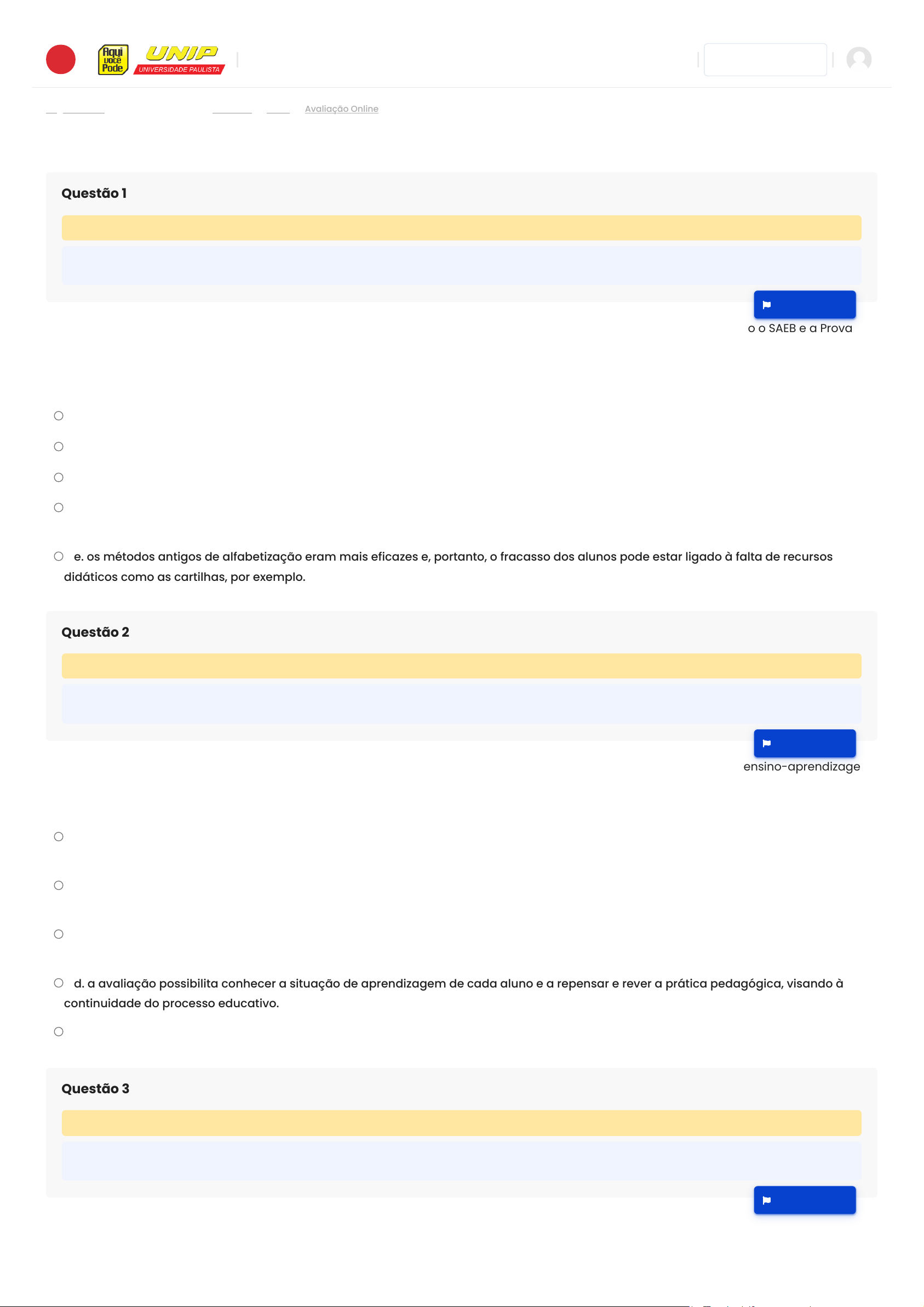 24/11/2021 10:51 Avaliação Online www.unipvirtual.com.br/avaunip/mod/quiz/attempt.php?attempt=5600668&cmid=84799 1/4 - Minhas disciplinas - - - Bibliotecas Virtuais Página inicial S6-L0105 Geral Avaliação Online O baixo desempenho em leitura nas avaliações em larga escala demonstrado pelas crianças brasileiras em exames como o SAEB e a Prova Brasil tem suscitado debates e estudos que remetem a interpretações variadas. A esse respeito, podemos tecer algumas considerações, exceto que: Escolha uma opção: a. há pouco avanço dos alunos em suas competências para leitura e compreensão nas terceiras e quartas séries. b. os professores não estariam ensinando aos alunos as habilidades envolvidas na compreensão dos textos em si. c. há uma ineficácia ou inexistência de mecanismos que ensinem respeitando a diversidade de ritmos dos alunos. d. o fracasso da maioria dos alunos mostra que precisamos ampliar as discussões entre os educadores sobre o que é alfabetizar e como fazê-lo. e. os métodos antigos de alfabetização eram mais eficazes e, portanto, o fracasso dos alunos pode estar ligado à falta de recursos didáticos como as cartilhas, por exemplo. Na perspectiva construtivista de avaliação, o ato de avaliar deixa de se centrar no indivíduo, situando-se no processo de ensino-aprendizagem. Dessa forma, podemos afirmar que: Escolha uma opção: a. a avaliação é uma reflexão sobre a prática do professor e está centrada na seleção dos alunos mais preparados para continuar o processo de escolarização. b. o professor é um agente reflexivo da aprendizagem do educando, classificando os alunos em relação aos conteúdos discutidos e apreendidos em sala de aula. c. a avaliação permite ao professor diagnosticar a situação de aprendizagem dos alunos, visando quantificar essa aprendizagem e a forma de condução do ensino. d. a avaliação possibilita conhecer a situação de aprendizagem de cada aluno e a repensar e rever a prática pedagógica, visando à continuidade do processo educativo. e. a avaliação é um processo de análise dos resultados finais, que garantem a seletividade do processo de escolarização. Analise o texto a seguir: “Chama a atenção que o MEC tenha optado pelo IDEB como referência de qualidade. Por que não construímos uma mediação baseada no / i i é i iá i á i f i Marcar questão Questão 1 Ainda não respondida Vale 1,00 ponto(s). Marcar questão Questão 2 Ainda não respondida Vale 1,00 ponto(s). Marcar questão Questão 3 Ainda não respondida Vale 1,00 ponto(s). http://www.unipvirtual.com.br/avaunip http://www.unipvirtual.com.br/avaunip/ http://www.unipvirtual.com.br/avaunip/course/view.php?id=3575 http://www.unipvirtual.com.br/avaunip/course/view.php?id=3575#section-0 http://www.unipvirtual.com.br/avaunip/mod/quiz/view.php?id=84799 Samsung Realce Samsung Realce Samsung Realce Samsung Realce Samsung Realce 24/11/2021 10:51 Avaliação Online www.unipvirtual.com.br/avaunip/mod/quiz/attempt.php?attempt=5600668&cmid=84799 2/4 custo aluno/qualidade, na qual se levaria em conta uma série de variáveis que são necessárias ao funcionamento adequado de uma escola de qualidade? Por que não definimos o que entendemos por uma escola que tenha condições de ensinar e não criamos um indicador mais amplo e sensível às desigualdades sociais? (FREITAS, 2007, p. 981)”. Isso significa que: Escolha uma opção: a. o IDEB não é um parâmetro para o investimento em escolas e sistemas públicos de educação. b. o IDEB foi criado com o objetivo de detectar escolas cujos alunos apresentem baixa performance, mas não propõe indicadores que diminuam as desigualdades sociais. c. o IDEB pode ser criticado por ser um parâmetro que tem como objetivo avaliar a função social da escola. d. o IDEB foi criado para definir a qualidade de uma escola mais sensível às desigualdades sociais. e. o IDEB mostra que houve um grande avanço na qualidade do ensino na escola pública. Para Jussara Hoffman (2013, p.75), o teste é um instrumento de investigação e ação de ambos os sujeitos envolvidos no processo educativo: Escolha uma opção: a. diretor e professor. b. ensino e aprendizagem. c. pais e filhos. d. professor e aluno. e. mediação e avaliação. Jussara Hoffman, quando afirma que “o termo conceito, na escola, assume o significado de medida”, quer dizer que, por influência do escolanovismo, os conceitos passam a fazer parte dos regimentos escolares, intencionando duas mudanças principais: a primeira, minimizar o privilégio a escores finais do aluno obtidos em provas periódicas (produto final) valorizando, assim, o seu processo de aprendizagem; e a segunda, analisar, ao lado dos aspectos cognitivos, os aspectos afetivos e psicomotores, que antes eram: Escolha uma opção: a. exclusivamente privilegiados. b. considerados sem significado para a avaliação. c. totalmente desconsiderados. d. desvalorizados em relação aos conteúdos aprendidos. e. valorizados como compreensão do ser na sua totalidade afetiva e motora. E l ã SAEB i l l i Marcar questão Questão 4 Ainda não respondida Vale 1,00 ponto(s). Marcar questão Questão 5 Ainda não respondida Vale 1,00 ponto(s). Marcar questão Questão 6 Ainda não respondida Vale 1,00 ponto(s). Samsung Realce Samsung Realce Samsung Realce Samsung Realce Samsung Realce Samsung Realce 24/11/2021 10:51 Avaliação Online www.unipvirtual.com.br/avaunip/mod/quiz/attempt.php?attempt=5600668&cmid=84799 3/4 Em relação ao SAEB, assinale a alternativa correta: Escolha uma opção: a. Trata-se de uma avaliação universal, da qual participam todos os alunos das séries avaliadas, permitindo também avaliar a escola e os professores. b. Trata-se de uma avaliação amostral, ou seja, apenas parte dos alunos brasileiros das séries avaliadas participa da prova, que tem como objetivo acompanhar as redes de ensino, traçar o desempenho e reorientar as políticas públicas. c. Trata-se de uma a