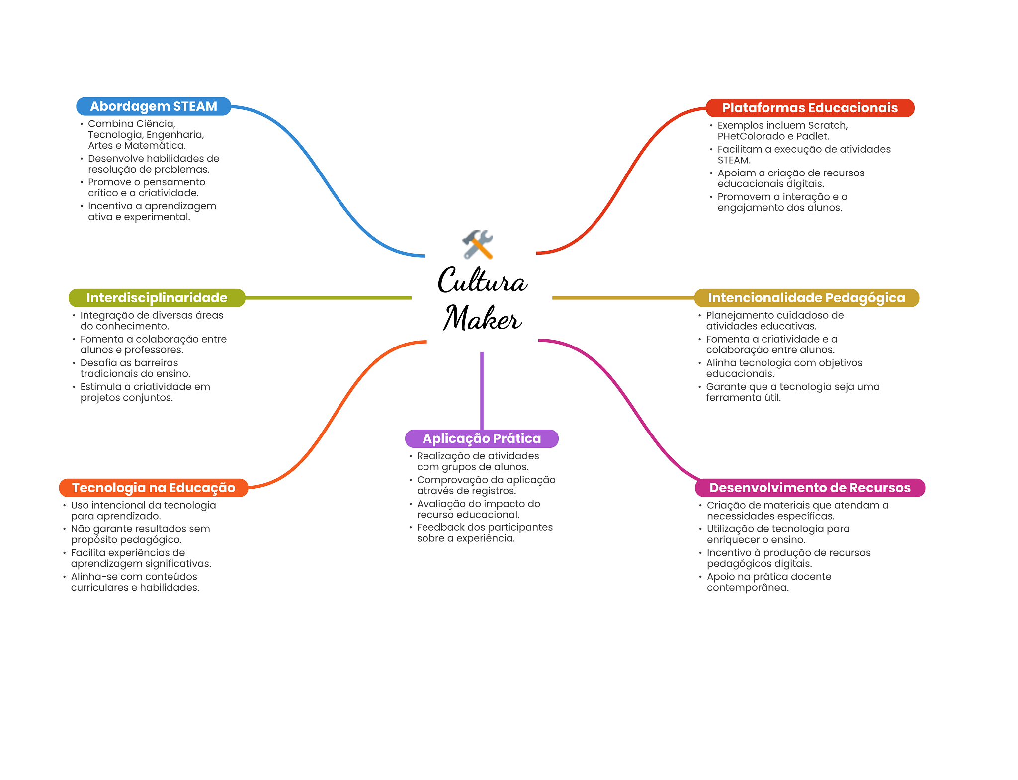 Abordagem STEAM Plataformas Educacionais Combina Ciência, Exemplos incluem Scratch, Tecnologia, Engenharia, PHetColorado e Padlet. Artes e Matemática. Facilitam a execução de atividades Desenvolve habilidades de STEAM. resolução de problemas. Apoiam a criação de recursos Promove pensamento educacionais digitais. crítico e a criatividade. Promovem a interação e Incentiva a aprendizagem engajamento dos alunos. ativa e experimental. Cultura Interdisciplinaridade Intencionalidade Pedagógica Integração de diversas áreas do conhecimento. Maker Planejamento cuidadoso de atividades educativas. Fomenta a colaboração entre Fomenta a criatividade e a alunos e professores. colaboração entre alunos. Desafia as barreiras Alinha tecnologia com objetivos tradicionais do ensino. educacionais. Estimula a criatividade em Garante que a tecnologia seja uma projetos conjuntos. ferramenta útil. Aplicação Prática Realização de atividades com grupos de alunos. Comprovação da aplicação Tecnologia na Educação através de registros. Desenvolvimento de Recursos Uso intencional da tecnologia Avaliação do impacto do Criação de materiais que atendam a para aprendizado. recurso educacional. necessidades específicas. Não garante resultados sem Feedback dos participantes Utilização de tecnologia para propósito pedagógico. sobre a experiência. enriquecer ensino. Facilita experiências de Incentivo à produção de recursos aprendizagem significativas. pedagógicos digitais. Alinha-se com conteúdos Apoio na prática docente curriculares e habilidades. contemporânea.