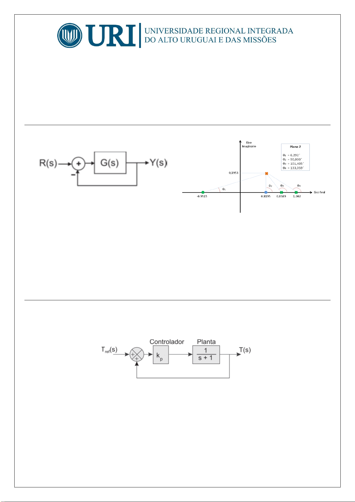 DISCIPLINA: CONTROLE ANALÓGICO E DIGITAL Lista de exercícios complementar – 4 pontos Prof. Luciano Bonato Baldissera NOME:______________________________________ DATA: ___/___/___ o O material para estudo está disponibilizado nos slides e nas anotações efetuadas durante as aulas; o A bibliografia recomendada para a resolução dos exercícios está no final das apresentações. 1) O diagrama em bloco da Figura 1 mostra um sistema em malha fechada, obtido a partir da realimentação de saída da planta G(s). A Figura 2 apresenta o diagrama de polos e zeros do sistema G(s) com a realimentação. FIGURA 1 FIGURA 2 De acordo com as informações apresentadas, analise as afirmações a seguir. O SISTEMA EM MALHA FECHADA SERÁ INSTÁVEL PORQUE EXISTEM POLOS NO SEMIPLANO DIREITO DO DIAGRAMA DE POLOS E ZEROS Com relação às afirmações acima, conclui-se que: a) as duas afirmações são verdadeiras, e a segunda justifica a primeira. b) as duas afirmações são verdadeiras, e a segunda não justifica a primeira. c) a primeira afirmação é verdadeira, e a segunda é falsa. d) a primeira afirmação é falsa, e a segunda é verdadeira. e) as duas afirmações são falsas. 2) Um engenheiro recebeu como tarefa projetar um sistema de controle de temperatura para uma chocadeira. No entanto, movido por uma restrição de componentes, ele se viu obrigado a utilizar um elemento somador em vez de um elemento subtrator, normalmente empregado no cálculo do erro de controle. Dessa forma, ele chegou ao seguinte diagrama de blocos para realizar o projeto de controle: Nesse diagrama, Tref(s) corresponde à temperatura ajustada no controle da chocadeira e T(s), à temperatura da planta (temperatura interna da chocadeira). Nessa situação, considere as afirmações a seguir: O SISTEMA EM MALHA FECHADA SERÁ INSTÁVEL PARA Kp>0 PORQUE UM SISTEMA DINÂMICO LINEAR, COM MALHA DE REALIMENTAÇÃO UTILIZANDO UM ELEMENTO SOMADOR SEMPRE SERÁ INSTÁVEL Analisando as afirmações acima, conclui-se que: a) as duas afirmações são verdadeiras, e a segunda justifica a primeira. b) as duas afirmações são verdadeiras, e a segunda não justifica a primeira. c) a primeira afirmação é verdadeira, e a segunda é falsa. d) a primeira afirmação é falsa, e a segunda é verdadeira. e) as duas afirmações são falsas. 3) Considere a resposta ao degrau unitário de um sistema dinâmico, cuja função de transferência é dada por G(s)= . A partir da análise do gráfico, conclui-se que a resposta do sistema apresenta a) sobressinal de 2%. b) tempo de subida aproximado de 0,4s. c) tempo de acomodação de 0,2 s. d) comportamento superamortecido. e) nenhuma resposta correta 4) Um processo industrial foi modelado pela seguinte função de transferência: Se o parâmetro M=12, um dos polos do modelo estará locado na posição: a) s=-5 b) s=-3 c) s=-2 d) s=+2 e) s=+3 5) Parte de um sistema industrial possui a função de transferência mostrada abaixo. O sistema representado pela função de transferência é um sistema BIBO. Determine se o sistema é estável ou instável utilizando o critério de Routh. 6) A função de transferência de um circuito é dada por: A resposta, no domínio do tempo, desse circuito ao degrau unitário u(t) é : a) 4(1 - e-0,25t) u(t) b) 2(1 - e-0,25t) u(t) c) (1 - e-0,25t) u(t) d) 4(1 - 0,5e-0,25t) u(t) e) 2(1 - 0,5e-0,25t) u(t) 7) Considerando um sistema dinâmico linear representado pela função de transferência abaixo, em que C(s) e R(s) caracterizam as variáveis de saída e de entrada do sistema, respectivamente, no domínio da frequência complexa, julgue o item que se segue: Esse sistema pode ser classificado como: a) Subamortecido b) Criticamente amortecido c) Não amortecido d) Superamortecido e) Nenhuma das respostas corretas 8) Considere o sistema de controle abaixo e a tabela de Routh-Hurwitz Considerando o sistema e a tabela obtida, assinale a afirmação verdadeira: a) As duas mudanças de sinal na primeira coluna indicam que as raízes do polinômio característico estão no semiplano esquerdo. b) O sistema é estável em malha aberta ou em malha fechada. c) Há duas raízes no semiplano direito, portanto o sistema em malha fechada é instável. d) As raízes do polinômio característico estão no eixo imaginário, portanto o sistema em malha fechada é marginalmente estável. e) Nenhuma das afirmações está correta. 9) Um Engenheiro, ao analisar um projeto de sistema de controle com realimentação, deparou-se com o seguinte diagrama apresentado na figura abaixo. Com base nas informações dessa figura, é correto afirmar que ela apresenta um sistema : a) estável com três polos no semiplano da direita. b) instável com um polo no semiplano da esquerda e três polos no semiplano da direita. c) estável com dois polos no semiplano da esquerda e dois polos no semiplano da direita. d) instável com cinco polos no semiplano da esquerda e quatro polos no semiplano da direita. e) instável com três polos no semiplano da esquerda e dois polos no semiplano da direita. 10) Com base nas funções de transferência da figura abaixo, assinale a alternativa correta. São, respectivamente, sistemas: ( ) (a) superamortecido, (b) subamortecido, (c) não amortecido e (d) criticamente amortecido. ( ) (a)criticamente amortecido, (b) subamortecido, (c) não amortecido e (d) superamortecido. ( ) (a) superamortecido, (b) não amortecido, (c) subamortecido e (d) criticamente amortecido. ( ) (a) superamortecido, (b) subamortecido, (c) criticamente amortecido e (d) não amortecido. ( ) (a) subamortecido, (b) superamortecido, (c) não amortecido e (d) criticamente amortecido. 11) O gráfico abaixo representa a resposta a uma dada alteração de carga. As inscrições nesse gráfico podem ser descritas: a) 1 – regime permanente; 2 – regime transitório; ts – tempo de subida b) 1 – regime transitório; 2 regime permanente; te – tempo de estabilização ou acomodação c) 2 – regi