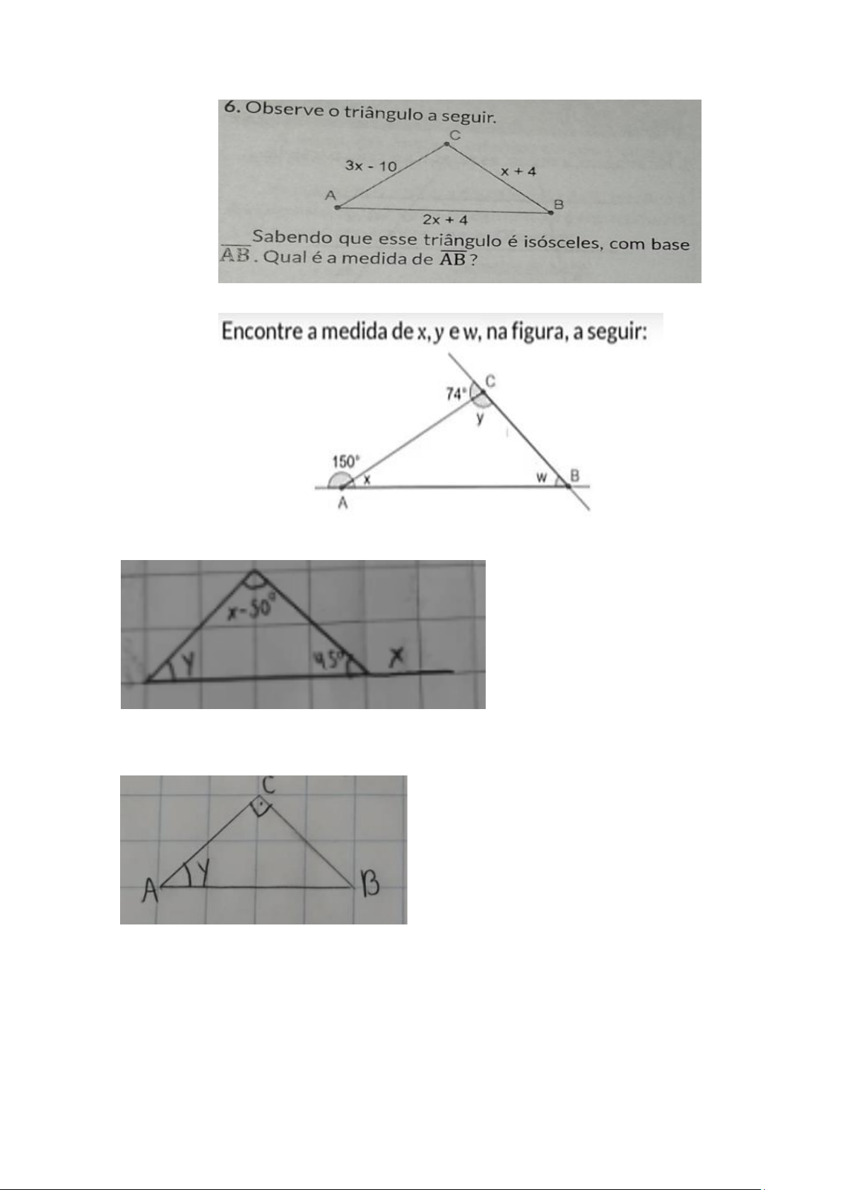 Questão 01: Questão 02: Questão 03: Observe o triângulo a seguir. Encontre os valores de x e y. Questão 04: O triângulo a seguir é isósceles de base AB determine o valor de y.