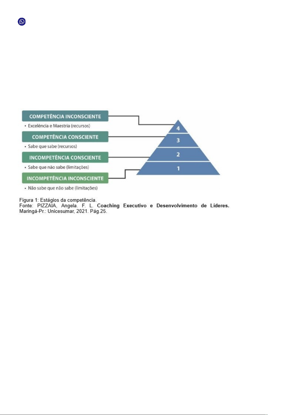 19.9.8773.4238 RESPOSTA - Esta atividade MAPA propõe que você embarque em uma viagem rumo ao universo do autoconhecimento e autogestão, aspectos fundamentais para o Coaching e para as organizações. Ter a capacidade de reflexão crítica sobre a própria trajetória, identificar a relação entre a teoria (estágios da competência) e a prática (vida acadêmica/profissional) e ser capaz de propor estratégias realistas para o desenvolvimento profissional, é essencial para uma atuação bem sucedida como administrador. Observe a figura a seguir. A figura apresentada demonstra os quatro estágios do processo de aprendizagem segundo Dilts et al. (1980): Incompetência Inconsciente, Incompetência Consciente, Competência Consciente e Competência Inconsciente. Fonte: DILTS, R. et al. Neuro-Linguistic Programming: the study of the structure of subjective experience. California: Meta Publications, v. 1, 1980. Proposta da atividade: Os Estágios da Competência e a Formação do Administrador Considerando sua trajetória acadêmica no curso de Administração e as competências exigidas no mercado de trabalho atual, elabore um texto dissertativo (mínimo de 20 linhas) respondendo às seguintes questões: 1. Como você identifica, em sua experiência acadêmica e prática, situações em que esteve em cada um dos quatro estágios da competência? 2. De que forma a passagem por esses estágios contribuiu (ou ainda pode contribuir) para sua formação como futuro administrador? 3. Escolha uma habilidade essencial para a carreira administrativa (por exemplo: liderança, negociação, gestão de pessoas, planejamento estratégico ou tomada de decisão) e descreva em qual estágio você acredita estar atualmente. 4. Quais estratégias pessoais e profissionais podem ser utilizadas para alcançar a Competência Inconsciente (maestria) nessa habilidade escolhida? Orientações gerais: Para esta atividade, você deverá utilizar o formulário padrão que está disponível no ícone “Material da Disciplina”. Considere as orientações para a atividade MAPA, acessando o link do vídeo explicativo. Não se esqueça de que este é um trabalho acadêmico. Assim, observe as Normas ABNT. Atenção: se identificado plágio (cópia indevida de textos pesquisados, ou cópia textual entre colegas) a atividade poderá ser zerada. Anexe o arquivo no campo de resposta da atividade MAPA, clicando sobre o botão Selecionar arquivo. Após anexar o arquivo, certifique-se de que se trata do arquivo correto, clique no botão Responder e, posteriormente, em Finalizar Questionário (após "Finalizar o Questionário", não será possível reenviar a atividade ou realizar qualquer modificação no arquivo enviado). Tendo dúvidas, não deixe de encaminhá-las por meio do "Fale com o Mediador". Bons estudos! Em caso de dúvidas, encaminhar mensagens pelo Fale com o Mediador! MAPA - ADM - COACHING EXECUTIVO E DESENVOLVIMENTO DE LÍDERES - 54_2025 019 Assessoria Acadêmica Assessoria especializada em atividades Unicesumar A 019 Assessoria representa a alternativa perfeita para estudantes universitários que almejam aprimorar seu rendimento acadêmico e alcançar resultados concretos. Nossa atuação pauta-se em uma abordagem prática e estratégica, voltada à estruturação eficiente da rotina de estudos, à preparação cuidadosa para avaliações e à oferta de um acompanhamento personalizado, moldado conforme as particularidades de cada aluno. O grande diferencial de nossa proposta reside no atendimento singular, que busca compreender em profundidade as dificuldades individuais e desenvolver métodos verdadeiramente eficazes. Mais do que simplesmente auxiliá-lo na superação de obstáculos, nossa missão consiste em tornar a trajetória acadêmica mais leve, organizada e produtiva, fomentando, simultaneamente, o desenvolvimento pessoal e profissional. Se o seu objetivo é vivenciar a universidade com serenidade, confiança e segurança, permita que a 019 Assessoria conduza sua caminhada acadêmica rumo a uma experiência plena de êxito e realização. CONHEÇA NOSSAS REDES SOCIAIS INSTAGRAM: @019assessoriaacademica SITE: www.019assessoriacademica.com.br CONTE CONOSCO PARA REALIZAR O SEU SONHO 019 Assessoria Acadêmica ☛ ☛ ☎ (019) 9 8773.4238 ☎ ☚ ☚ ☛ ☛ ☎ (019) 9 8773.4238 ☎ ☚ ☚ ☛ ☛ ☎ (019) 9 8773.4238 ☎ ☚ ☚ ☛ ☛ ☎ (019) 9 8773.4238 ☎ ☚ ☚ ☛ ☛ ☎ (019) 9 8773.4238 ☎ ☚ ☚ image1.png image2.jpeg