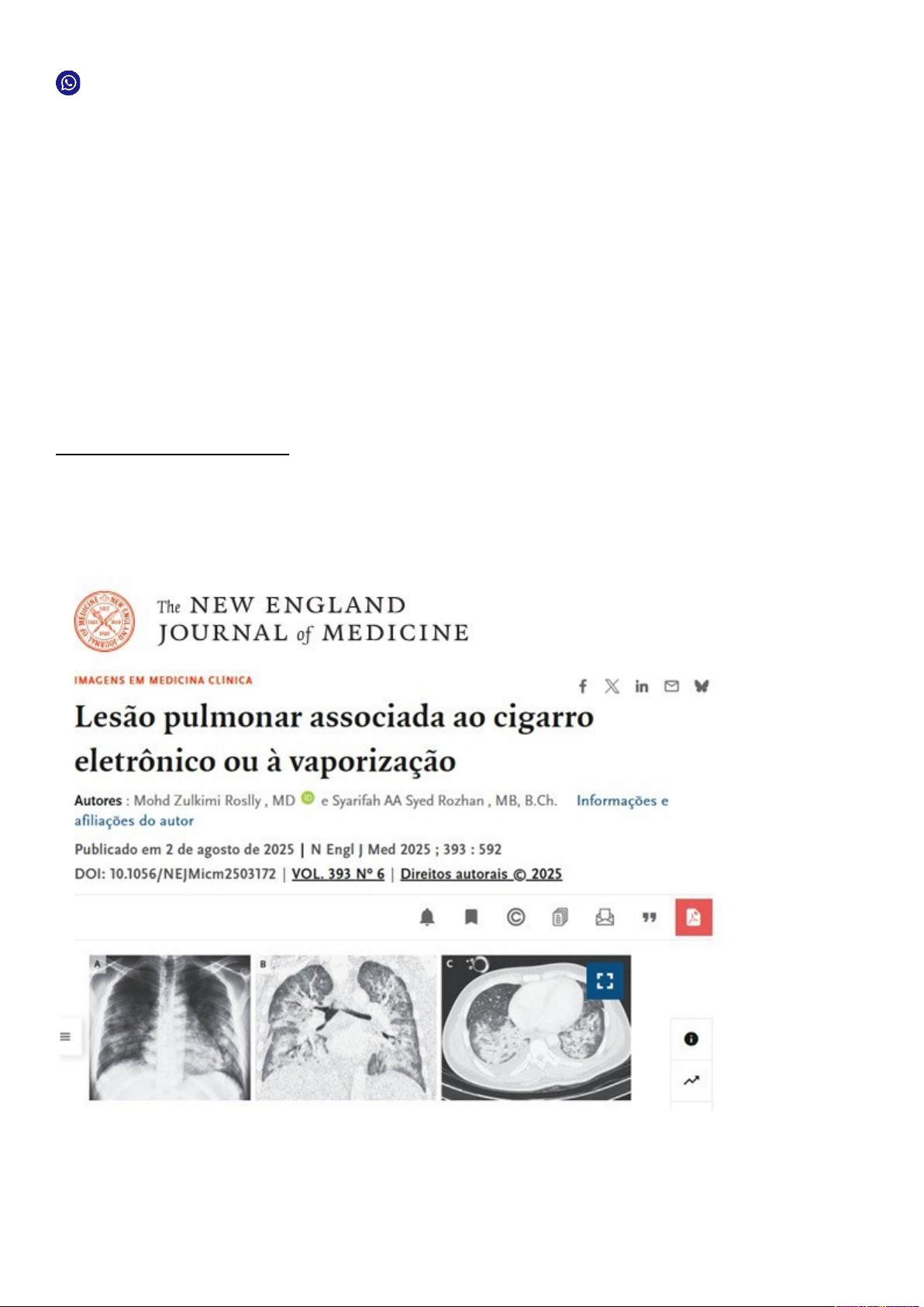 19.9.8773.4238 RESPOSTA - M.A.P.A. DA DISCIPLINA DE FISIOLOGIA HUMANA Olá, estudante! Seja bem-vindo (a) à atividade de M.A.P.A. (Material de Avaliação Prática de Aprendizagem) da disciplina de FISIOLOGIA HUMANA. Instruções iniciais: Utilize o formulário de M.A.P.A. padrão para realizar esta atividade. Ele se encontra em "Material da Disciplina". Siga todas as instruções constantes neste modelo. Assista ao vídeo com as instruções para a realização do M.A.P.A., que está na "Sala do Café". CONTEXTUALIZAÇÃO Leia o relato de caso publicado no periódico científico New England Journal of Medicine (2025) e um relatório do Centro de Controle de Doenças (CDC) dos Estados Unidos (2019) e depois faça o que se pede: TEXTO 1 – RELATO DE CASO Um homem de 27 anos com um longo histórico de asma apresentou-se ao departamento de emergência com um histórico de 5 dias de febre, vômito, diarreia, dispneia e hemoptise (tosse com sangue). Um ano antes da apresentação, ele havia trocado o hábito de fumar cigarros de tabaco pelo de vaporizar. Ele também trabalhava em uma loja de cigarros eletrônicos, onde foi exposto a vapores de cigarros eletrônicos indiretamente. A frequência respiratória era de 44 respirações por minuto e a saturação de oxigênio era de 83% enquanto o paciente respirava ar ambiente. No exame físico, foram observadas crepitações em ambos os pulmões. Foi realizada a intubação endotraqueal. Uma radiografia do tórax mostrou consolidações irregulares em ambos os lados (Imagem A). A tomografia computadorizada do tórax revelou consolidações e opacidades em vidro fosco em ambos os pulmões, (Imagem B), bem como derrames pleurais em ambos os lados, com maior quantidade de líquido à direita do que à esquerda (Imagem C). O exame do soro e do líquido do lavado broncoalveolar (LBA) foi negativo para doenças infecciosas e condições reumatológicas. O teste do fluido do LBA para acetato de vitamina E e tetrahidrocanabinol - duas substâncias presentes nos óleos de vaporização que estão associadas a lesões pulmonares - não estava disponível. Foi feito um diagnóstico de lesão pulmonar associada ao cigarro eletrônico ou à vaporização (EVALI). Foi iniciado o tratamento com um curso gradual de glicocorticoides sistêmicos por quatro semanas. O paciente foi extubado após um mês e recebeu alta sem necessidade de suplementação de oxigênio. Dados de referência: Valor normal da frequência respiratória para adultos: 12 a 20 mrm (movimentos respiratórios por minuto) (American Heart Association, 2015) Valor normal da Saturação de oxigênio: mínimo 89% (American Thoracic Society, 2021) Crepitações pulmonares: sons respiratórios curtos e interrompidos, associados a distúrbios pulmonares (MSD Manuals). Fonte: ROSLLY, Mohd Zulkimi et al. E-Cigarette–or Vaping-Associated Lung Injury. New England Journal of Medicine, 2025. Disponível em: https://www.nejm.org/doi/full/10.1056/NEJMicm2503172 TEXTO 2 – RELATÓRIO CDC - EUA Características dos pacientes que sofreram reinternação ou morte após a alta hospitalar em um surto nacional de Lesão Pulmonar Associada a Produto de Vaping ou Cigarro Eletrônico (EVALI, e-cigarette or vaping, product use–associated lung injury) Estados Unidos, 2019 Fonte: Morbidity and Mortality Weekly Report (MMWR). Centers for Disease Control and Prevention. Disponível em: https://www.cdc.gov/mmwr/volumes/68/wr/mm685152e1.htm?s_cid=mm685152e1_w; https://www.cdc.gov/mmwr/volumes/68/wr/mm685152e2.htm?s_cid=mm685152e2_w Um relatório e uma orientação clínica nos Relatórios Semanais de Morbidade e Mortalidade do Centro de Controle de Doenças (CDC) enfatizam o risco de morte ou hospitalização recorrente devido à lesão pulmonar associada ao uso de cigarros eletrônicos (EVALI). Entre os 1139 pacientes com EVALI que receberam alta em ou antes de 31 de outubro de 2019, 31 (2,7%) foram reinternados em uma média de 4 dias após a alta e com metade dos eventos ocorrendo entre 2 e 20 dias após a alta. Sete pacientes, cinco dos quais eram mulheres, morreram fora do hospital. Todos os pacientes que morreram estavam em uma unidade de terapia intensiva (UTI) durante a hospitalização. As mortes ocorreram em uma média de 3 dias após a alta. A idade média dos pacientes que morreram após a alta foi de 54 anos, em comparação com 23 anos entre os pacientes sem reinternações. Os pacientes com EVALI que precisaram de reinternação ou que morreram após a alta tinham maior probabilidade de ter doença cardíaca, doença pulmonar obstrutiva crônica (DPOC), apneia obstrutiva do sono (AOS), diabetes mellitus e múltiplas comorbidades crônicas. A orientação clínica recomenda que os profissionais de saúde trabalhem com a equipe apropriada para garantir que todos os pacientes que receberem alta após o tratamento para EVALI sejam reavaliados em 48 horas, especialmente aqueles que estiveram em uma UTI, tenham redes de apoio social para monitorar sua saúde, para garantir que os medicamentos após a alta, como glicocorticoides em redução gradual e medicamentos para condições comórbidas conhecidas, sejam tomados adequadamente e que eles não retomem o uso de vaporizadores ou tabaco combustível. A orientação atualizada recomenda o acompanhamento ambulatorial pós-hospitalização, de preferência dentro de 48 horas após a alta, e enfatiza a importância da preparação para a alta hospitalar e a coordenação do atendimento pós-alta para reduzir o risco de reinternação e morte entre os pacientes EVALI hospitalizados. Referências complementares para realização da atividade: Livro didático da disciplina. Maria Fernanda Piffer Tomasi Baldez da Silva. Fisiologia Humana. -Florianópolis, SC: Arqué, 2023. SILVERTHORN, Dee U. Fisiologia humana. 7. ed. Porto Alegre: ArtMed, 2017. E-book. p.536. ISBN 9788582714041. Disponível em: https://app.minhabiblioteca.com.br/reader/books/9788582714041/. BRITO, Do