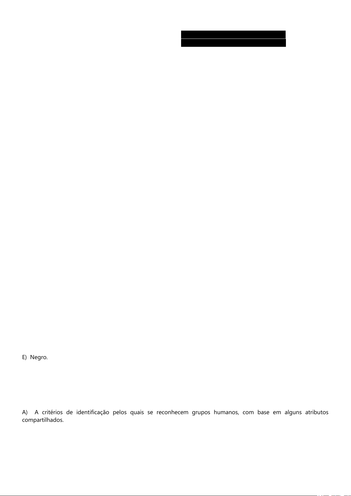 IMPORTANTE Data limite para aplicação desta prova: 06/12/2025 UNIP EAD Código da Prova: 125718449381 Curso: SUP TEC EM GESTÃO PÚBLICA Série: 4 Tipo: Substitutiva Aluno: 2148196 - WESLEN RAMOS RODRIGUES I - Questões objetivas – valendo 10 pontos Gerada em: 05/12/2025 às 18h35 ------------------------------------------------------------------------------------------------------------ Instruções para a realização da prova: 1. Leia as questões com atenção. 2. Confira seu nome e RA e verifique se o caderno de questão e folha de respostas correspondem à sua disciplina. 3. Faça as marcações primeiro no caderno de questões e depois repasse para a folha de respostas. 4. Serão consideradas somente as marcações feitas na folha de respostas. 5. Não se esqueça de assinar a folha de respostas. 6. Utilize caneta preta para preencher a folha de respostas. 7. Preencha todo o espaço da bolha referente à alternativa escolhida, a caneta, conforme instruções: não rasure, não preencha X, não ultrapasse os limites para preenchimento. 8. Preste atenção para não deixar nenhuma questão sem assinalar. 9. Só assinale uma alternativa por questão. 10. Não se esqueça de responder às questões discursivas, quando houver, e de entregar a folha de respostas para o tutor do polo presencial, devidamente assinada. 11. Não é permitido consulta a nenhum material durante a prova, exceto quando indicado o uso do material de apoio. 12. Lembre-se de confirmar sua presença através da assinatura digital (login e senha). Boa prova! ------------------------------------------------------------------------------------------------------------ Questões de múltipla escolha Disciplina: 804120 - RELAÇÕES ÉTNICO-RACIAIS E AFRODESCENDÊNCIA Questão 1: Tendo em vista a problemática das relações raciais, o termo raça tomou uma perspectiva política para definir anseios e lutas na sociedade brasileira, do movimento: A) Sindical. B) Juvenil. C) Dos profissionais da educação. D) Feminista das mulheres negras. E) Negro. Questão 2: Na unidade I estudamos um conceito muito importante para a compreensão das relações étnico- raciais: o conceito de etnia, que diz respeito, fundamentalmente: Assinale a resposta correta: A) A critérios de identificação pelos quais se reconhecem grupos humanos, com base em alguns atributos compartilhados. B) A alguns fatores biológicos pelos quais os homens se distinguem uns dos outros, como a cor da pele ou traços fisionômicos. C) Aos valores culturais de alguns grupos sociais que os cientistas sociais classificam e julgam superiores aos de outros grupos. D) A critérios científicos e objetivos, a partir dos quais se pode justificar com mais rigor a reivindicação de superioridade cultural. Weslen Ramos Realce Weslen Ramos Realce E) Às variações genéticas que vêm caracterizando, ao longo da história, os mais diferentes agrupamentos humanos. Questão 3: Tendo em vista que a cultura indígena baseava-se na caça, na pesca, na extração e em pequenas plantações, os portugueses resolveram trazer negros africanos de Angola e do Congo para trabalharem na agricultura, pois esses povos: A) Eram exímios comerciantes. B) Mantinham-se na passividade diante da autoridade europeia. C) Eram grandes produtores agrícolas e dominavam as tecnologias do plantio. D) Superavam em muito a agilidade física dos índios brasileiros. E) Nenhuma alternativa justifica o interesse português pelos africanos. Questão 4: Para responder à questão, leia o trecho da música “Haiti”, de Caetano Veloso: “Quando você for convidado pra subir no adro Da fundação casa de Jorge Amado Pra ver do alto a fila de soldados, quase todos pretos Dando porrada na nuca de malandros pretos De ladrões mulatos e outros quase brancos Tratados como pretos Só pra mostrar aos outros quase pretos (E são quase todos pretos) E aos quase brancos pobres como pretos Como é que pretos, pobres e mulatos E quase brancos quase pretos de tão pobres são tratados E não importa se os olhos do mundo inteiro Possam estar por um momento voltados para o largo Onde os escravos eram castigados E hoje um batuque um batuque Com a pureza de meninos uniformizados de escola secundária Em dia de parada E a grandeza épica de um povo em formação Nos atrai, nos deslumbra e estimula Não importa nada: Nem o traço do sobrado Nem a lente do fantástico, Nem o disco de Paul Simon Ninguém, ninguém é cidadão Se você for a festa do pelô, e se você não for Pense no Haiti, reze pelo Haiti O Haiti é aqui, O Haiti não é aqui” Assinale a única alternativa cujo tema não mostra relação com o teor da música: A) Racismo. B) Geografia física. C) Cidadania. D) Diferenças étnico-raciais. E) Violência policial. Questão 5: Observe a ilustração e o gráfico em seguida: Ilustração 1 Weslen Ramos Realce Weslen Ramos Realce Gráfico 1 A primeira ilustração é de um livro didático muito antigo, de 1975, enfatizando a figura de uma negra na posição de empregada doméstica. Os dados são recentes, de 2009, e confirmam que a maioria das mulheres negras ocupa cargo de doméstica. Com base nessas informações, reflita a respeito das seguintes afirmações: I - Não é possível estabelecer relação entre a ilustração e o gráfico apresentados, pois, no livro didático, trata-se de uma situação fictícia e, no gráfico do IBGE, os dados são levantados a partir da realidade. II - Professores devem estar atentos para os estereótipos presentes nos livros didáticos, uma vez que suas ilustrações podem expressar, induzir ou reforçar preconceitos raciais. III - Tanto a ilustração quanto o gráfico indicam que são as mulheres negras quem continuam a desempenhar, em sua maioria, as tarefas domésticas no Brasil, como uma espécie de "continuidade" da condição das escravas negras do Brasil colonial. IV - Em todas as regiões do Brasil, as mulheres negras continuam a desempenhar as funções do