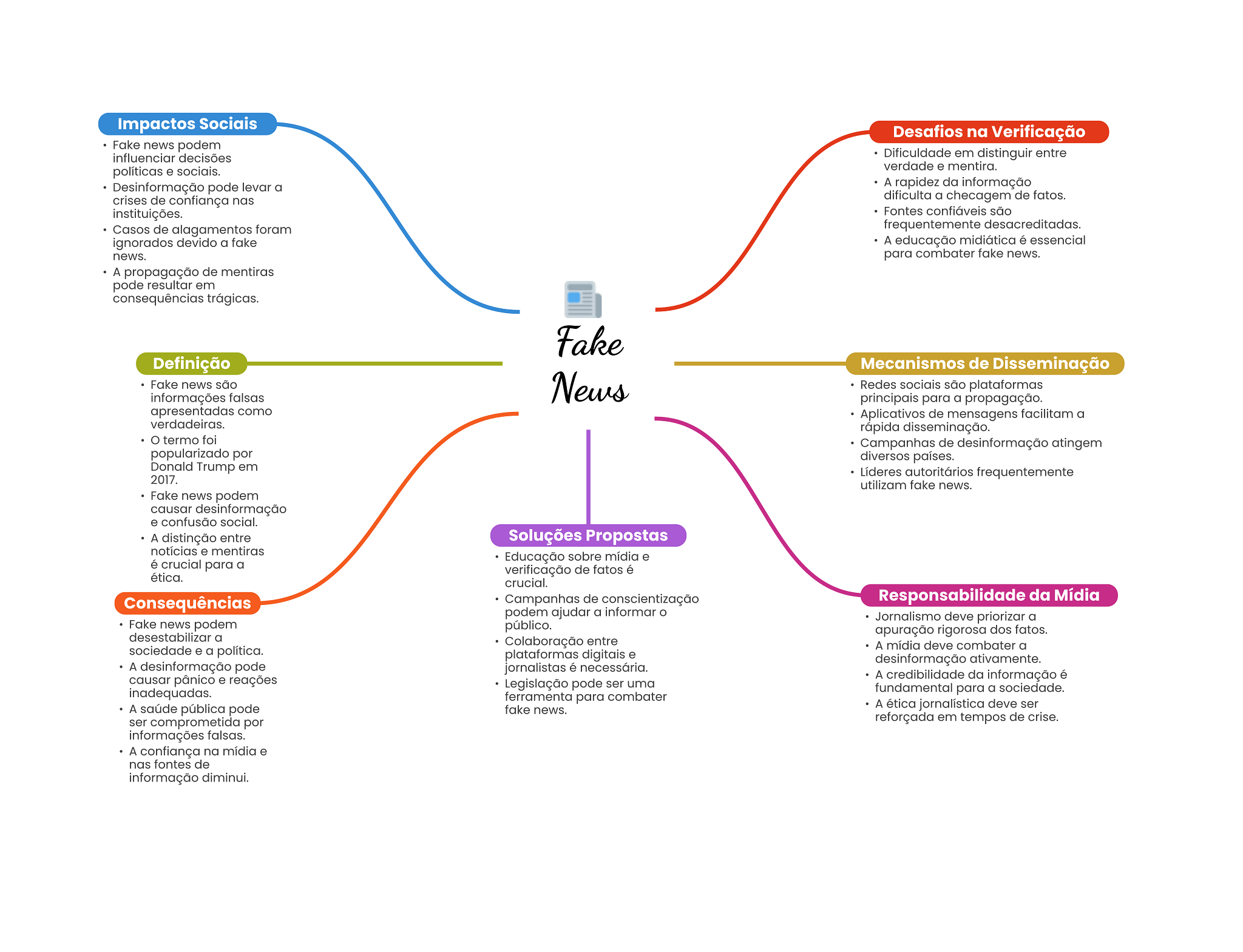 Impactos Sociais Desafios na Verificação Fake news podem decisões Dificuldade em distinguir entre políticas e sociais. verdade e mentira. Desinformação pode levar a A rapidez da informação crises de confiança nas dificulta a checagem de fatos. instituições. Fontes confiáveis são Casos de alagamentos foram frequentemente desacreditadas. ignorados devido a fake A educação midiática é essencial news. para combater fake news. A propagação de mentiras pode resultar em consequências trágicas. Fake Definição Mecanismos de Disseminação Fake news são News Redes sociais são plataformas informações falsas principais para a propagação. apresentadas como Aplicativos de mensagens facilitam a verdadeiras. rápida disseminação. termo foi Campanhas de desinformação atingem popularizado por diversos países. Donald Trump em Líderes autoritários frequentemente 2017. utilizam fake news. Fake news podem causar desinformação e confusão social. A distinção entre Soluções Propostas notícias e mentiras Educação sobre mídia e é crucial para a verificação de fatos é ética. crucial. Consequências Campanhas de conscientização Responsabilidade da Mídia podem ajudar a informar O Jornalismo deve priorizar a Fake news podem público. apuração rigorosa dos fatos. desestabilizar a Colaboração entre sociedade e a política. A mídia deve combater a plataformas digitais e desinformação ativamente. A desinformação pode jornalistas é necessária. causar pânico e reações A credibilidade da informação é Legislação pode ser uma inadequadas. fundamental para a sociedade. ferramenta para combater A saúde pública pode fake news. A ética jornalística deve ser ser comprometida por reforçada em tempos de crise. informações falsas. A confiança na mídia e nas fontes de informação diminui.