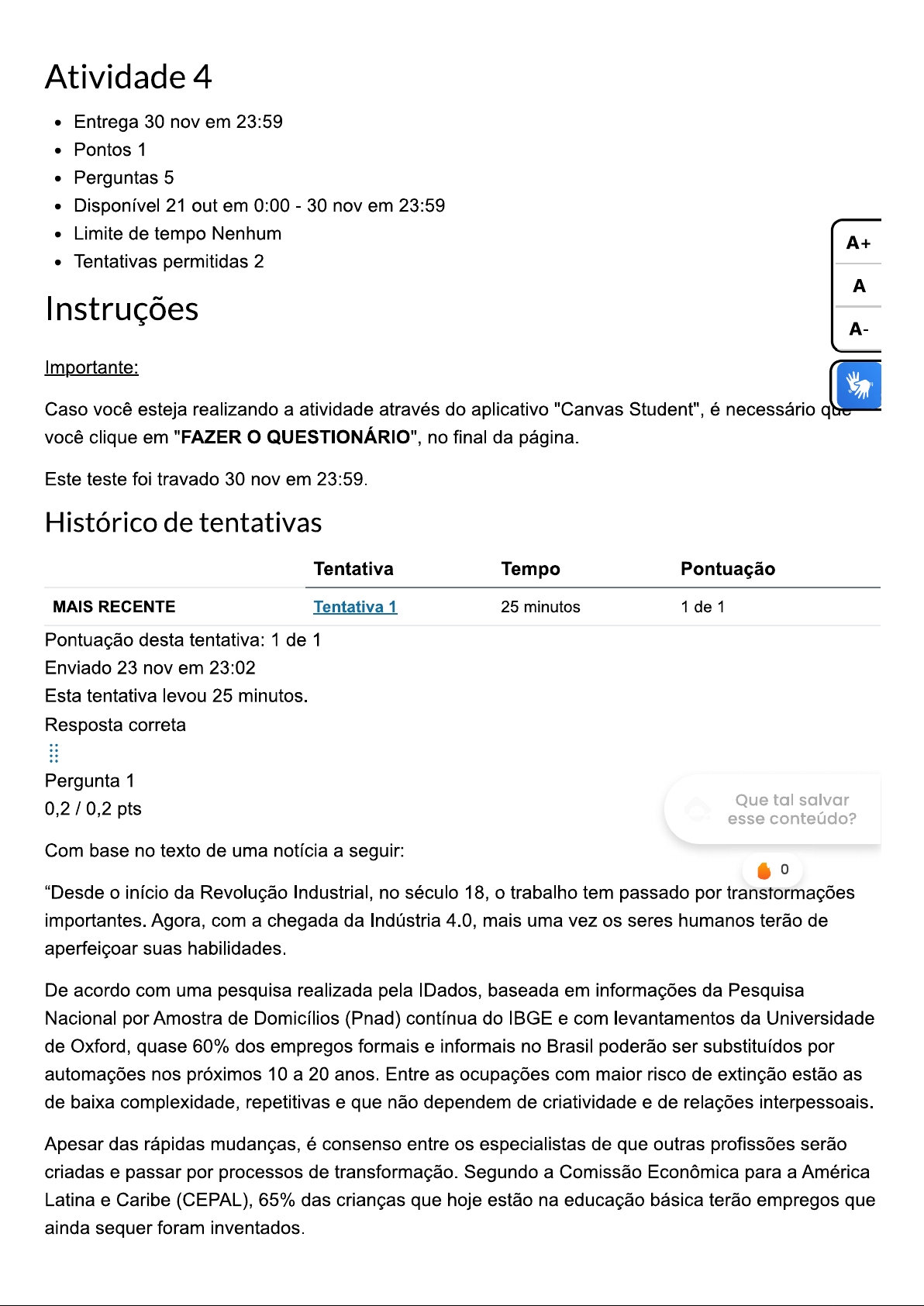 Atividade 4 Entrega 30 nov em 23:59 Pontos 1 Perguntas 5 Disponível 21 out em 0:00 30 nov em 23:59 Limite de tempo Nenhum A+ Tentativas permitidas 2 A Instruções A- Importante: Caso você esteja realizando a atividade através do aplicativo "Canvas Student", é necessário que você clique em "FAZER QUESTIONÁRIO", no final da página. Este teste foi travado 30 nov em 23:59. Histórico de tentativas Tentativa Tempo Pontuação MAIS RECENTE Tentativa 1 25 minutos 1 de 1 Pontuação desta tentativa: 1 de 1 Enviado 23 nov em 23:02 Esta tentativa levou 25 minutos. Resposta correta Pergunta 1 0,2 / 0,2 pts Que tal salvar esse conteúdo? Com base no texto de uma notícia a seguir: 0 "Desde início da Revolução Industrial, no século 18, trabalho tem passado por importantes. Agora, com a chegada da Indústria 4.0, mais uma vez os seres humanos terão de aperfeiçoar suas habilidades. De acordo com uma pesquisa realizada pela IDados, baseada em informações da Pesquisa Nacional por Amostra de Domicílios (Pnad) contínua do IBGE e com levantamentos da Universidade de Oxford, quase 60% dos empregos formais e informais no Brasil poderão ser substituídos por automações nos próximos 10 a 20 anos. Entre as ocupações com maior risco de extinção estão as de baixa complexidade, repetitivas e que não dependem de criatividade e de relações interpessoais. Apesar das rápidas mudanças, é consenso entre os especialistas de que outras profissões serão criadas e passar por processos de transformação. Segundo a Comissão Econômica para a América Latina e Caribe (CEPAL), 65% das crianças que hoje estão na educação básica terão empregos que ainda sequer foram inventados.Todo esse cenário está exigindo que os trabalhadores passem por adaptações para se manterem relevantes no mercado. Entre as principais medidas que os profissionais devem tomar está o investimento em educação continuada, treinamento e capacitações. Além disso, é fundamental trabalhar o desenvolvimento de habilidades como comunicação, liderança e empatia, competências que máquina alguma conseguirá substituir. Pensando em esclarecer as mudanças das carreiras do futuro e como as pessoas terão de se adaptar às novas exigências do mercado de trabalho, especialistas abordarão o tema durante A+ painel "Lifelong learning. A importância do aprendizado ao longo da vida e por que isso importa A que aconteceu no dia 17 de outubro de 2019 durante IT Forum X. A edição do evento rece mais de 250 palestrantes em diferentes palcos e praças de conteúdo. tema principal desse e A- foi "Eu 5.0", que busca posicionar ser humano no centro da discussão tecnológica." Fonte: Computerworld. Sua carreira está mudando. O que você pode fazer a respeito? 14/10/2 Disponível em: voce-pode-fazer-a-respeito/ Acesso em: 20 de fevereiro de 2020. Com base no texto acima, observamos as mudanças drásticas em nossos objetivos profissionais, e um deles serão as certificações, como a Cisco como uma base importante nesse aspecto. A partir disso, e considerando as informações apresentadas, assinale a opção correta. Os profissionais operacionais técnicos da área de redes de computadores, com base na evolução profissional, precisam somente ser certificado no PMBOK em Cobit 5. Os profissionais de redes de computadores deverão buscar sempre novas atualizações e as certificações CCENT (Cisco Certified Entry Networking Technician) ou também chamada de CCNA ICND1, CCDA Cisco Certified Design Associate e CCDP Cisco Certified Design Professional. Alternativa correta. Considerando o texto, os profissionais de redes de com Que tal salvar esse conteúdo? buscar sempre novas atualizações e as certificações como CCENT ou tamb ICND1, CCDA Cisco Certified Design Associate -, que é destinada a engenheiros d- de rede e CCDP Cisco Certified Design Professional -, que cria conhecimento avançado conceitos e princípios de design de rede necessários para desenvolver arquiteturas corporativas e componentes de rede de várias camadas." Os profissionais operacionais técnicos da área de redes de computadores, com base na evolução profissional, precisam ser certificados no CMMI e ITIL, dando a este profissional total capacidade para gerenciar um projeto de redes e atualização sobre isso. Os profissionais de redes de computadores deverão buscar sempre novas atualizações e a certificação CCDA Cisco Certified Design Associate -, que tem como objetivo está destinado para pessoal de instalação técnica nos projetos de redes, suficiente para a profissão.Os profissionais de redes de computadores deverão buscar sempre novas atualizações e a Certificação CISCO em CMMI Capability Maturity Model Integration ou Modelo Integrado de Maturidade em Capacitação -, para a sua formação e atualização completa. Resposta correta Pergunta 2 0,2 / 0,2 pts A+ Leia o texto a seguir: A "COBIT 5" Control Objectives for Information and related Technology sendo seu significado A- estrutura para fornecimento da governança de TI, criada pela ISACA (Information Systems Audit and Control Association) e tem como principal objetivo a geração de valores para as seus processos, além da efetivação da confiança de TI para a companhia. Tem 4 objetivos básicos para a sua aplicação em projetos de TIC alinhados com a governança corporativa. Considerando as informações apresentadas, avalie as asserções a seguir, e a relação entre elas: I. framework Cobit 5 trará para profissional de TIC as melhores práticas de mercado para o gerenciamento dos projetos desta área, com base nos aperfeiçoamentos das práticas e experiências de mercado. PORQUE Que tal salvar esse conteúdo? II. Melhores práticas de mercado para gerenciamento dos projetos nos traz benefícios importantes como: Domínio sobre os requisitos de negócios, alinhados com a visão holística e os objetivos da corporação. Gestão e administração dos recursos de TIC p