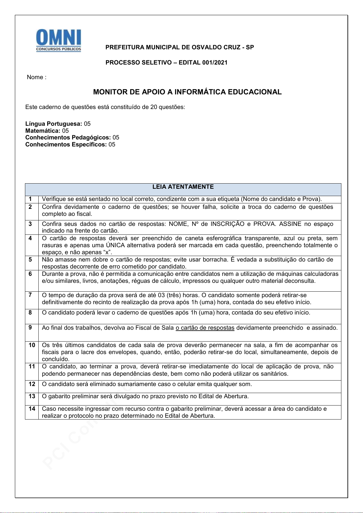 pcimarkpci MDAwMDowMDAwOjAwMDA6MDAwMDowMDAwOmZmZmY6YjE4ODpiNjRm:U3VuLCAwNyBEZWMgMjAyNSAxMzo0MzozOCAtMDMwMA== www.pciconcursos.com.br PREFEITURA MUNICIPAL DE OSVALDO CRUZ - SP PROCESSO SELETIVO – EDITAL 001/2021 Nome : MONITOR DE APOIO A INFORMÁTICA EDUCACIONAL Este caderno de questões está constituído de 20 questões: Língua Portuguesa: 05 Matemática: 05 Conhecimentos Pedagógicos: 05 Conhecimentos Específicos: 05 LEIA ATENTAMENTE 1 Verifique se está sentado no local correto, condizente com a sua etiqueta (Nome do candidato e Prova). 2 Confira devidamente o caderno de questões; se houver falha, solicite a troca do caderno de questões completo ao fiscal. 3 Confira seus dados no cartão de respostas: NOME, Nº de INSCRIÇÃO e PROVA. ASSINE no espaço indicado na frente do cartão. 4 O cartão de respostas deverá ser preenchido de caneta esferográfica transparente, azul ou preta, sem rasuras e apenas uma ÚNICA alternativa poderá ser marcada em cada questão, preenchendo totalmente o espaço, e não apenas “x”. 5 Não amasse nem dobre o cartão de respostas; evite usar borracha. É vedada a substituição do cartão de respostas decorrente de erro cometido por candidato. 6 Durante a prova, não é permitida a comunicação entre candidatos nem a utilização de máquinas calculadoras e/ou similares, livros, anotações, réguas de cálculo, impressos ou qualquer outro material de consulta. 7 O tempo de duração da prova será de até 03 (três) horas. O candidato somente poderá retirar-se definitivamente do recinto de realização da prova após 1h (uma) hora, contada do seu efetivo início. 8 O candidato poderá levar o caderno de questões após 1h (uma) hora, contada do seu efetivo início. 9 Ao final dos trabalhos, devolva ao Fiscal de Sala o cartão de respostas devidamente preenchido e assinado. 10 Os três últimos candidatos de cada sala de prova deverão permanecer na sala, a fim de acompanhar os fiscais para o lacre dos envelopes, quando, então, poderão retirar-se do local, simultaneamente, depois de concluído. 11 O candidato, ao terminar a prova, deverá retirar-se imediatamente do local de aplicação de prova, não podendo permanecer nas dependências deste, bem como não poderá utilizar os sanitários. 12 O candidato será eliminado sumariamente caso o celular emita qualquer som. 13 O gabarito preliminar será divulgado no prazo previsto no Edital de Abertura. 14 Caso necessite ingressar com recurso contra o gabarito preliminar, deverá acessar a área do candidato e realizar o protocolo no prazo determinado no Edital de Abertura. pcimarkpci MDAwMDowMDAwOjAwMDA6MDAwMDowMDAwOmZmZmY6YjE4ODpiNjRm:U3VuLCAwNyBEZWMgMjAyNSAxMzo0MzozOCAtMDMwMA== www.pciconcursos.com.br RASCUNHO RASCUNHO pcimarkpci MDAwMDowMDAwOjAwMDA6MDAwMDowMDAwOmZmZmY6YjE4ODpiNjRm:U3VuLCAwNyBEZWMgMjAyNSAxMzo0MzozOCAtMDMwMA== www.pciconcursos.com.br LÍNGUA PORTUGUESA 1)Assinale a única alternativa INCORRETA quanto ao emprego das regras de ortografia da língua portuguesa: a)Acidificante. b)Acensorista. c)Ascendência. d)Acidental. 2)Assinale a única alternativa que contém SOMENTE palavras derivadas: a)Renovar – inativo – adjunto. b)Ilegal – fumo – lapiseira. c)Lar – contradizer – antebraço. d)Carne – casa – entrelinha. 3) Assinale a única alternativa que NÃO corresponde a uma palavra formada a partir do processo de derivação parassintética: a)Desalmado. b)Repatriar. c)Amanhecer. d)Barbado. 4)Conforme Cunha & Cintra (2001, p. 369), “para indicarmos uma quantidade exata de pessoas ou coisas, ou para assinalarmos o lugar que elas ocupam numa série, empregamos uma classe especial de palavras – os numerais. Os numerais podem ser ‘cardinais’, ‘ordinais’, ‘multiplicativos’ e ‘fracionários’”. Com base nessa afirmação, assinale a única alternativa CORRETA quanto à classe dos numerais: a)Em “Essa era a trigésima vez que ele olhava o celular”, “trigésima” corresponde a um numeral cardinal. b)Em “Leonor tinha um terço da minha idade”, “um terço” corresponde a um numeral multiplicativo. c)Em “Celeste comprou a primeira edição daquele dicionário”, “primeira” corresponde a um numeral ordinal. d)Em “Arlete comprou somente três pães”, “três” corresponde a um numeral fracionário. 5)Assinale a única alternativa que NÃO corresponde a um substantivo coletivo: a)Elenco. b)Aventureiros. c)Legião. d)Caravana. MATEMÁTICA 6)O gráfico abaixo, apresenta o déficit habitacional no Brasil relativo aos domicílios particulares em 2015, levando em conta o âmbito nacional. Analisando o gráfico, a mediana dos dados encontrados, chega mais próximo do valor representado em qual ano? a)2008. b)2013. c)2014. d)2007. 7)Considere três retas 𝑟1, 𝑟2 e 𝑟3 , de forma que a reta 𝑟1 é perpendicular a ambas as retas 𝑟2 e 𝑟3 . Seja agora, uma quarta reta r, que intersecta a reta 𝑟1 formando um ângulo de 32°. Qual o ângulo obtuso formado pela reta r e as retas 𝑟2 e 𝑟3 respectivamente? a)112° e 32°. b)58° e 32°. c)112° e 112°. d)58° e 58°. 8)Considere dois números racionais, mas que não sejam números inteiros, marque a opção CORRETA em relação a esses dois números. a)O produto entre eles não pode ser um número inteiro. b)O quociente entre os dois é sempre um número racional. c)A soma entre eles pode ser um número inteiro. d)Se os dois forem positivos, a soma nunca dará zero. 9)Caio e Guilherme marcaram de correr juntos, como Caio chegou mais cedo onde marcaram, já começou a correr, percorrendo uma distância de 3,025 km, sozinho. Após a chegada de Guilherme, os dois percorreram juntos, uma distância igual a 12 km. Quantos quilômetros os dois percorreram juntos? a)15,025 km. b)3,035 km. c)4,225 km. d)3,145 km. 10)A operação de raiz quadrada, deixa como única exceção que o radicando seja não negativo. Dessa forma, assinale a opção que diz corretamente, a razão disto aconte