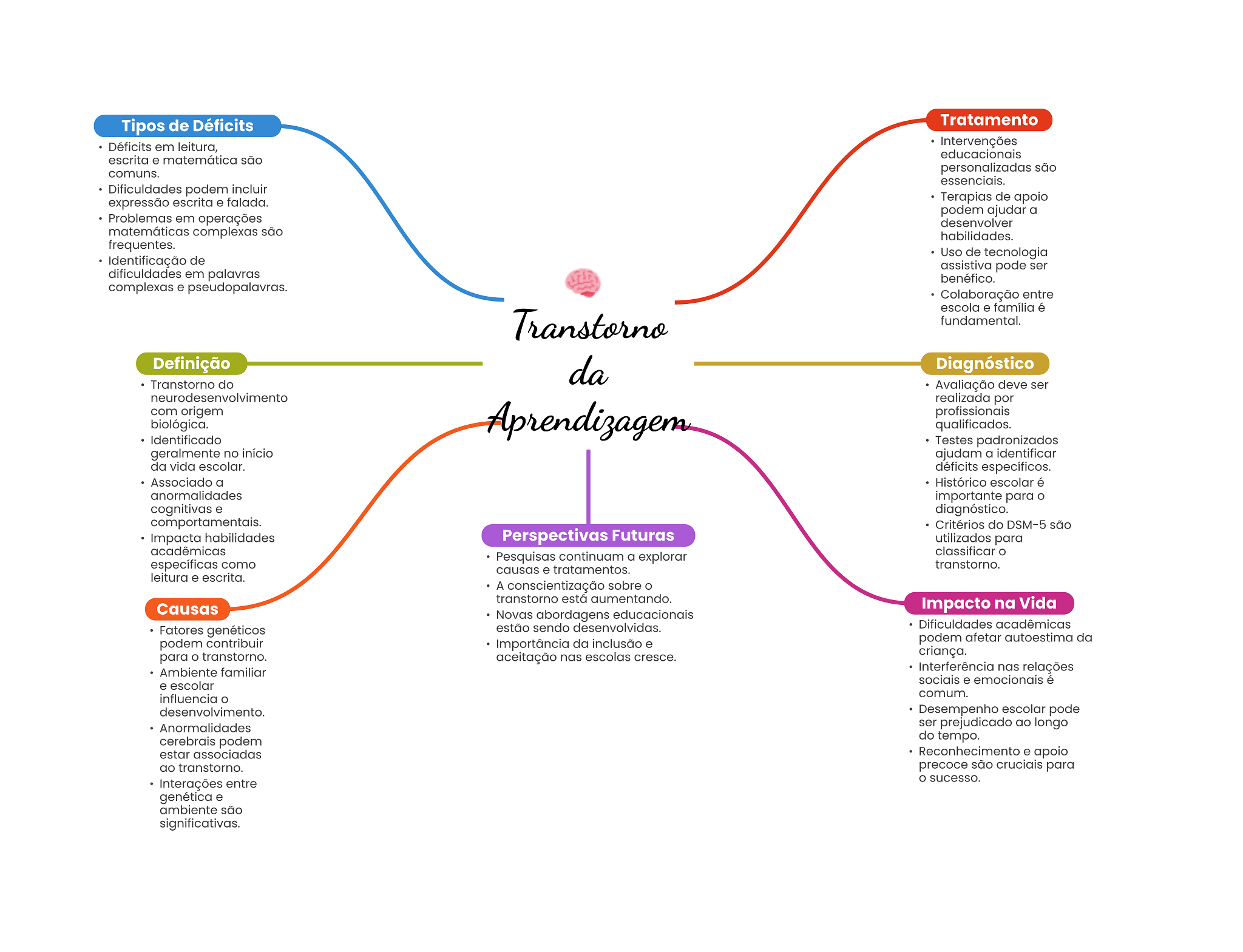 Tipos de Déficits Tratamento Déficits em leitura, Intervenções educacionais escrita e matemática são comuns. personalizadas são essenciais. Dificuldades podem incluir expressão escrita e falada. Terapias de apoio podem ajudar a Problemas em operações desenvolver matemáticas complexas são habilidades. frequentes. Uso de tecnologia Identificação de assistiva pode ser dificuldades em palavras benéfico. complexas e pseudopalavras. Colaboração entre escola e família é Transtorno fundamental. Definição da Diagnóstico Transtorno do Avaliação ser realizada por com origem biológica. Aprendizagem profissionais qualificados. Identificado Testes padronizados geralmente no início ajudam a identificar da vida escolar. déficits específicos. Associado a Histórico escolar é anormalidades importante para O cognitivas e diagnóstico. comportamentais. Critérios do DSM-5 são Impacta habilidades Perspectivas Futuras utilizados para acadêmicas classificar Pesquisas continuam a explorar específicas como causas e tratamentos. transtorno. leitura e escrita. A conscientização sobre transtorno está aumentando. Causas Impacto na Vida Novas abordagens educacionais Fatores genéticos estão sendo desenvolvidas. Dificuldades acadêmicas podem contribuir Importância da inclusão e podem afetar autoestima da para transtorno. aceitação nas escolas cresce. criança. Ambiente familiar Interferência nas relações sociais e emocionais é e escolar influencia comum. desenvolvimento. Desempenho escolar pode Anormalidades ser prejudicado ao longo cerebrais podem do tempo. estar associadas Reconhecimento e apoio ao transtorno. precoce são cruciais para sucesso. Interações entre genética e ambiente são significativas.