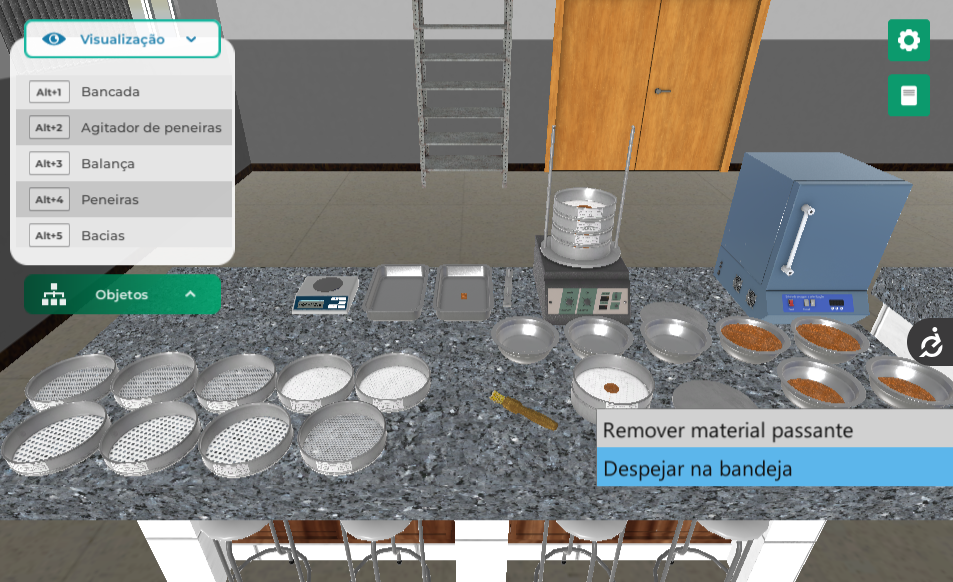 Visualização Alt+1 Bancada Alt+2 Agitador de peneiras Alt+3 Balança Alt+4 Peneiras Alt+5 Bacias Objetos " Remover material passante Despejar na bandeja