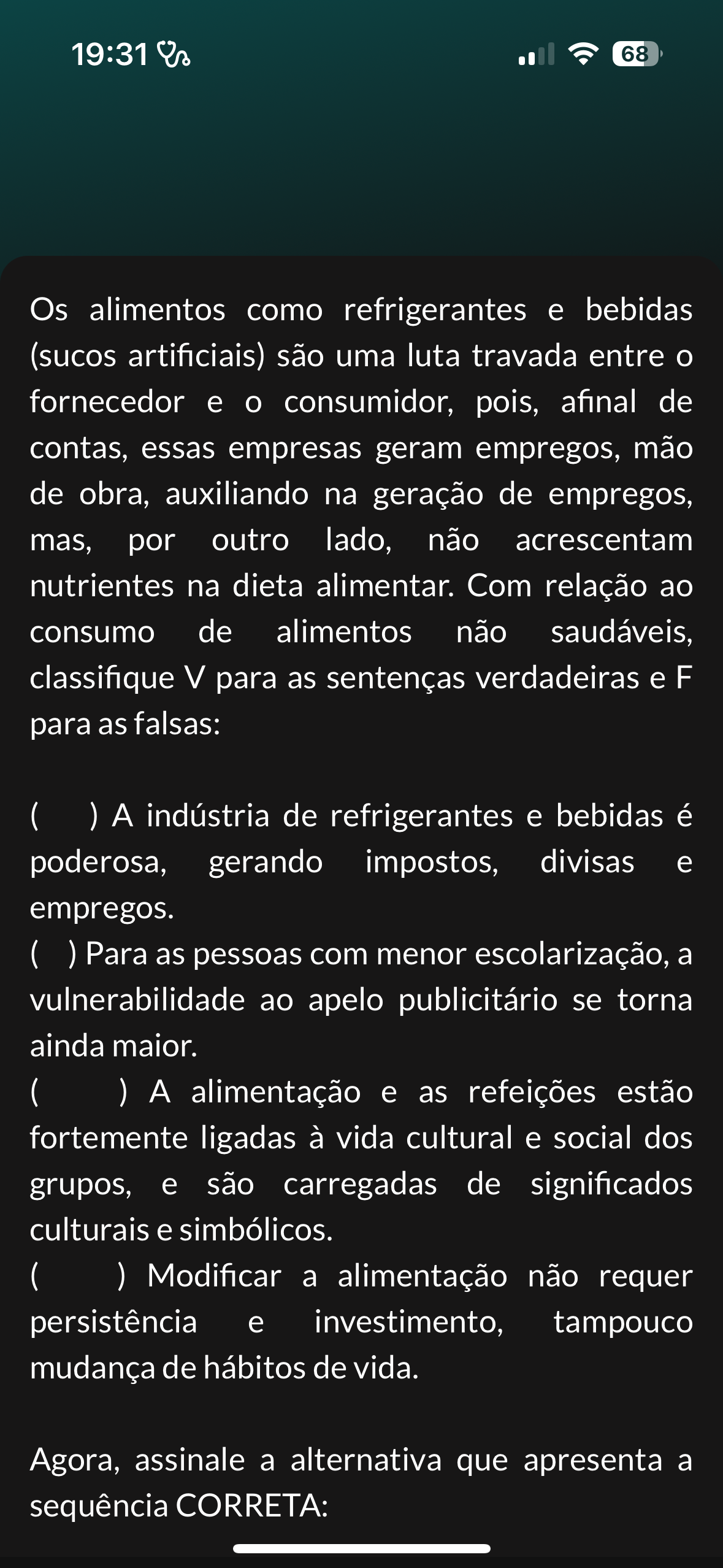 19:31 68 Os alimentos como refrigerantes e bebidas (sucos artificiais) são uma luta travada entre fornecedor e consumidor, pois, afinal de contas, essas empresas geram empregos, mão de obra, auxiliando na geração de empregos, mas, por outro lado, não acrescentam nutrientes na dieta alimentar. Com relação ao consumo de alimentos não saudáveis, classifique V para as sentenças verdadeiras e F para as falsas: ( ) A indústria de refrigerantes e bebidas é poderosa, gerando impostos, divisas e empregos. ( ) Para as pessoas com menor escolarização, a vulnerabilidade ao apelo publicitário se torna ainda maior. ( ) A alimentação e as refeições estão fortemente ligadas à vida cultural e social dos grupos, e são carregadas de significados culturais e simbólicos. ( ) Modificar a alimentação não requer persistência e investimento, tampouco mudança de hábitos de vida. Agora, assinale a alternativa que apresenta a sequência CORRETA:
