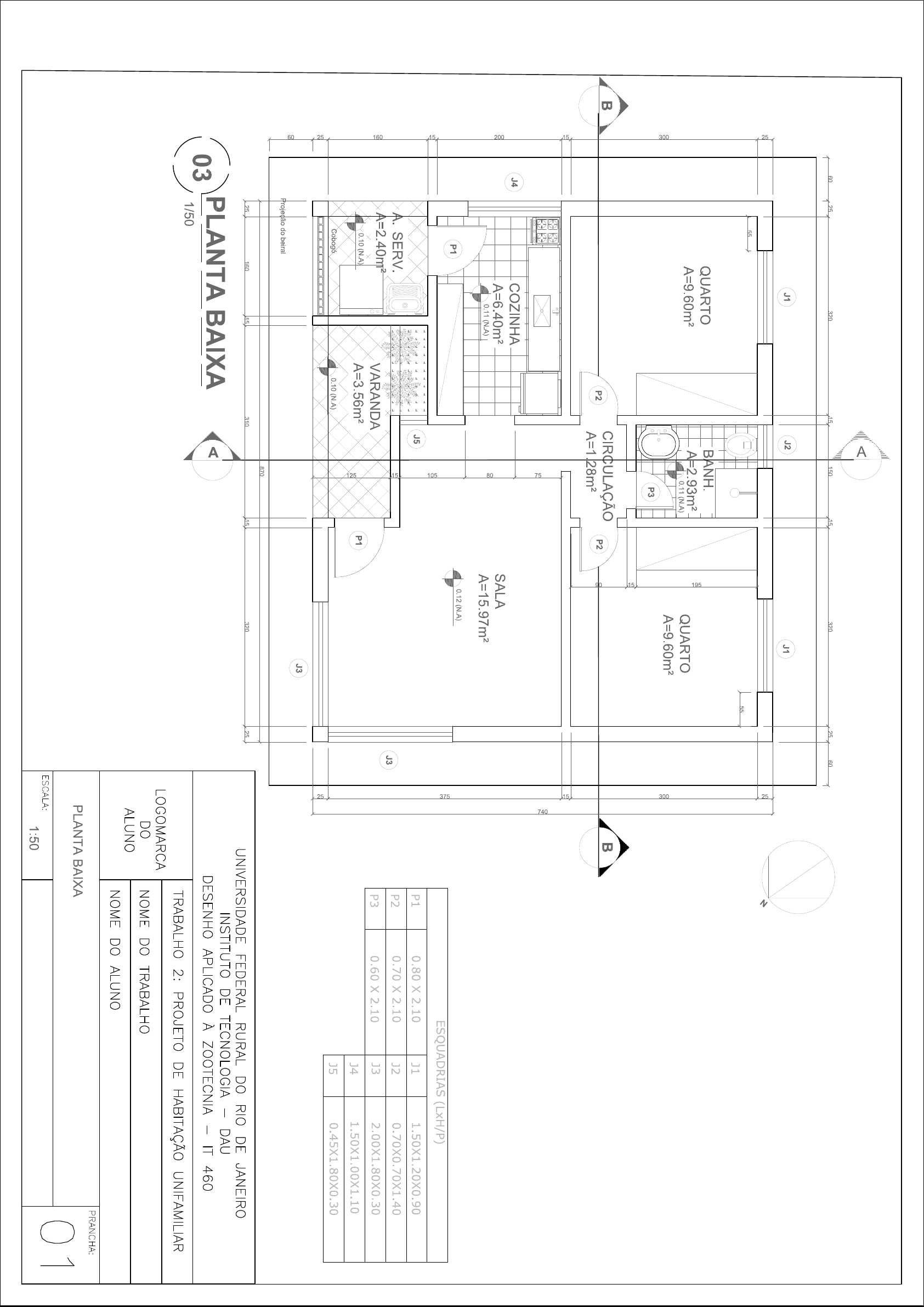 A 60 25 320 15 150 320 25 60 J1 J2 J1 25 25 55 55 QUARTO BANH. 195 0.11 (N.A) QUARTO 300 300 0 P3 B CIRCULAÇÃO P2 P2 00 740 75 J4 COZINHA 200 SALA 80 0.11(N.A) A=15.97m² 0.12(N.A) P1 375 ESQUADRIAS (LxH/P) 105 X J5 P1 0.80 X 2.10 J1 1.50X1.20X0.90 SERV. 15 P2 0.70 X 2.10 J2 0.70X0.70X1.40 J3 160 VARANDA P3 0.60 X 2.10 J3 2.00X1.80X0.30 X X P1 25 J4 1.50X1.00X1.10 0.10(N.A) J5 0.45X1.80X0.30 25 25 J3 60 Projeção do beiral 870 25 160 310 320 25 UNIVERSIDADE FEDERAL RURAL DO RIO DE JANEIRO INSTITUTO DE TECNOLOGIA DAU PLANTA BAIXA A 03 DESENHO APLICADO À ZOOTECNIA - IT 460 1/50 TRABALHO 2: PROJETO DE HABITAÇÃO UNIFAMILIAR LOGOMARCA DO NOME DO TRABALHO ALUNO NOME DO ALUNO PRANCHA: PLANTA BAIXA ESCALA: 1:50