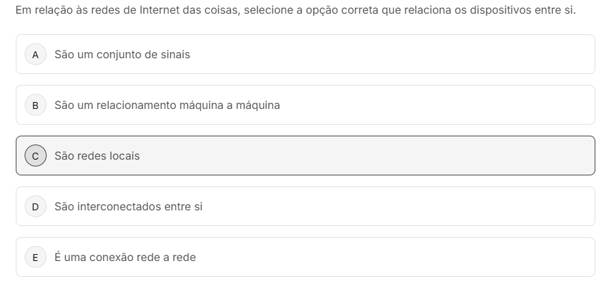Em relação às redes de Internet das coisas, selecione a opção correta que relaciona dispositivos entre si. A São um conjunto de sinais B São um relacionamento máquina a máquina C São redes locais D São interconectados entre si E É uma conexão rede a rede