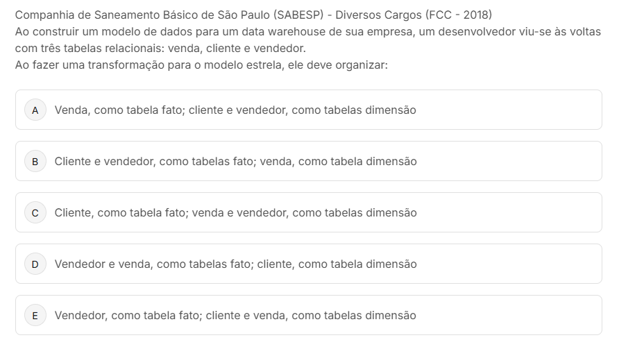 Companhia de Saneamento Básico de São Paulo (SABESP) Diversos Cargos (FCC 2018) Ao construir um modelo de dados para um data warehouse de sua empresa, um desenvolvedor viu-se às voltas com três tabelas relacionais: venda, cliente e vendedor. Ao fazer uma transformação para O modelo estrela, ele deve organizar: A Venda, como tabela fato; cliente e vendedor, como tabelas dimensão B Cliente e vendedor, como tabelas fato; venda, como tabela dimensão C Cliente, como tabela fato; venda e vendedor, como tabelas dimensão D Vendedor e venda, como tabelas fato; cliente, como tabela dimensão E Vendedor, como tabela fato; cliente e venda, como tabelas dimensão