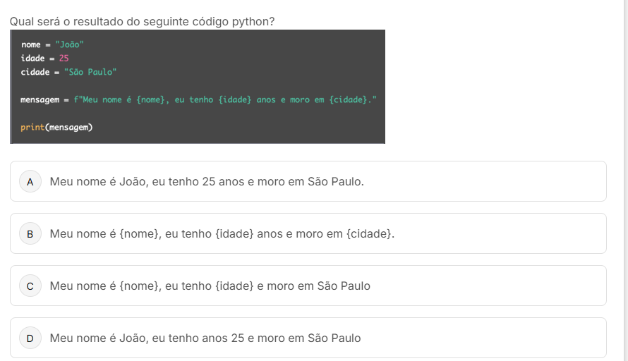 Qual será O resultado do seguinte código python? nome - "João" idade 25 cidade - "São Paulo" mensagem - f"Meu nome é {nome}, eu tenho {idade} anos e moro em {cidade}." print (mensagem) A Meu nome é João, eu tenho 25 anos e moro em São Paulo. B Meu nome é {nome}, eu tenho {idade} anos e moro em {cidade}. C Meu nome é {nome}, eu tenho {idade} e moro em São Paulo D Meu nome é João, eu tenho anos 25 e moro em São Paulo
