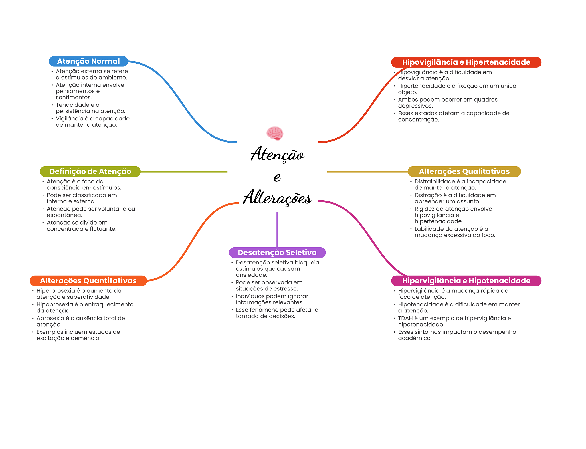 Atenção Normal Hipovigilância e Hipertenacidade Atenção externa se refere é a dificuldade em a estímulos do ambiente. desviar a atenção. Atenção interna envolve Hipertenacidade é a fixação em um único pensamentos e objeto. sentimentos. Ambos podem ocorrer em quadros Tenacidade é a depressivos. persistência na atenção. Esses estados afetam a capacidade de Vigilância é a capacidade concentração. de manter a atenção. Atenção Definição de Atenção Alterações Qualitativas e Atenção é O foco da Distraibilidade é a incapacidade consciência em estímulos. de manter a atenção. Pode ser classificada em Alterações Distração é a dificuldade em interna e externa. apreender um assunto. Atenção pode ser voluntária ou Rigidez da atenção envolve espontânea. hipovigilância e Atenção se divide em hipertenacidade. concentrada e flutuante. Labilidade da atenção é a mudança excessiva do foco. Desatenção Seletiva Desatenção seletiva bloqueia estímulos que causam ansiedade. Alterações Quantitativas Pode ser observada em Hipervigilância e Hipotenacidade Hiperprosexia é aumento da situações de estresse. Hipervigilância é a mudança rápida do atenção e superatividade. Indivíduos podem ignorar foco de atenção. Hipoprosexia é enfraquecimento informações relevantes. Hipotenacidade é a dificuldade em manter da atenção. Esse fenômeno pode afetar a a atenção. Aprosexia é a ausência total de tomada de decisões. TDAH é um exemplo de hipervigilância e atenção. hipotenacidade. Exemplos incluem estados de Esses sintomas impactam desempenho excitação e demência. acadêmico.