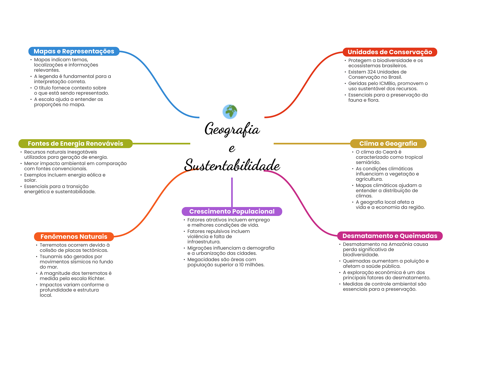 Mapas e Representações Unidades de Conservação Mapas indicam temas, Protegem a e os localizações e informações ecossistemas brasileiros. relevantes. Existem 324 Unidades de A legenda é fundamental para a Conservação no Brasil. interpretação correta. Geridas pelo ICMBio, promovem título fornece contexto sobre uso sustentável dos recursos. que está sendo representado. Essenciais para a preservação da A escala ajuda a entender as fauna e flora. proporções no mapa. Geografia Fontes de Energia Renováveis Clima e Geografia Recursos naturais inesgotáveis e clima do Ceará é utilizados para geração de energia. caracterizado como tropical Menor impacto ambiental em comparação Sustentabilidade semiárido. com fontes convencionais. As condições climáticas Exemplos incluem energia eólica e influenciam a vegetação e solar. agricultura. Essenciais para a transição Mapas climáticos ajudam a energética e sustentabilidade. entender a distribuição de climas. A geografia local afeta a vida e a economia da região. Crescimento Populacional Fatores atrativos incluem emprego e melhores condições de vida. Fatores repulsivos incluem Fenômenos Naturais violência e falta de Desmatamento e Queimadas infraestrutura. Terremotos ocorrem devido à Desmatamento na Amazônia causa colisão de placas tectônicas. Migrações influenciam a demografia perda significativa de e a urbanização das cidades. Tsunamis são gerados por biodiversidade. movimentos sísmicos no fundo Megacidades são áreas com Queimadas aumentam a poluição e do mar. população superior a 10 milhões. afetam a saúde pública. A magnitude dos terremotos é A exploração econômica é um dos medida pela escala Richter. principais fatores do desmatamento. Impactos variam conforme a Medidas de controle ambiental são profundidade e estrutura essenciais para a preservação. local.