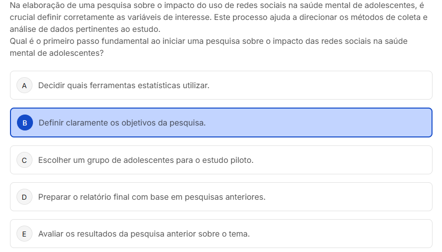 Na elaboração de uma pesquisa sobre impacto do uso de redes sociais na saúde mental de adolescentes, é crucial definir corretamente as variáveis de interesse. Este processo ajuda a direcionar métodos de coleta e análise de dados pertinentes ao estudo. Qual é O primeiro passo fundamental ao iniciar uma pesquisa sobre impacto das redes sociais na saúde mental de adolescentes? A Decidir quais ferramentas estatísticas utilizar. B Definir claramente objetivos da pesquisa. C Escolher um grupo de adolescentes para O estudo piloto. D Preparar O relatório final com base em pesquisas anteriores. E Avaliar resultados da pesquisa anterior sobre tema.
