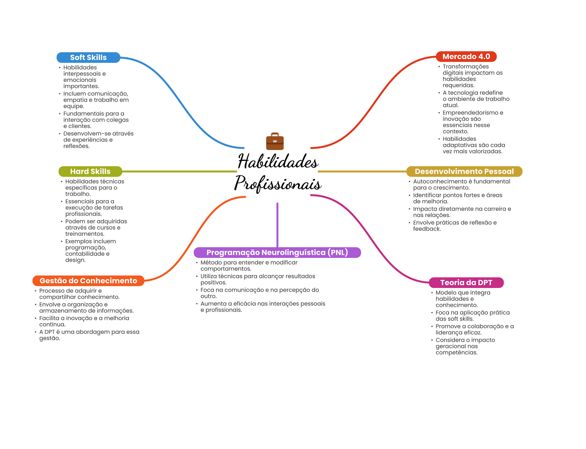 Soft Skills Mercado 4.0 Habilidades Transformações interpessoais e digitais impactam as emocionais habilidades importantes. requeridas. Incluem comunicação, A tecnologia redefine empatia e trabalho em ambiente de trabalho equipe. atual. Fundamentais para a Empreendedorismo e interação com colegas inovação são e clientes. essenciais nesse Desenvolvem-se através contexto. de experiências e Habilidades reflexões. adaptativas são cada vez mais valorizadas. Habilidades Hard Skills Desenvolvimento Pessoal Habilidades técnicas específicas para Profissionais Autoconhecimento é fundamental para crescimento. trabalho. Identificar pontos fortes e áreas Essenciais para a de melhoria. execução de tarefas Impacta diretamente na carreira e profissionais. nas relações. Podem ser adquiridas Envolve práticas de reflexão e através de cursos e feedback. treinamentos. Exemplos incluem programação, contabilidade e Programação Neurolinguística (PNL) design. Método para entender e modificar comportamentos. Utiliza técnicas para alcançar resultados Gestão do Conhecimento positivos. Teoria da DPT Processo de adquirir e Foca na comunicação e na percepção do Modelo que integra compartilhar conhecimento. outro. habilidades e Envolve a organização e Aumenta a eficácia nas interações pessoais conhecimento. armazenamento de informações. e profissionais. Foca na aplicação prática Facilita a inovação e a melhoria das soft skills. contínua. Promove a colaboração e a A DPT é uma abordagem para essa liderança eficaz. gestão. Considera impacto geracional nas competências.