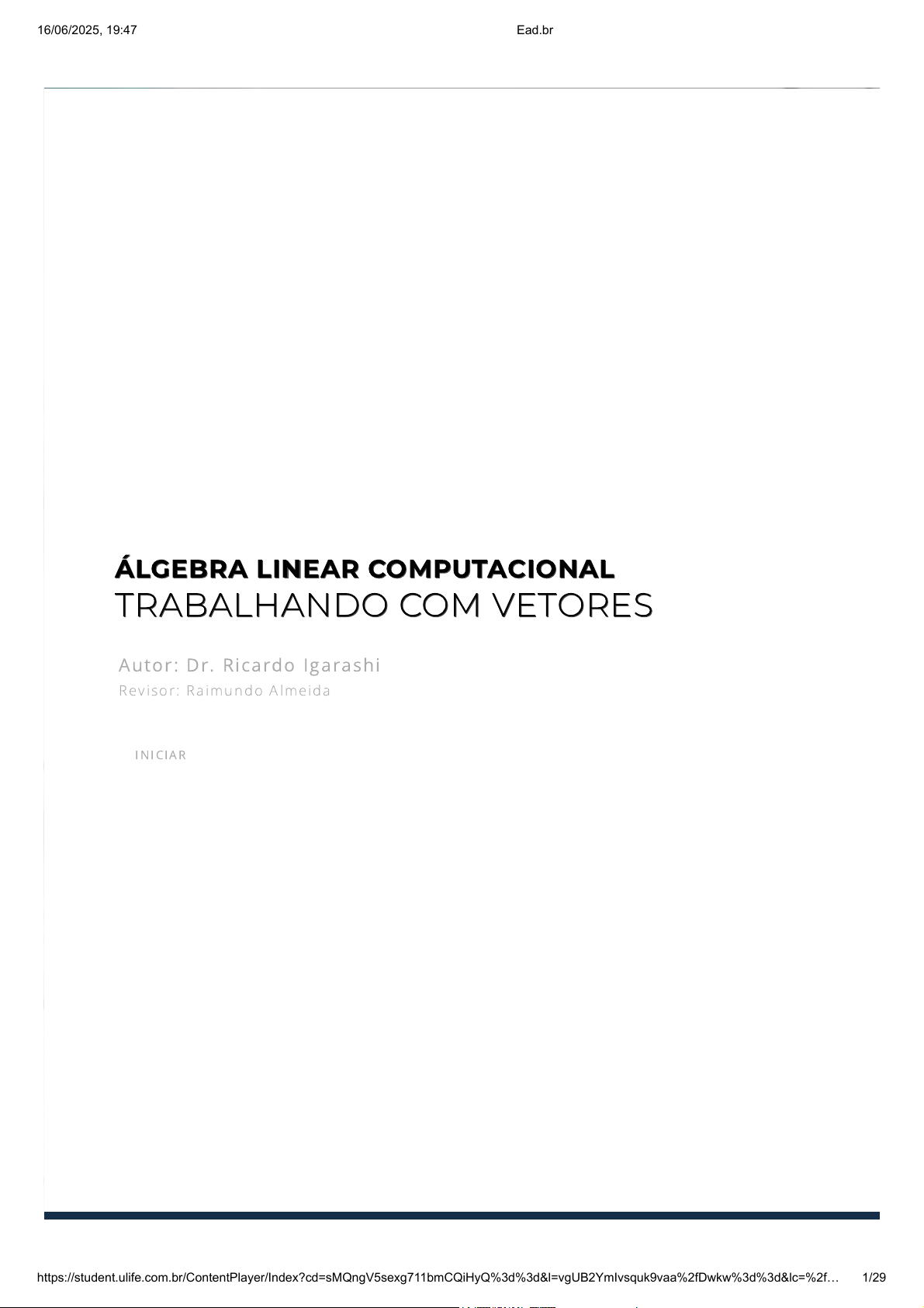 ÁLGEBRA LINEAR COMPUTACIONALÁLGEBRA LINEAR COMPUTACIONAL TRABALHANDO COM VETORESTRABALHANDO COM VETORES Autor: Dr. Ricardo Igarashi Revisor : Ra imundo A lmeida IN IC IAR 16/06/2025, 19:47 Ead.br https://student.ulife.com.br/ContentPlayer/Index?cd=sMQngV5sexg711bmCQiHyQ%3d%3d&l=vgUB2YmIvsquk9vaa%2fDwkw%3d%3d&lc=%2f… 1/29 introdução Introdução Este texto destina-se aos estudantes da disciplina de Álgebra Linear Computacional, presente nos primeiros semestres dos cursos de graduação da área de Ciências Exatas. Por isso, faremos uma explanação clara e objetiva, utilizando uma linguagem e notação matemática para um entendimento que poderá ser usado em outras disciplinas. Por exemplo, em análises de estruturas o estudante deve utilizar corretamente o conceito de análise vetorial colocando os vetores corretamente na estrutura. Esse domínio será muito importante, pois com isso você poderá usar um software para fazer a análise computacional da estrutura. 16/06/2025, 19:47 Ead.br https://student.ulife.com.br/ContentPlayer/Index?cd=sMQngV5sexg711bmCQiHyQ%3d%3d&l=vgUB2YmIvsquk9vaa%2fDwkw%3d%3d&lc=%2f… 2/29 Neste primeiro momento, estudaremos as representações dos vetores em um espaço de até 3 dimensões (tridimensional). Além disso, veremos duas representações para os vetores, a geométrica e a algébrica. Aprenderemos, também, a realizar operações básicas entre vetores e multiplicação por escalar, o processo de normalização e verificação de igualdade entre vetores. Tratamento Geométrico Vetor é um segmento de reta orientado que apresenta módulo (tamanho), direção e sentido. Os vetores são usados para expressar grandezas físicas vetoriais, isto é, aquelas que são definidas pelo seu valor numérico, sua direção (horizontal e vertical), e também pelo seu sentido (para cima ou para baixo). Figura 1.1 - Segmento orientado AB Fonte: Elaborada pelo autor. A representação gráfica de um vetor é dada por uma seta, e possui em suas extremidades dois pontos que o determinam (WINTERLE, 2000). Intuitivamente, seta é um segmento no qual se fixou uma orientação. E fixar uma orientação é escolher um sentido. No caso da Figura 1.1, o segmento orientado representado tem orientação de A para B. VetoresVetores 16/06/2025, 19:47 Ead.br https://student.ulife.com.br/ContentPlayer/Index?cd=sMQngV5sexg711bmCQiHyQ%3d%3d&l=vgUB2YmIvsquk9vaa%2fDwkw%3d%3d&lc=%2f… 3/29 As notações matemáticas para um vetor podem ser as mais diversas, dependendo do autor, as mais usuais são , os dois pontos que deram origem ao vetor seguido de uma flecha sobre eles , uma letra minúscula seguida de uma flecha , uma letra minúscula em negrito . Para fins de padronização, utilizaremos como representação de um vetor. O módulo de um vetor é o comprimento dele, por exemplo, na figura 1.3 a seguir temos um vetor com origem em (1,2) e final em (4,2). O módulo será a distância do ponto de origem até o ponto de destino. Verificamos pela figura 1.3 que o comprimento do vetor é 3. A direção é o sentido que representamos quando desenhamos o vetor em um plano cartesiano. Observamos pela figura 1.3 que o vetor possui direção horizontal e sentido da esquerda para direita. AB AB −→− v ⃗ v v Figura 1.2 - Segmento orientado AB foi rotulado como vetor Fonte: Elaborada pelo autor. v v v 16/06/2025, 19:47 Ead.br https://student.ulife.com.br/ContentPlayer/Index?cd=sMQngV5sexg711bmCQiHyQ%3d%3d&l=vgUB2YmIvsquk9vaa%2fDwkw%3d%3d&lc=%2f… 4/29 O vetor que possui sua origem coincidindo com a sua extremidade é chamado vetor nulo denotado por 0 . Note que o vetor nulo é apenas um ponto no espaço. Exemplo 1: Dados dois vetores AB e CD , dizemos que AB é equivalente a CD se B-A=D-C. Para verificarmos essa situação considere os seguintes pontos no plano: a) Então, AD é equivalente a CB , pois b) c) Contudo, podemos verificar que o vetor FE , não é equivalente a AD e CB . Os vetores AD , CB e FE são representados na figura 1.4. Figura 1.3 - Vetor v com origem em (1,2) e final (4,2). O módulo do vetor é de 3 unidades com direção horizontal para direita. Fonte: Elaborada pelo autor. A = (0, 0) , B = (2, 3) , C = (1, 2) , D = (1, 1) , E = (1, 0) , F = (−1, −1) . D − A = (1, 1) − (0, 0) = (1, 1) B − C = (2, 3) − (1, 2) = (1, 1) . E − F = (1, 0) − (−1, −1) = (2, 1) , 16/06/2025, 19:47 Ead.br https://student.ulife.com.br/ContentPlayer/Index?cd=sMQngV5sexg711bmCQiHyQ%3d%3d&l=vgUB2YmIvsquk9vaa%2fDwkw%3d%3d&lc=%2f… 5/29 Observação: A equivalência de vetores é análoga ao que ocorre com os números racionais e as frações. Duas frações representam o mesmo número racional se o numerador e o denominador de cada uma delas estiverem na mesma proporção. Por exemplo, ½ é equivalente a 2/4 e 3/6, e representam o mesmo número racional. Operações com Vetores Nesta seção iremos apresentar as seguintes operações vetoriais: Adição de vetores e produto de um escalar por um vetor. Adição de Vetores Consideremos os vetores e , cuja soma pretendemos encontrar. Para isso, tomemos um ponto A qualquer e, com origem nele, tracemos o segmento orientado AB representante do vetor . A partir de A, tracemos o segmento orientado AC representante de . O vetor representado pelo segmento orientado de origem A e extremidade D é, por definição, o vetor soma de por . Essa regra é conhecida como regra do Paralelogramo. Figura 1.4 - Representação no plano dos vetores AD, CB e EF Fonte: Elaborada pelo autor. u v u + v u v u v 16/06/2025, 19:47 Ead.br https://student.ulife.com.br/ContentPlayer/Index?cd=sMQngV5sexg711bmCQiHyQ%3d%3d&l=vgUB2YmIvsquk9vaa%2fDwkw%3d%3d&lc=%2f… 6/29 Observe que a soma está na diagonal do paralelogramo determinado por e , quando estão representados com a mesma origem. Sendo e vetores quaisquer, a adição admite as seguintes propriedades: i) Comutativa: ii) Associativa: iii) Elemento neutro: iv) Elemento oposto: O vetor , escreve-