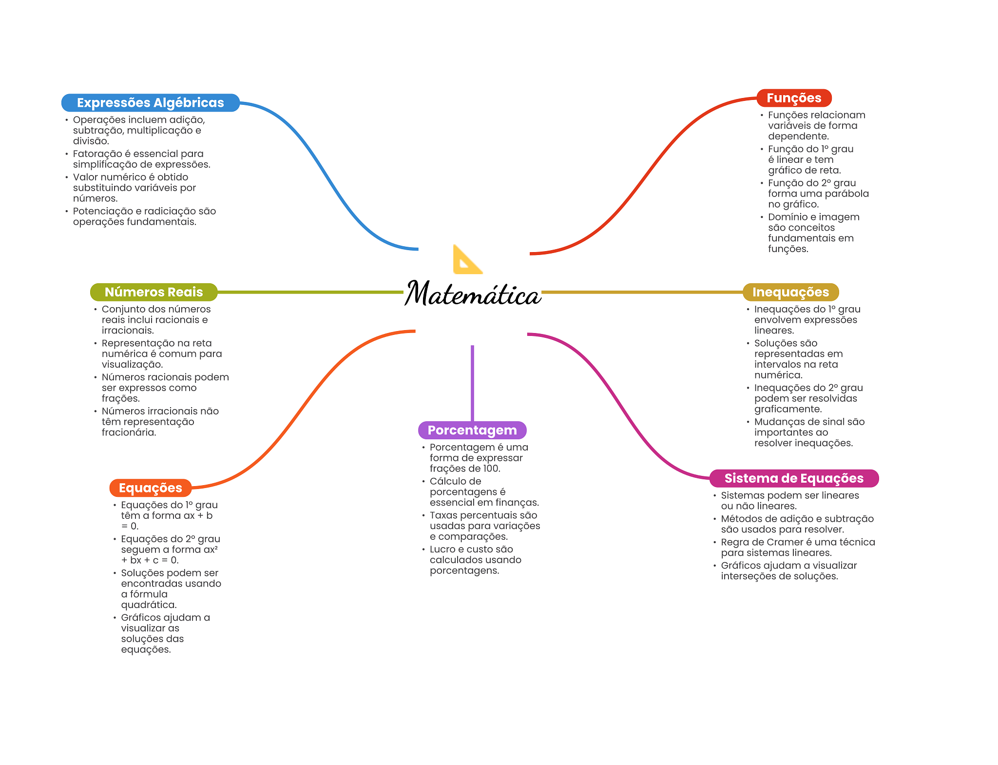 Expressões Algébricas Funções Operações incluem adição, Funções relacionam variáveis de forma subtração, multiplicação e divisão. dependente. Fatoração é essencial para Função do 1° grau é linear e tem simplificação de expressões. gráfico de reta. Valor numérico é obtido substituindo variáveis por Função do 2° grau números. forma uma parábola no gráfico. Potenciação e radiciação são operações fundamentais. Domínio e imagem são conceitos fundamentais em funções. Números Reais Matemática Inequações Conjunto dos números Inequações do 1° grau reais inclui racionais e envolvem expressões irracionais. lineares. Representação na reta Soluções são numérica é comum para representadas em visualização. intervalos na reta Números racionais podem numérica. ser expressos como Inequações do 2° grau frações. podem ser resolvidas Números irracionais não graficamente. têm representação Mudanças de sinal são fracionária. Porcentagem importantes ao Porcentagem é uma resolver inequações. forma de expressar frações de 100. Cálculo de Sistema de Equações Equações porcentagens é Sistemas podem ser lineares Equações do grau essencial em finanças. ou não lineares. têm a forma + b Taxas percentuais são Métodos de adição e subtração = 0. usadas para variações são usados para resolver. Equações do 2° grau e comparações. Regra de Cramer é uma técnica seguem a forma Lucro e custo são para sistemas lineares. + bx + C = 0. calculados usando Soluções podem ser porcentagens. Gráficos ajudam a visualizar interseções de soluções. encontradas usando a fórmula quadrática. Gráficos ajudam a visualizar as soluções das equações.
