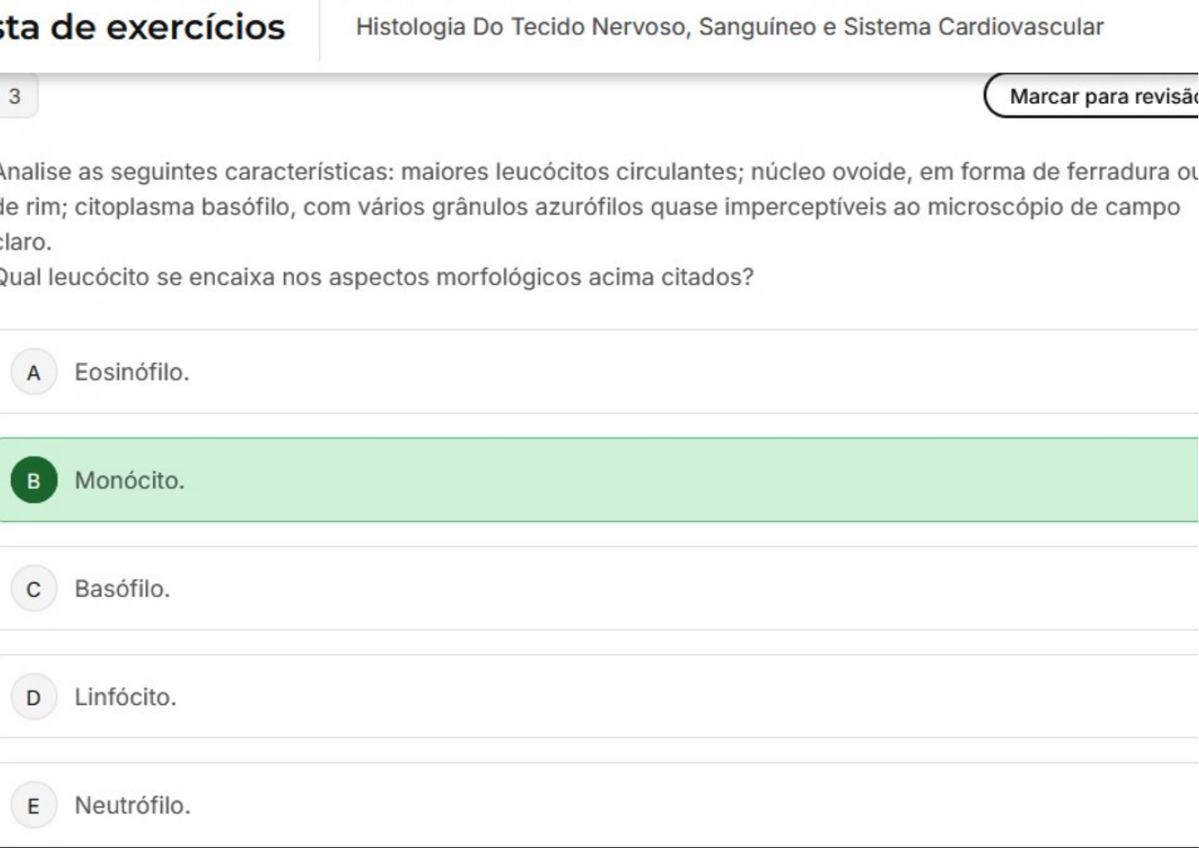 de exercícios Histologia Do Tecido Nervoso, Sanguíneo e Sistema Cardiovascular 3 Marcar para revisão Analise as seguintes características: maiores leucócitos circulantes; núcleo ovoide, em forma de ferradura ou rim; citoplasma basófilo, com vários grânulos azurófilos quase ao microscópio de campo Qual leucócito se encaixa nos aspectos morfológicos acima citados? A Eosinófilo. Monócito. C Basófilo. D Linfócito. ELista de exercícios Histologia Do Tecido Nervoso, Sanguíneo e Sistema Cardiovascular 4 Marcar para revisão No sistema nervoso central, as células da glia possuem diferentes funções. Sobre elas, marque a alternativa correta: A micróglia é responsável por formar uma rede de proteção dos neurônios e pela produção do líquido A cerebrospinal. Os oligodendrócitos ajudam a manter as condições ideais para a produção dos impulsos nervosos e para a nutrição dos neurônios. As células ependimárias são responsáveis pela produção do estrato mielínico dos axônios. D A micróglia é ativada durante eventos inflamatórios no sistema nervoso central. E Os astrócitos atuam diretamente na nutrição e no amortecimento do sistema nervoso central.Passei Direto estacio.saladeavaliacoes.com.br X + i! estacio.saladeavaliacoes.com.br/exercicio/69375b67c809de6e107991f1/gabarito/ CAIXA TEM Erros Turmas Lasy Al - Crie Apps Co... de exercícios Histologia Do Tecido Nervoso, Sanguíneo e Sistema Cardiovascular T S Marcar para revisão Questão 5 de 10 nome do menor e principal constituinte proteico do plasma, responsável por exercer gradiente de entração entre sangue e o líquido extracelular tecidual? 1 2 3 4 Imunoglobulina. 6 7 8 9 Corretas (10) Lipoproteína. Em branco (0) Albumina. Fibrinogênio. Hemoglobina. Ativar Windows Acesse Configurações para ativa Resposta correta 24°C Pred. nublado PTLista de exercícios Histologia Do Tecido Nervoso, Sanguíneo e Sistema Cardiovascular Os leucócitos podem ser classificados em agranulócitos e granulócitos. Qual o nome do granulócito mostrad abaixo, que representa os leucócitos mais abundantes e atua na digestão e morte de microrganismos? A Basófilo. Mastócito. Linfócito. D Eosinófilo. E Neutrófilo.Lista de exercícios Histologia Do Tecido Nervoso, Sanguíneo e Sistema Cardiovascular sistema linfático é uma parte essencial do sistema imunológico do corpo, trabalhando para proteger contra infecções e doenças. Consiste em uma rede complexa de vasos linfáticos, gânglios linfáticos, baço, timo e tecidos linfoides, como as amígdalas e a medula óssea. Sobre as características do sistema vascular linfático analise as afirmativas abaixo. I - Os vasos linfáticos são semelhantes às artérias, exceto pelas paredes mais grossas e pela diferenciação clara em túnicas. - Os capilares linfáticos possuem maior permeabilidade que os capilares sanguíneos. III - Ausência de bomba central. Marque a alternativa que apresenta a(s) afirmativa(s) correta(s). A Apenas as afirmativas e III estão corretas. Apenas as afirmativas I e III estão corretas. Apenas as afirmativas I e estão corretas. D Apenas a afirmativa I está correta.Lista de exercícios Histologia Do Tecido Nervoso, Sanguíneo e Sistema Cardiovascular 8 Marcar para revisã Quando sangue é removido da circulação, ele coagula imediatamente. Sobre esse assunto, analise as afirmativas a seguir: I. plasma sem os fatores de coagulação é denominado soro. II. coágulo consiste em uma rede de fibrina em volta de um aglomerado de plaquetas e hemácias. III. soro sem os fatores de coagulação é denominado plasma. É correto que se afirma em A C III D e II.EM Erros ... Turmas Lasy Al - Crie Apps Co... xercícios Histologia Do Tecido Nervoso, Sanguíneo e Sistema Cardiovascular T Marcar para revisão de morfologia estrelada, com múltiplas projeções, que conectam os neurônios aos capilares Questão à pia-máter. Essas são características de quais células da glia? 1 óglia. 6 Corretas ócitos. Em odendrócitos. las ependimárias. de Schwann. Ativar Acesse sposta corretaLista de exercícios Histologia Do Tecido Nervoso, Sanguíneo e Sistema Cardiovascular A contaminação por metais pesados, como o mercúrio, pode causar sérios danos ao sistema nervoso, interferindo na comunicação entre as células neurais. 0 mercúrio compromete a integridade dos neurônios afetando tanto sua sobrevivência quanto o processamento dos impulsos nervosos. Para entender como es toxicidade influencia a função neural, é importante relembrar caminho que impulso nervoso percorre de de um neurônio. Assinale a alternativa que apresenta corretamente a sequência de estruturas por onde o impulso nervoso p dentro de um único neurônio. A Corpo celular axônio dendritos. Dendritos axônio corpo celular. C Axônio dendritos corpo celular. D Dendritos corpo celular axônio.de exercícios Histologia Do Tecido Nervoso, Sanguíneo e Sistema Cardiovascular 1 Marcar para revisão sistema vascular sanguíneo é um sistema fechado formado pelo coração e pelos vasos sanguíneos, e é po meio desse sistema que o sangue circula continuamente. Em relação ao plano estrutural dos vasos sanguíne analise as afirmativas a seguir: I. As células musculares lisas são encontradas na túnica média de todos os vasos sanguíneos, em camadas helicoidais. II. As fibras colágenas são abundantes na parede do sistema vascular, encontradas entre as células musculares, na camada e na camada subepitelial de alguns vasos. III. De maneira geral, os vasos sanguíneos são compostos por três camadas ou túnicas: a íntima, a média e a adventícia. IV. Os componentes do tecido conjuntivo são encontrados em proporções e quantidades variáveis, de acordo com as necessidades funcionais dos vasos É correto que se afirma em A I, e III. I, e IV.e III. e IV. e IV. II. Resposta correta Parabéns, você selecionou a alternativa correta. Confira gabarito comentado!de exercícios Histologia Do