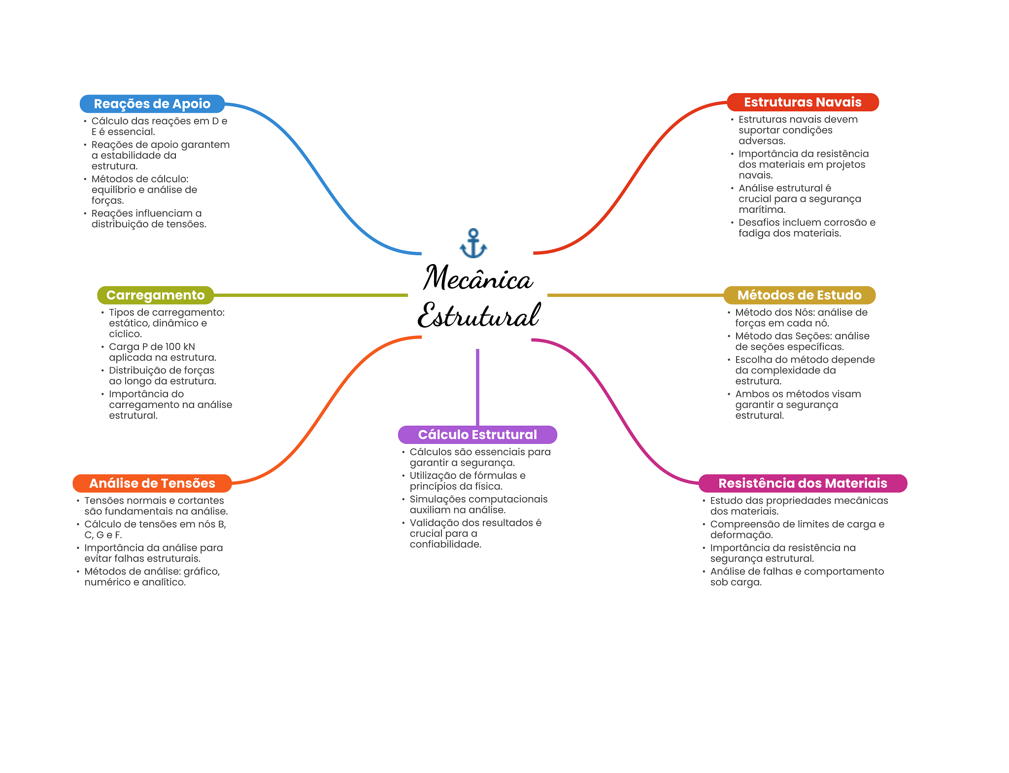 Reações de Apoio Estruturas Navais Cálculo das reações em De Estruturas navais devem E é essencial. suportar condições Reações de apoio garantem adversas. a estabilidade da Importância da resistência estrutura. dos materiais em projetos Métodos de cálculo: navais. equilíbrio e análise de Análise estrutural é forças. crucial para a segurança Reações influenciam a marítima. distribuição de tensões. Desafios incluem corrosão e fadiga dos materiais. Mecânica Carregamento Métodos de Estudo Tipos de carregamento: Estrutural Método dos Nós: análise de estático, dinâmico e forças em cada nó. cíclico. Método das Seções: análise Carga P de 100 de seções específicas. aplicada na estrutura. Escolha do método depende Distribuição de forças da complexidade da ao longo da estrutura. estrutura. Importância do Ambos métodos visam carregamento na análise garantir a segurança estrutural. estrutural. Cálculo Estrutural Cálculos são essenciais para garantir a segurança. Utilização de fórmulas e Análise de Tensões princípios da física. Resistência dos Materiais Tensões normais e cortantes Simulações computacionais Estudo das propriedades mecânicas são fundamentais na análise. auxiliam na análise. dos materiais. Cálculo de tensões em nós B, Validação dos resultados é Compreensão de limites de carga e crucial para a deformação. Importância da análise para confiabilidade. Importância da resistência na evitar falhas estruturais. segurança estrutural. Métodos de análise: gráfico, Análise de falhas e comportamento numérico e analítico. sob carga.