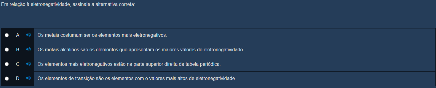 Em relação à eletronegatividade, assinale a alternativa correta: A Os metais costumam ser elementos mais eletronegativos. B Os metais alcalinos são elementos que apresentam os maiores valores de eletronegatividade. C Os elementos mais eletronegativos estão na parte superior direita da tabela periódica. D Os elementos de transição são elementos com valores mais altos de eletronegatividade.