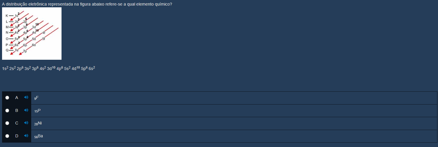 A distribuição eletronica representada na figura abaixo refere-se a qual elemento quimico? 2 K 2 L 2s 2p 2 M 3p 3d 2 6 N 45 4p 4d 2 O 5p 5d 5f 2 P 6p 6d Q 7p 1s2 2s2 2p6 3s2 3p6 4s2 4p6 5s2 6s2 A 9F B 15P C 28Ni