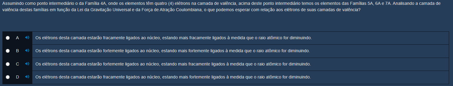 Assumindo como ponto intermediário 0 da Família 4A, onde OS elementos têm quatro (4) elétrons na camada de valência, acima deste ponto intermediário temos elementos das Famílias 5A, 6A e 7A. Analisando a camada de valência destas famílias em função da Lei da Gravitação Universal e da Força de Atração Coulombiana, que podemos esperar com relação aos elétrons de suas camadas de valência? A Os elétrons desta camada estarão fracamente ligados ao núcleo, estando mais fracamente ligados à medida que raio atômico for diminuindo. B Os elétrons desta camada estarão fortemente ligados ao núcleo, estando mais fortemente ligados à medida que 0 raio atômico for diminuindo. C Os elétrons desta camada estarão fortemente ligados ao núcleo, estando mais fracamente ligados à medida que O raio atômico for diminuindo. D Os elétrons desta camada estarão fracamente ligados ao núcleo, estando mais fortemente ligados à medida que raio atômico for diminuindo.