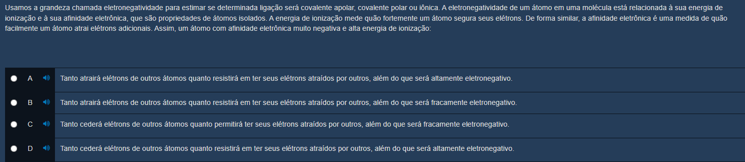 Usamos a grandeza chamada eletronegatividade para estimar se determinada ligação será covalente apolar, covalente polar ou iônica. A eletronegatividade de um em uma molécula está relacionada à sua energia de ionização e à sua afinidade eletrônica, que são propriedades de átomos isolados. A energia de ionização mede quão fortemente um átomo segura seus elétrons. De forma similar, a afinidade eletrônica é uma medida de quão facilmente um átomo atrai elétrons adicionais. Assim, um átomo com afinidade eletrônica muito negativa e alta energia de ionização: A Tanto atrairá elétrons de outros átomos quanto resistirá em ter seus elétrons atraídos por outros, além do que será altamente eletronegativo. B Tanto atrairá elétrons de outros átomos quanto resistirá em ter seus elétrons atraídos por outros, além do que será fracamente eletronegativo. C Tanto cederá elétrons de outros átomos quanto permitirá ter seus elétrons atraídos por outros, além do que será fracamente eletronegativo. D Tanto cederá elétrons de outros átomos quanto resistirá em ter seus elétrons atraídos por outros, além do que será altamente eletronegativo.