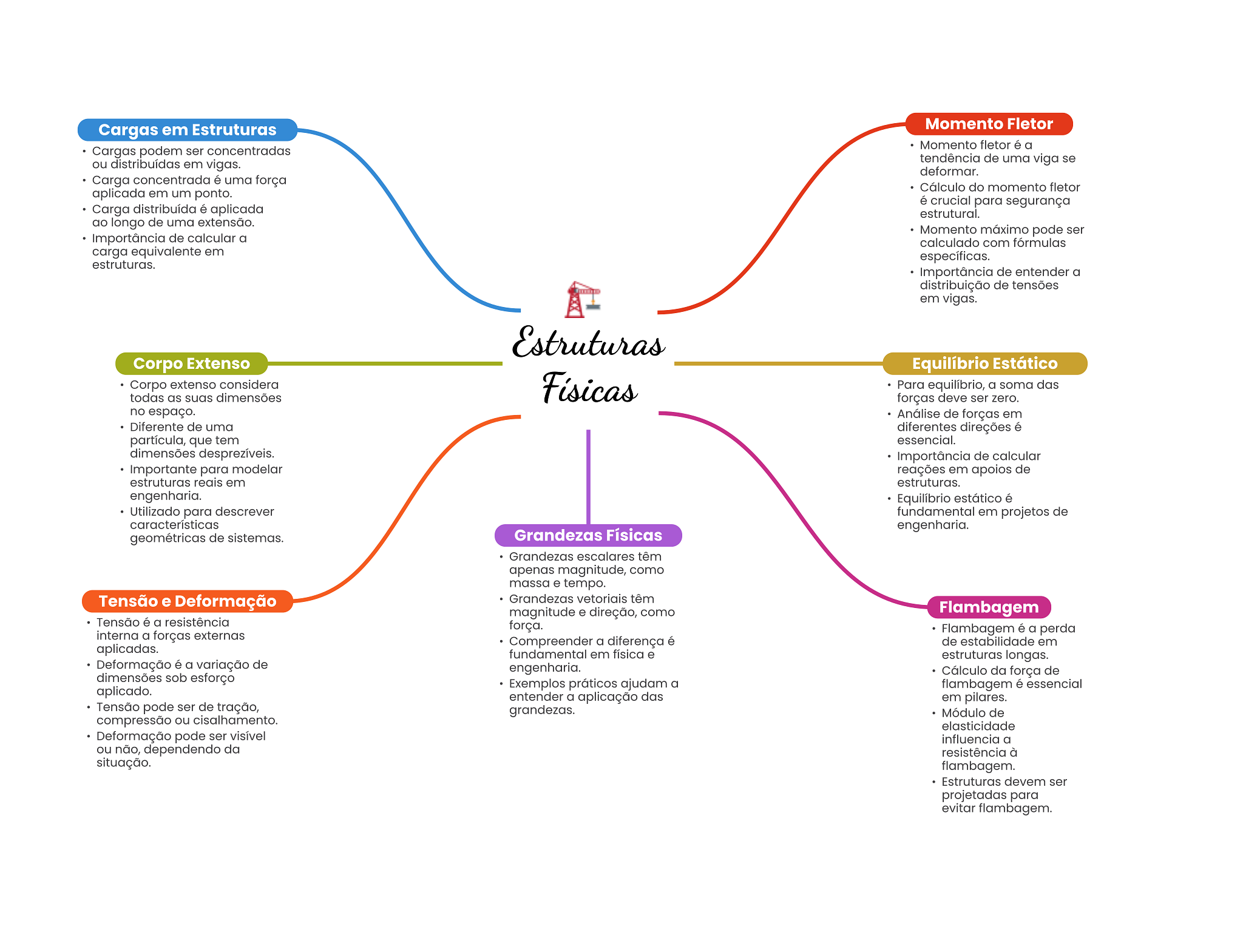 Cargas em Estruturas Momento Fletor Momento fletor é a Cargas podem ser concentradas ou distribuídas em vigas. tendência de uma viga se deformar. Carga concentrada é uma força Cálculo do momento fletor aplicada em um ponto. é crucial para segurança Carga distribuída é aplicada estrutural. ao longo de uma extensão. Momento máximo pode ser Importância de calcular a calculado com fórmulas carga equivalente em específicas. estruturas. Importância de entender a de tensões em vigas. Estruturas Corpo Extenso Equilíbrio Estático Corpo extenso considera Para equilíbrio, a soma das todas as suas dimensões forças deve ser zero. no espaço. Análise de forças em Diferente de uma diferentes direções é partícula, que tem essencial. dimensões desprezíveis. Importância de calcular Importante para modelar reações em apoios de estruturas reais em estruturas. engenharia. Equilíbrio estático é Utilizado para descrever fundamental em projetos de características engenharia. geométricas de sistemas. Grandezas Físicas Grandezas escalares têm apenas magnitude, como massa e tempo. Tensão e Deformação Grandezas vetoriais têm magnitude e direção, como Flambagem Tensão é a resistência força. interna a forças externas Flambagem é a perda Compreender a diferença é de estabilidade em aplicadas. fundamental em física e estruturas longas. Deformação é a variação de engenharia. Cálculo da força de dimensões sob esforço Exemplos práticos ajudam a flambagem é essencial aplicado. entender a aplicação das em pilares. Tensão pode ser de tração, grandezas. Módulo de compressão ou cisalhamento. elasticidade Deformação pode ser visível influencia a ou não, dependendo da resistência à situação. flambagem. Estruturas devem ser projetadas para evitar flambagem.