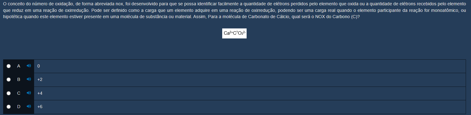 O conceito do número de oxidação, de forma abreviada nox, foi desenvolvido para que se possa identificar facilmente a quantidade de elétrons perdidos pelo elemento que oxida ou a quantidade de elétrons recebidos que reduz em uma reação de oxirredução. Pode ser definido como a carga que um elemento adquire em uma reação de oxirredução, podendo ser uma carga real quando 0 elemento participante da reação for mor hipotética quando este elemento estiver presente em uma molécula de substância ou material. Assim, Para a molécula de Carbonato de Cálcio, qual será 0 NOX do Carbono (C)? A 0 B +2 C +4