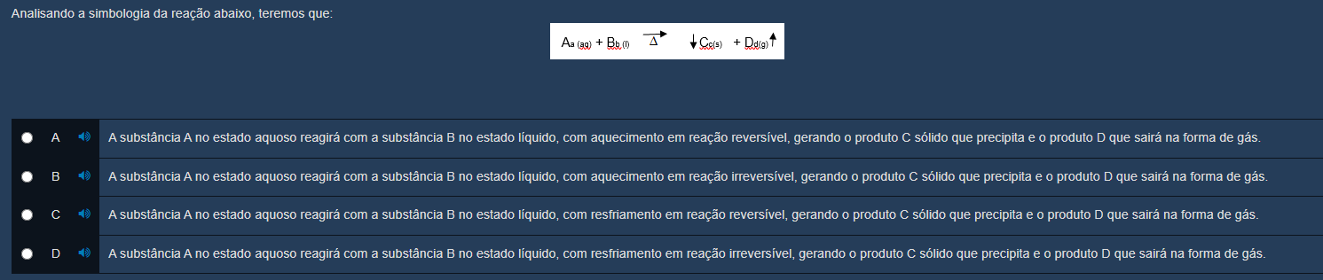 Analisando a simbologia da reação abaixo, teremos que: (ag) + + A A substância A no estado aquoso reagirá com a substância B no estado líquido, com aquecimento em reação reversível, gerando 0 produto C sólido que precipita e 0 produto D que sairá na forma de gás. B A substância A no estado aquoso reagirá com a substância B no estado líquido, com aquecimento em reação irreversível, gerando 0 produto C sólido que precipita e 0 produto D que sairá na forma de C A substância A no estado aquoso reagirá com a substância B no estado líquido, com resfriamento em reação reversível, gerando produto C sólido que precipita produto D que sairá na forma de gás. D A substância A no estado aquoso reagirá com a substância B no estado líquido, com resfriamento em reação irreversível, gerando produto C sólido que precipita e produto D que sairá na forma de