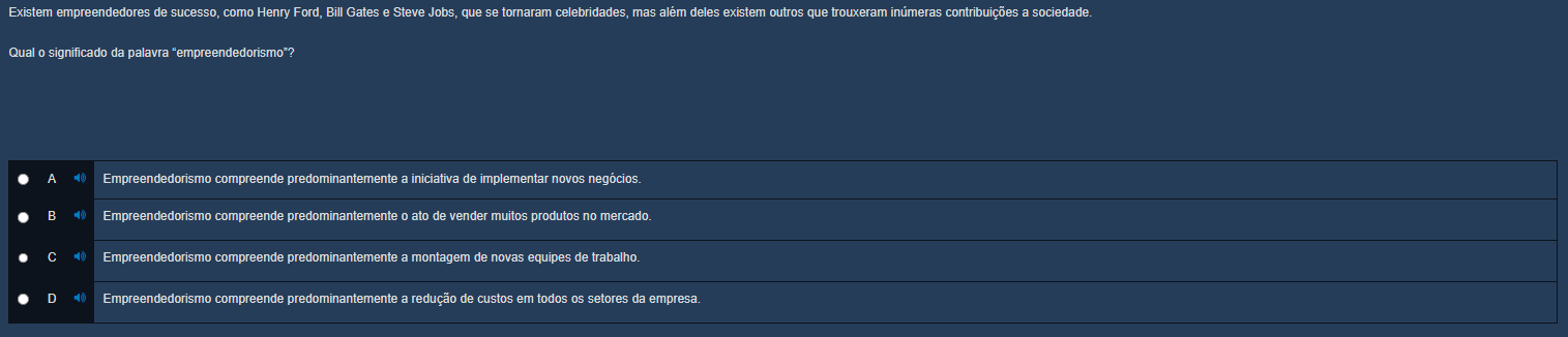 Existem empreendedores de sucesso, como Henry Ford, Bill Gates e Steve Jobs, que se tornaram celebridades, mas além deles existem outros que trouxeram inúmeras contribuições a sociedade. Qual 0 significado da palavra "empreendedorismo"? A Empreendedorismo compreende predominantemente a iniciativa de implementar novos negócios. B Empreendedorismo compreende predominantemente 0 ato de vender muitos produtos no mercado. C Empreendedorismo compreende predominantemente a montagem de novas equipes de trabalho. D Empreendedorismo compreende predominantemente a redução de custos em todos OS setores da empresa.